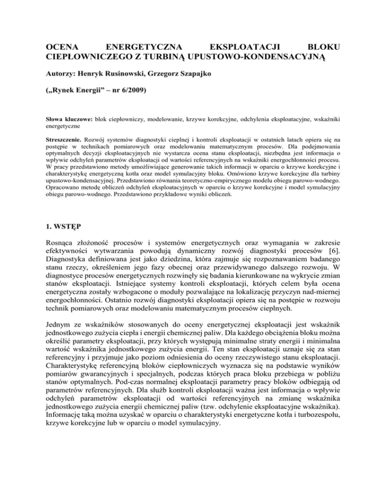 OCENA ENERGETYCZNA EKSPLOATACJI BLOKU CIEPŁOWNICZEGO Z TURBINĄ UPUSTOWO-KONDENSACYJNĄ Autorzy: Henryk Rusinowski, Grzegorz Szapajko („Rynek Energii” – nr 6/2009) Słowa kluczowe: blok ciepłowniczy, modelowanie, krzywe korekcyjne, odchylenia eksploatacyjne, wskaźniki energetyczne Streszczenie. Rozwój systemów diagnostyki cieplnej i kontroli eksploatacji w ostatnich latach opiera się na postępie w technikach pomiarowych oraz modelowaniu matematycznym procesów. Dla podejmowania optymalnych decyzji eksploatacyjnych nie wystarcza ocena stanu eksploatacji, niezbędna jest informacja o wpływie odchyleń parametrów eksploatacji od wartości referencyjnych na wskaźniki energochłonności procesu. W pracy przedstawiono metody umożliwiające generowanie takich informacji w oparciu o krzywe korekcyjne i charakterystykę energetyczną kotła oraz model symulacyjny bloku. Omówiono krzywe korekcyjne dla turbiny upustowo-kondensacyjnej. Przedstawiono równania teoretyczno-empirycznego modelu obiegu parowo-wodnego. Opracowano metodę obliczeń odchyleń eksploatacyjnych w oparciu o krzywe korekcyjne i model symulacyjny obiegu parowo-wodnego. Przedstawiono przykładowe wyniki obliczeń. 1. WSTĘP Rosnąca złożoność procesów i systemów energetycznych oraz wymagania w zakresie efektywności wytwarzania powodują dynamiczny rozwój diagnostyki procesów [6]. Diagnostyka definiowana jest jako dziedzina, która zajmuje się rozpoznawaniem badanego stanu rzeczy, określeniem jego fazy obecnej oraz przewidywanego dalszego rozwoju. W diagnostyce procesów energetycznych rozwinęły się badania kierunkowane na wykrycie zmian stanów eksploatacji. Istniejące systemy kontroli eksploatacji, których celem była ocena energetyczna zostały wzbogacone o moduły pozwalające na lokalizację przyczyn nad-miernej energochłonności. Ostatnio rozwój diagnostyki eksploatacji opiera się na postępie w rozwoju technik pomiarowych oraz modelowaniu matematycznym procesów cieplnych. Jednym ze wskaźników stosowanych do oceny energetycznej eksploatacji jest wskaźnik jednostkowego zużycia ciepła i energii chemicznej paliw. Dla każdego obciążenia bloku można określić parametry eksploatacji, przy których występują minimalne straty energii i minimalna wartość wskaźnika jednostkowego zużycia energii. Ten stan eksploatacji uznaje się za stan referencyjny i przyjmuje jako poziom odniesienia do oceny rzeczywistego stanu eksploatacji. Charakterystykę referencyjną bloków ciepłowniczych wyznacza się na podstawie wyników pomiarów gwarancyjnych i specjalnych, podczas których praca bloku przebiega w pobliżu stanów optymalnych. Pod-czas normalnej eksploatacji parametry pracy bloków odbiegają od parametrów referencyjnych. Dla służb kontroli eksploatacji ważna jest informacja o wpływie odchyleń parametrów eksploatacji od wartości referencyjnych na zmianę wskaźnika jednostkowego zużycia energii chemicznej paliw (tzw. odchylenie eksploatacyjne wskaźnika). Informację taką można uzyskać w oparciu o charakterystyki energetyczne kotła i turbozespołu, krzywe korekcyjne lub w oparciu o model symulacyjny. 2. KRZYWE KOREKCYJNE Turbiny pracują w zmiennych warunkach eksploatacji. eksploata Wartości ci parametrów eksploatacji różnią się od wartości ci znamionowych. Podczas pomiarów gwarancyjnych gwarancyjnych dąży dąż się do tego, aby parametry eksploatacjii były bliskie wartościom warto ciom znamionowym dla danego obciążenia obci turbiny. Jeżeli eli rzeczywiste parametry panujące pa podczas pomiarów odbiegająą od określonych okre przez producenta turbiny to do wyznaczenia poprawek na wybrane parametry charakteryzujące charakteryzuj uzyskiwane osiągii i energochłonność energochłonno procesu wykorzystuje się krzywe korekcyjne producenta. Umożliwiają one wyznaczenie znaczenie poprawek w zależności zale ci od odchylenia wartości wartoś poszczególnych parametrów eksploatacji od wartości warto znamionowych, dla różnych obciążeń ążeń turbiny. tur Współcześniee budowane bloki ciepłownicze wyposażone wyposa są najczęściej najczęś w turbiny upustowo-kondensacyjne. cyjne. Dla takich turbin sporządzane sporz są krzywe korekcyjne korek mocy elektrycznej generatora NelG , jednostkowego zużycia ciepła qT oraz mocy wymiennika ciepłown iczego Qg. Wartości Warto eksploatacyjne tych wielkości ści korygowane są s na parametry znamionowe eksploatacji w oparciu o zależności: zale - dla mocy elektrycznej turbozespołu: turbozespo - dla jednostkowego zużycia ycia ciep ciepła w obiegu turbinowym: gdzie: KN, Kq - współczynnik korekcyjny mocy elektrycznej generatora i jednostkowego zużycia ciepła pła w obiegu turbiny, indeks pom oznacza wielkość wielko zmierzoną a sk skorygowaną. Współczynniki korekcyjne Km wyznacza się z formuły iloczynowej: gdzie: m = N, q, Kmn - współczynnik ółczynnik korekcyjny uwzględniający uwzgl cy odchylenie n-tego parametru eksploatacji od wartości ci referencyjnej (znamionowej). Krzywe korekcyjne dla poszczególnych poszczeg współczynników Km n producenci turbin dostarczają dostarczaj najczęściej w postaci wykresów. ów. Rysunki 1÷4 przedstawiają przedstawiaj przykładowo krzywe korekcyjne jednostkowego zużycia ycia ciepła i mocy elektrycznej turbiny upustowoupustowo-kondensacyjnej od ciśnienia nienia i temperatury pary dla różnych ró strumieni pary do turbiny. Większość krzywych korekcyjnych ma przebiegi zbliżone zbli one do liniowych. Duże Du odchylenia od liniowości wykazują krzywe korekcyjne ujmujące ujmuj wpływ warunków ków chłodzenia skraplacza na jednostkowe zużycie ycie ciepła i moc generatora. 3. MODEL MATEMATYCZNY BLOKU CIEPŁOWNICZEGO Na rysunku 5 przedstawiono schemat obliczeniowy obiegu parowo-wodnego bloku ciepłowniczego z turbiną upustowo-kondensacyjną. Obieg składa się z turbiny, skraplacza, wymiennika ciepłowniczego, układu wysoko- i nisk
