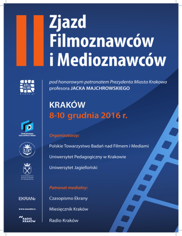 II Zjazd Filmoznawców i Medioznawców pod honorowym patronatem Prezydenta Miasta Krakowa profesora JACKA MAJCHROWSKIEGO KRAKÓW 8-10 grudnia 2016 r. Organizatorzy: Polskie Towarzystwo Badań nad Filmem i Mediami Uniwersytet Pedagogiczny w Krakowie Uniwersytet Jagielloński Patronat medialny: Czasopismo Ekrany Miesięcznik Kraków Radio Kraków