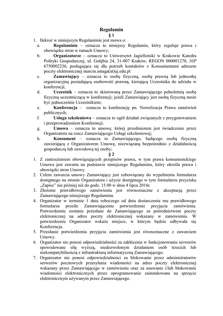 Regulamin §1 1. Ilekroć w niniejszym Regulaminie jest mowa o: a. Regulaminie – oznacza to niniejszy Regulamin, który reguluje prawa i obowiązku stron w ramach Umowy; b. Organizatorze – oznacza to Uniwersytet Jagielloński w Krakowie Katedra Polityki Gospodarczej, ul. Gołębia 24, 31-007 Kraków, REGON 000001270, NIP 6750002236, posługująca się dla potrzeb kontaktów z Konsumentami adresem poczty elektronicznej marcin.smaga(at)uj.edu.pl c. Zamawiający – oznacza to osobę fizyczną, osobę prawną lub jednostkę organizacyjną posiadającą osobowość prawną, kierującą Uczestnika do udziału w konferencji; d. Uczestnik – oznacza to skierowaną przez Zamawiającego pełnoletnią osobę fizyczną uczestniczącą w konferencji; jeżeli Zamawiający jest osobą fizyczną może być jednocześnie Uczestnikiem; e. Konferencja – oznacza to konferencję pn. Nowelizacja Prawa zamówień publicznych; f. Usługa szkoleniowa – oznacza to ogół działań związanych z przygotowaniem i przeprowadzeniem Konferencji. g. Umowa – oznacza to umowę, której przedmiotem jest świadczenie przez Organizatora na rzecz Zamawiającego Usługi szkoleniowej; h. Konsument – oznacza to Zamawiającego, będącego osobą fizyczną zawierającą z Organizatorem Umowę, niezwiązaną bezpośrednio z działalnością gospodarczą lub zawodową tej osoby; §2 1. Z zastrzeżeniem obowiązujących przepisów prawa, w tym prawa konsumenckiego Umowa jest zawarta na podstawie niniejszego Regulaminu, który określa prawa i obowiązki stron Umowy. 2. Celem zawarcia umowy Zamawiający jest zobowiązany do wypełnienia formularza dostępnego na stronie Organizatora i użycie dostępnego w tym formularzu przycisku „Zapisz” nie później niż do godz. 15.00 w dniu 4 lipca 2016r. 3. Złożenie prawidłowego zamówienia jest równoznaczne z akceptacją przez Zamawiającego niniejszego Regulaminu. 4. Organizator w terminie 1 dnia roboczego od dnia dostarczenia mu prawidłowego formularza prześle Zamawiającemu potwierdzenie przyjęcia zamówienia. Potwierdzenie zostanie przesłane do Zamawiającego za pośrednictwem poczty elektronicznej na adres poczty elektronicznej wskazany w zamówieniu. W potwierdzeniu Organizator wskaże miejsce, w którym będzie odbywała się Konferencja. 5. Przesłanie potwierdzenia przyjęcia zamówienia jest równoznaczne z zawarciem Umowy. 6. Organizator nie ponosi odpowiedzialności za zakłócenia w funkcjonowaniu serwerów spowodowane siłą wyższą, niedozwolonym działaniem osób trzecich lub niekompatybilnością z infrastrukturą informatyczną Zamawiającego. 7. Organizator nie ponosi odpowiedzialności za blokowanie przez administratorów serwerów pocztowych przesyłania wiadomości na adres poczty elektronicznej wskazany przez Zamawiającego w zamówieniu oraz za usuwanie i/lub blokowanie wiadomości elektronicznych przez oprogramowanie zainstalowane na sprzęcie elektronicznym używanym przez Zamawiającego. 1. 2. 3. 4. 5. 6. 8. W razie wątpliwości poczytuje się, że osoba, która zawiera Umowę, jest w dacie złożenia zamówienia (wypełnienia formularza) upoważniona do zawarcia umowy w imieniu Zamawiającego, w szczególności gdy osoba ta podaje dane Zamawiającego; korzysta z adresu poczty internetowej znajdującego się w domenie wykorzystywanej przez Zamawiającego itd. 9. Zamawiający zobowiązany jest poinformować kierowanego przez siebie Uczestnika i o postanowieniach Regulaminu, które bezpośrednio dotyczą Uczestnika. W przypadku zaniechania przez Zamawiającego wykonania tego zobowiązania, Organizator zwolniony jest z odpowiedzialności za jakiekolwiek roszczenia Uczestnika, zgłoszone wobec Organizatora w związku z udziałem Uczestnika w Konferencji. §3 1. Konferencja będzie odbywać się w godzinach 9:30 – 16:30 2. W trakcie Konferencji przewidziane są 2 przerwy po 15 minut oraz jedna trwająca 30 minut. 3. Organizator oświadcza, że podejmuje starania by: a. Konferencję prowadziły osoby posiadające doświadczenie, uprawnienia i kompetencje niezbędne dla przekazania Uczestnikom wiedzy dotyczącej tematyki Konferencji; b. materiały szkoleniowe było kompletne, jasne i pozbawione wad prawnych; c. Konferencja odbywała się w dogodnych warunkach lokalowych; d. świadczenia pomocnicze realizowane w trakcie Konferencji i przewidziane w programie Spotkanie, takie jak np. zapewnienie wyżywienia, napoi, materiałów biurowych, materiałów szkoleniowych, miały odpowiedni poziom. §4 Organizator zastrzega sobie prawo do odwołania Konferencji z dowolnej przyczyny nie później niż do dnia 6 lipca 2016r. Organizator zastrzega sobie prawo do zmiany terminu Konferencji z dowolnej przyczyny nie później niż do dnia 6 lipca 2016r. O odwołaniu lub zmianie terminu Konferencji Organizator powiadomi Zamawiającego przez wiadomość elektroniczną wysłaną na adres poczty elektronicznej wskazany w zamówieniu. W razie odwołania lub zmiany terminu Konferencji w sposób wskazany w ust. 1 – 3, Zamawiającemu ani Uczestnikowi nie przysługują wobec Organizatora jakiekolwiek roszczenia, z wyjątkiem roszczenia o zwrot wynagrodzenia zapłaconego przez Zamawiającego Organizatorowi. Organizator może odwołać lub zakończyć Konferencję w każdym czasie z powodu zaistnienia okoliczności stanowiących siłę wyższą. Przez siłę wyższą należy rozumieć zdarzenia o charakterze nadzwyczajnym, niemożliwe do przewidzenia i/lub zapobieżenia w chwili zawarcia Umowy, takie jak np. klęski żywiołowe, akty terrorystyczne, orzeczenia władz państwowych lub samorządowych, wojny, strajki generalne lub lokalne, awarie i katastrofy techniczne. W takim przypadku zastosowanie ma odpowiednio postanowienie ust. 3 powyżej. W uzasadnionych wypadkach Organizator zastrzega sobie prawo do dokonywania nieznacznych modyfikacji w zakresie organizacyjnym i merytorycznym. Dokonanie nieznacznych modyfikacji nie uprawnia Zamawiającego do rozwiązania Umowy