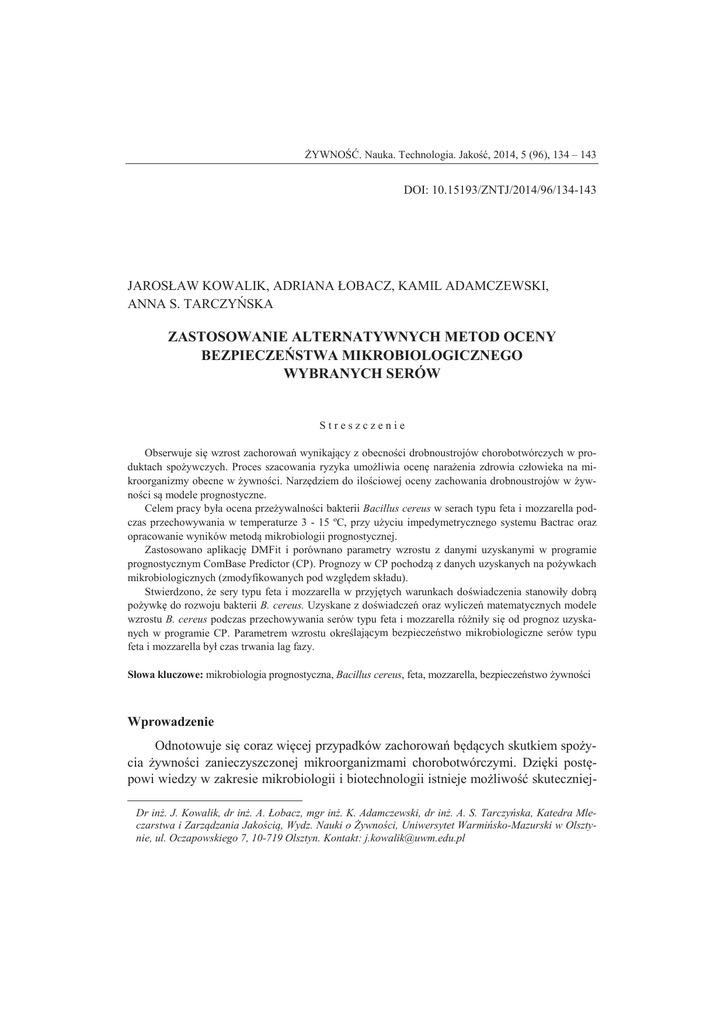 ŻYWNOŚĆ. Nauka. Technologia. Jakość, 2014, 5 (96), 134 – 143 DOI: 10.15193/ZNTJ/2014/96/134-143 JAROSŁAW KOWALIK, ADRIANA ŁOBACZ, KAMIL ADAMCZEWSKI, ANNA S. TARCZYŃSKA ZASTOSOWANIE ALTERNATYWNYCH METOD OCENY BEZPIECZEŃSTWA MIKROBIOLOGICZNEGO WYBRANYCH SERÓW Streszczenie Obserwuje się wzrost zachorowań wynikający z obecności drobnoustrojów chorobotwórczych w produktach spożywczych. Proces szacowania ryzyka umożliwia ocenę narażenia zdrowia człowieka na mikroorganizmy obecne w żywności. Narzędziem do ilościowej oceny zachowania drobnoustrojów w żywności są modele prognostyczne. Celem pracy była ocena przeżywalności bakterii Bacillus cereus w serach typu feta i mozzarella podczas przechowywania w temperaturze 3 - 15 ºC, przy użyciu impedymetrycznego systemu Bactrac oraz opracowanie wyników metodą mikrobiologii prognostycznej. Zastosowano aplikację DMFit i porównano parametry wzrostu z danymi uzyskanymi w programie prognostycznym ComBase Predictor (CP). Prognozy w CP pochodzą z danych uzyskanych na pożywkach mikrobiologicznych (zmodyfikowanych pod względem składu). Stwierdzono, że sery typu feta i mozzarella w przyjętych warunkach doświadczenia stanowiły dobrą pożywkę do rozwoju bakterii B. cereus. Uzyskane z doświadczeń oraz wyliczeń matematycznych modele wzrostu B. cereus podczas przechowywania serów typu feta i mozzarella różniły się od prognoz uzyskanych w programie CP. Parametrem wzrostu określającym bezpieczeństwo mikrobiologiczne serów typu feta i mozzarella był czas trwania lag fazy. Słowa kluczowe: mikrobiologia prognostyczna, Bacillus cereus, feta, mozzarella, bezpieczeństwo żywności Wprowadzenie Odnotowuje się coraz więcej przypadków zachorowań będących skutkiem spożycia żywności zanieczyszczonej mikroorganizmami chorobotwórczymi. Dzięki postępowi wiedzy w zakresie mikrobiologii i biotechnologii istnieje możliwość skuteczniejDr inż. J. Kowalik, dr inż. A. Łobacz, mgr inż. K. Adamczewski, dr inż. A. S. Tarczyńska, Katedra Mleczarstwa i Zarządzania Jakością, Wydz. Nauki o Żywności, Uniwersytet Warmińsko-Mazurski w Olsztynie, ul. Oczapowskiego 7, 10-719 Olsztyn. Kontakt: [email protected] ZASTOSOWANIE ALTERNATYWNYCH METOD OCENY BEZPIECZEŃSTWA MIKROBIOLOGICZNEGO… 135 szej diagnozy patogenów występujących w żywności i następuje dokładniejsza rejestracja chorób odżywnościowych [9,12]. Według zaleceń Kodeksu Żywnościowego [16], rozporządzenia WE 178/2002 [18] i obowiązującej ustawy o bezpieczeństwie żywności i żywienia z 2006 r. [21] należy prowadzić proces oceny ryzyka. Proces ten powinien łączyć cele związane z zapewnieniem bezpieczeństwa produkcji żywności i zdrowia publicznego. Rezultatem tego procesu jest możliwość oceny niebezpieczeństwa narażenia zdrowia ludzkiego na drobnoustroje oraz stworzenie wytycznych do minimalizowania ryzyka ich występowania [11, 15]. W celu zmniejszenia ryzyka zanieczyszczenia mikrobiologicznego żywności ważny jest jej stały monitoring. Przydatne w tym zakresie są automatyczne systemy kontroli czystości mikrobiologicznej. Pozwalają one na jakościowe lub ilościowe oznaczanie różnych grup drobnoustrojów. Alternatywne metody określania stanu mikrobiologicznego żywności umożliwiają uzyskanie wyników w znacznie krótszym czasie niż tradycyjne. Koszty takich analiz są dużo niższe niż metod tradycyjnych (np. klasycznej metody płytkowej). Do automatycznych metod monitorowania jakości mikrobiologicznej żywności należy pomiar impedymetryczny. Analiza polega na pomiarze przewodności elektrycznej w układzie: selektywna pożywka hodowlana – mikroorganizmy zawarte w badanej próbce. System wskazuje pomiar czasu detekcji, czyli momentu uzyskania określonego poziomu namnożenia liczby komórek bakterii (zazwyczaj jest to detekcja związana z przejściem z poziomu lag fazy do fazy maksymalnego tempa wzrostu). Istnieje zależność, że im wyższa liczba komórek bakterii w badanej próbce, tym krótszy jest czas detekcji. Do ilościowego określania danego gatunku drobnoustroju niezbędne jest skorelowanie czasu detekcji z liczbą mikroorganizmów wprowadzonych do celek pomiarowych. W celu zachowania porównywalności wyników metody płytkowej i pomiaru impedymetrycznego konieczne jest przeprowadzenie kalibracji urządzenia, podczas której opracowywane są krzywe kalibracyjne w odniesieniu do rezultatów uzyskanych klasyczną metodą płytkową. Szybkiej analizie mikrobiologicznej służą też stosowane w przemyśle spożywczym urządzenia wykorzystujące zjawiska: pomiaru fotometrycznego, sygnału fluorescencyjnego, reflaktancji, cytometrii przepływowej oraz filtracji membranowej z pomiarem bioluminescencji ATP [10, 12, 14]. Przydatnym narzędziem do szacowania ryzyka mikrobiologicznego jest mikrobiologia prognostyczna, która wykorzystuje modele matematyczne opisujące przeżywalność drobnoustrojów w żywności na podstawie wykonanych badań laboratoryjnych. Ułatwieniem w wykorzystaniu tego narzędzia są istniejące bazy danych i zawarte w nich programy komputerowe (np. ComBase Predictor, WaMa Predictor) [4, 5, 17]. Celem pracy była ocena przeżywalności bakterii Bacillus cereus w serach typu feta i mozzarella podczas przechowywania w temperaturze 3 - 15 ºC, przy użyciu impe- 136 Jarosław Kowalik, Adriana Łobacz, Kamil Adamczewski, Anna S. Tarczyńska dymetrycznego systemu Bactrac oraz opracowanie wyników w aspekcie mikrobiologii prognostycznej. Materiał i metody badań Do badań przeżywalności B. cereus użyto serów miękkich solankowych typu feta (o zawartości: 18 % tłuszczu, 10 % białka, 4 % NaCl) oraz serów typu mozzarella (o zawartości: 19 % tłuszczu, 17 % białka, 1,5 % NaCl), wyprodukowanych przez polskiego producenta. Sery pochodziły z handlu detalicznego, termin przydatności do spożycia wynosił 6 miesięcy w przypadku fety oraz 21 dni – mozzarelli. Do badań użyto 
