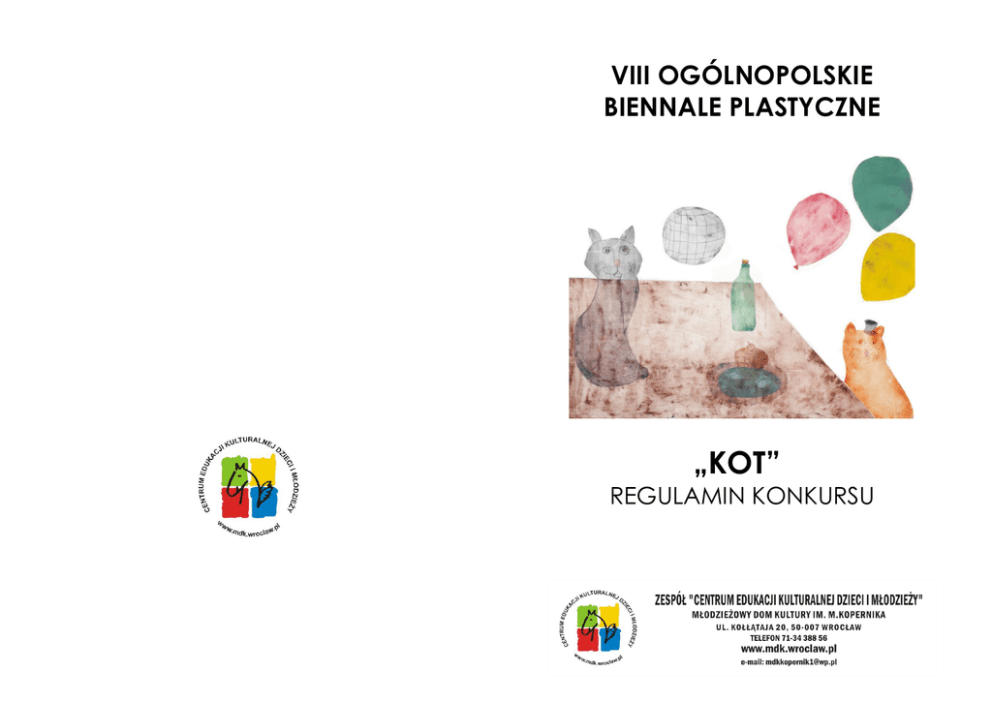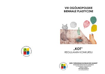 VIII OGÓLNOPOLSKIE BIENNALE PLASTYCZNE „KOT” REGULAMIN KONKURSU VIII OGÓLNOPOLSKIE BIENNALE PLASTYCZNE „KOT” ORGANIZATOR: Zespół „Centrum Edukacji Kulturalnej Dzieci i Młodzieży” ul. Kołłątaja 20, 50-007 Wrocław tel. 71 343 88 56 KOORDYNATOR: MARTA JAROSZ CELE: Biennale ma na celu pobudzenie wyobraźni plastycznej na temat kota. Przykładowe tropy: Kot na przestrzeni wieków - w wielu kulturach miał znaczenie symboliczne, metafizyczne i religijne. Jego kult istnieje nadal w wielu krajach. Kot i jego charakter - mimo wrażenia zwierzęcia domowego, jest drapieżnikiem chodzącym „własnymi drogami”. Jego charakter i zachowanie burzą myśl o miękkiej przytulance. Jego charakter, to symbol przeciwności: miłości i agresji, przywiązania i odrębności… Kot to zwierzątko - zwinne i zwinięte, puszyste i zupełnie łyse, białe i czarne. Jego postaci mogą być różne… Kot i człowiek - wrażliwość na potrzeby zwierząt żyjących wśród nas… Kot w rodzinie – kot jako część ogniska domowego… Kocia mama i tata – koty ze swoim potomstwem… Kot i pies – miłość czy nienawiść… Kot i jego legenda – kot czarownicy, czarny kot… i inne….. Biennale będzie prezentacją możliwości twórczych dzieci i młodzieży w dziedzinie plastyki oraz wymianą doświadczeń i poszerzania wiedzy z zakresu różnych technik plastycznych. WARUNKI KONKURSU: 1.Biennale skierowane jest do dzieci i młodzieży w wieku 5-24 lat, uczestników zajęć placówek wychowania pozaszkolnego oraz do wszystkich typów szkół. 2. Jedna osoba może przedstawić tylko jedną pracę. Maksymalna ilość prac z placówki - 10 3. Prace powinny być wykonane w technikach: malarstwo, malarstwo na szkle, tkanina artystyczna, batik, grafika, rysunek, ceramika i inne trwałe techniki. 4.Format pracy nie może przekraczać wymiarów: - 100 x 70 cm - dla malarstwa, rysunku i grafiki; - 40 x 40 x 40 cm - dla ceramiki i form przestrzennych. 5. Prace nie powinny być oprawione. Na odwrocie pracy należy umieścić czytelne i trwałe informacje o autorze: tytuł pracy, imię i nazwisko, wiek, nazwa i adres placówki/szkoły oraz imię i nazwisko nauczyciela, pod kierunkiem którego praca została wykonana. Do wysyłki należy dołączyć listę zbiorczą autorów prac opatrzoną pieczęcią placówki. 6. Prace należy przesyłać na adres organizatora: Zespół „Centrum Edukacji Kulturalnej Dzieci i Młodzieży”, ul. Kołłątaja 20, 50-007 Wrocław do 16 maja 2015r. (decyduje data stempla pocztowego), z dopiskiem KOT. 7. Warunkiem uczestnictwa w biennale jest opłata w wysokości 35 zł od placówki na konto: Rada Rodziców MDK im. M. Kopernika ul. Kołłątaja 20, 50-007 Wrocław, 89 1020 5242 0000 2202 0018 7526, tytuł opłaty „Konkurs KOT”. Opłatę należy dokonać do dnia 15.05.2015r. W przypadku potrzeby uzyskania rachunku za udział w konkursie, prosimy drogą elektroniczną, na adres: [email protected], przesłać dokładne dane (NIP, nazwa i adres placówki). 8. Prace będą oceniane w kategoriach wiekowych: kl. 0-3, kl. 4-6, gimnazjum, szkoły ponadgimnazjalne W skład Jury wchodzić będą profesjonalni artyści plastycy. Organizatorzy przewidują nagrody i wyróżnienia we wszystkich kategoriach wiekowych. 9. Prace nadesłane na biennale, zakwalifikowane do wystawy oraz nagrodzone i wyróżnione przechodzą na własność organizatora i nie będą zwracane uczestnikom. 11. Udział w biennale jest równoznaczny z akceptacją regulaminu oraz ze zgodą na prezentowanie i reprodukowanie prac. INNE INFORMACJE: Wyniki biennale będą dostępne na stronie www.mdk.wroclaw.pl od 26.06.2015r. Wręczenie nagród nastąpi w dniu 3.10.2015 na uroczystym finisażu wystawy podczas Drzwi Otwartych naszej placówki. Wystawa pokonkursowa w Centrum Edukacji Kulturalnej Dzieci i Młodzieży we Wrocławiu, przy ul. Kołłątaja 20 czynna będzie o okresie od 11.07. – 18.10.2015 Laureaci biennale i ich opiekunowie spoza Wrocławia, mogą otrzymać bezpłatny nocleg w Szkolnym Schronisku Młodzieżowym na terenie Zespołu „CEKDiM”.