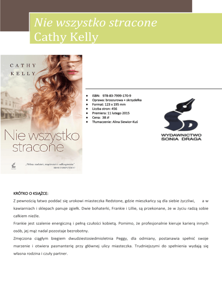 Nie wszystko stracone Cathy Kelly        ISBN: 978-83-7999-170-9 Oprawa: broszurowa + skrzydełka Format: 123 x 195 mm Liczba stron: 456 Premiera: 11 lutego 2015 Cena: 38 zł Tłumaczenie: Alina Siewior-Kuś KRÓTKO O KSIĄŻCE: Z pewnością łatwo poddać się urokowi miasteczka Redstone, gdzie mieszkańcy są dla siebie życzliwi, aw kawiarniach i sklepach panuje zgiełk. Dwie bohaterki, Frankie i Lillie, są przekonane, że w życiu radzą sobie całkiem nieźle. Frankie jest szalenie energiczną i pełną czułości kobietą. Pomimo, że profesjonalnie kieruje karierą innych osób, jej mąż nadal pozostaje bezrobotny. Zmęczona ciągłym biegiem dwudziestosiedmioletnia Peggy, dla odmiany, postanawia spełnić swoje marzenie i otwiera pasmanterię przy głównej ulicy miasteczka. Trudniejszymi do spełnienia wydają się własna rodzina i czuły partner. Do rodzinnej Irlandii przybywa wychowana w Australii Lillie, która szybko poddaje się atmosferze miasteczka Redstone i jego mieszkańcom. Nieobce jej są sekrety i miłosne niepowodzenia. Wkrótce Lillie, dzięki zdobytym w Australii doświadczeniom, stanie się podporą dla obu kobiet, pomagając im odnaleźć radość życia. Woman and Home O AUTORCE: Cathy Kelly publikuje swoje książki w milionach egzemplarzy na całym świecie. W Wielkiej Brytanii, Irlandii i Australii znajduje się na pierwszym miejscu list bestsellerów. Dorastała w Dublinie, po ukończeniu szkoły pracowała jako dziennikarka państwowej gazety irlandzkiej, w której redagowała wiadomości, recenzowała filmy, a także była odpowiedzialna za kolumnę porad. To ostatnie bardzo lubiła, opisując to doświadczenie jako zdobywanie doktoratu z ludzi. W przerwach pisała, a swoją pierwszą powieść Kobieta i kobieta wydała w 1997. Książka od razu trafiła na pierwsze miejsce list bestsellerów The Irish Timesa oraz Sunday Timesa. Znakiem rozpoznawczym Cathy Kelly są pełne ciepła współczesne historie, a jej książki poruszają temat związków, małżeństw, zmagania się z depresją i stratą. Zawsze jednak znajduje się w nich budujące przesłanie, poczucie wspólnoty oraz postaci silnych kobiet. Wspólnie z mężem, dwójką synów i trzema psami mieszka w hrabstwie Wicklow. Jest Ambasadorką Dobrej Woli UNICEF w Irlandii, zbiera fundusze i podnosi świadomość na rzecz dzieci żyjących z HIV/AIDS, oraz dzieci, które zostały osierocone przez rodziców dotkniętych tą chorobą. Cathy Kelly uwielbia stały kontakt z czytelnikami jej książek przy wykorzystaniu Facebooka, Twittera i poczty elektronicznej. PRASA O KSIĄŻKACH CATHY KELLY: O Nie wszystko stracone: „Pełna nadziei, mądrości i przebaczenia”. Irish Independent „Zabawna, poruszająca i sugestywna. Kelly przedstawia bardzo szczery i prawdziwy obraz kobiet”. Irish Independent „Radosna i pełna czułości, jak ploteczki wśród najlepszych przyjaciółek”. Essentials „Wszyscy bohaterowie są realistycznie sportretowani, a przedstawione miasteczko z łatwością sobie można wyobrazić”. Cressida McLaughlin O Raz w życiu: „Mądra, pełna cudownych postaci, które pokochałam i z którymi się identyfikuję – to jak spotkanie z przyjaciółką przy kawie. Jej najlepsza książka”. Marian Keyes „Wciągająca, pełna ciepła opowieść”. Company „Autorka, która potrafi nie tylko wyciskać z oczu łzy, ale także sprawić, że nie można nie polubić jej postaci. Wzruszająca lektura”. Daily Mail Sonia Draga Sp. z o.o., Pl. Grunwaldzki 8-10, 40-127 Katowice, Tel.: 327826477, 7826037, Fax: 032/ 2537728 Dział handlowy: Danuta Czarnowska, 693420384, [email protected] Promocja: Agnieszka Jedlińska, 695672067, [email protected] Redakcja: Sławomir Apel, 693520384, [email protected]