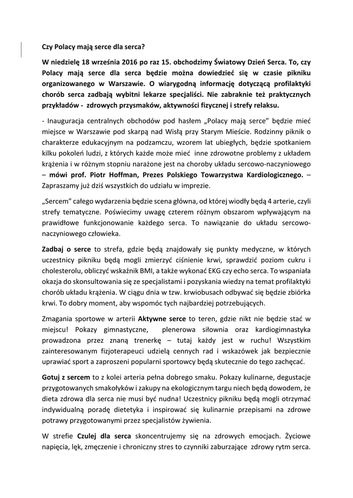 Czy Polacy mają serce dla serca? W niedzielę 18 września 2016 po raz 15. obchodzimy Światowy Dzień Serca. To, czy Polacy mają serce dla serca będzie można dowiedzieć się w czasie pikniku organizowanego w Warszawie. O wiarygodną informację dotyczącą profilaktyki chorób serca zadbają wybitni lekarze specjaliści. Nie zabraknie też praktycznych przykładów - zdrowych przysmaków, aktywności fizycznej i strefy relaksu. - Inauguracja centralnych obchodów pod hasłem „Polacy mają serce” będzie mieć miejsce w Warszawie pod skarpą nad Wisłą przy Starym Mieście. Rodzinny piknik o charakterze edukacyjnym na podzamczu, wzorem lat ubiegłych, będzie spotkaniem kilku pokoleń ludzi, z których każde może mieć inne zdrowotne problemy z układem krążenia i w różnym stopniu narażone jest na choroby układu sercowo-naczyniowego – mówi prof. Piotr Hoffman, Prezes Polskiego Towarzystwa Kardiologicznego. – Zapraszamy już dziś wszystkich do udziału w imprezie. „Sercem” całego wydarzenia będzie scena główna, od której wiodły będą 4 arterie, czyli strefy tematyczne. Poświecimy uwagę czterem różnym obszarom wpływającym na prawidłowe funkcjonowanie każdego serca. To nawiązanie do układu sercowonaczyniowego człowieka. Zadbaj o serce to strefa, gdzie będą znajdowały się punkty medyczne, w których uczestnicy pikniku będą mogli zmierzyć ciśnienie krwi, sprawdzić poziom cukru i cholesterolu, obliczyć wskaźnik BMI, a także wykonać EKG czy echo serca. To wspaniała okazja do skonsultowania się ze specjalistami i pozyskania wiedzy na temat profilaktyki chorób układu krążenia. W ciągu dnia w tzw. krwiobusach odbywać się będzie zbiórka krwi. To dobry moment, aby wspomóc tych najbardziej potrzebujących. Zmagania sportowe w arterii Aktywne serce to teren, gdzie nikt nie będzie stać w miejscu! Pokazy gimnastyczne, plenerowa siłownia oraz kardiogimnastyka prowadzona przez znaną trenerkę – tutaj każdy jest w ruchu! Wszystkim zainteresowanym fizjoterapeuci udzielą cennych rad i wskazówek jak bezpiecznie uprawiać sport a zaproszeni popularni sportowcy będą skutecznie do tego zachęcać. Gotuj z sercem to z kolei arteria pełna dobrego smaku. Pokazy kulinarne, degustacje przygotowanych smakołyków i zakupy na ekologicznym targu niech będą dowodem, że dieta zdrowa dla serca nie musi być nudna! Uczestnicy pikniku będą mogli otrzymać indywidualną poradę dietetyka i inspirować się kulinarnie przepisami na zdrowe potrawy przygotowanymi przez specjalistów żywienia. W strefie Czulej dla serca skoncentrujemy się na zdrowych emocjach. Życiowe napięcia, lęk, zmęczenie i chroniczny stres to czynniki zaburzające zdrowy rytm serca. Relaksacyjny klimat i wypoczynkowe meble wspomogą odnaleźć harmonię i pełne odprężenie. Trening jogi i ćwiczenia oddechowe przyniosą ulgę skołatanym nerwom i zredukują stresu. Rozmowa z psychologiem nauczy - jak zatrzymać ten błogi stan na kolejne dni. Zabawa, edukacja, aktywność, odpoczynek i relaks – tak można podsumować program zbliżającego się Światowego Dnia Serca, na który zapraszamy na warszawskie podzamcze. Promowanie profilaktyki chorób układu sercowo – naczyniowego jest jednym z głównych celów obecnej kadencji Polskiego Towarzystwa Kardiologicznego. Patronuje jej hasło „zdrowe dzieci, zdrowa młodzież, zdrowi dorośli” a misją jest wyrobienie odpowiednich nawyków żywieniowych i behawioralnych u najmłodszych. Obchody Światowego Dnia Serca wpisują się w realizację tej idei.