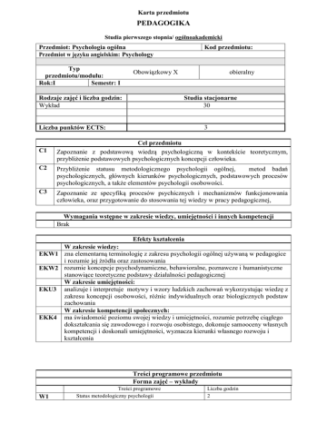 Karta przedmiotu PEDAGOGIKA Studia pierwszego stopnia/ ogólnoakademicki Przedmiot: Psychologia ogólna Przedmiot w języku angielskim: Psychology Typ przedmiotu/modułu: Rok:I Semestr: I Kod przedmiotu: Obowiązkowy X Rodzaje zajęć i liczba godzin: Wykład obieralny Studia stacjonarne 30 3 Liczba punktów ECTS: Cel przedmiotu C1 Zapoznanie z podstawową wiedzą psychologiczną w kontekście teoretycznym, przybliżenie podstawowych psychologicznych koncepcji człowieka. C2 Przybliżenie statusu metodologicznego psychologii ogólnej, metod badań psychologicznych, głównych kierunków psychologicznych, podstawowych procesów psychologicznych, a także elementów psychologii osobowości. C3 Zapoznanie ze specyfiką procesów psychicznych i mechanizmów funkcjonowania człowieka, oraz przygotowanie do stosowania tej wiedzy w pracy pedagogicznej, Wymagania wstępne w zakresie wiedzy, umiejętności i innych kompetencji Brak Efekty kształcenia W zakresie wiedzy: EKW1 zna elementarną terminologię z zakresu psychologii ogólnej używaną w pedagogice i rozumie jej źródła oraz zastosowania EKW2 rozumie koncepcje psychodynamiczne, behawioralne, poznawcze i humanistyczne stanowiące teoretyczne podstawy działalności pedagogicznej W zakresie umiejętności: EKU3 analizuje i interpretuje motywy i wzory ludzkich zachowań wykorzystując wiedzę z zakresu koncepcji osobowości, różnic indywidualnych oraz biologicznych podstaw zachowania W zakresie kompetencji społecznych: EKK4 ma świadomość poziomu swojej wiedzy i umiejętności, rozumie potrzebę ciągłego dokształcania się zawodowego i rozwoju osobistego, dokonuje samooceny własnych kompetencji i doskonali umiejętności, wyznacza kierunki własnego rozwoju i kształcenia Treści programowe przedmiotu Forma zajęć – wykłady W1 Treści programowe Status metodologiczny psychologii Liczba godzin 2 Schemat poznania naukowego i jego zastosowanie w psychologii. Przedmiot psychologii według różnych działów psychologii. Miejsce psychologii wśród innych nauk. Podstawowe działy psychologii. Definicja i rodzaje metod naukowych. W2 Metody badań psychologicznych Metoda obserwacji psychologicznej. Cechy dobrej obserwacji. Eksperyment psychologiczny (polowy, naturalny i sztuczny). Ankieta psychologiczna. Kwestionariusz psychologiczny. Ankieta i kwestionariusz. Podobieństwa i różnice. Testy psychologiczne. Kryteria podziału. Rozmowa i wywiad psychologiczny. Rodzaje wywiadów psychologicznych 2 W3 Główne kierunki psychologiczne Psychoanaliza Z. Freuda. Psychoanaliza C.G. Junga i A. Adlera. Neopsychanaliza K. Horney i E. Fromma Główne kierunki psychologiczne Behawioryzm. Neobehawioryzm. 2 Główne kierunki psychologiczne Psychologia humanistyczna. Psychologia poznawcza (kognitywna). 2 W4 W5 W6 W7 W8 W9 W10 W11 W12 Biopsychologia. Biologiczne podstawy psychologii, mózg a zachowanie. Organizacja funkcjonalna podstawowych struktur CUN. Asymetria półkulowa, plastyczność mózgu. Psychologia rozwoju człowieka – zagadnienia ogólne. Rozwój człowieka – podstawowe pojęcia w psychologii rozwojowej. Środowisko czy dziedziczenie. Kierunki rozwoju psychosomatycznego. Rozwój człowieka w ciągu życia. Procesy poznawcze: Spostrzeganie i procesy uwagowe. Procesy psychologiczne Fazy procesów pamięciowych. Rodzaje pamięci. Cechy pamięci. Definicja pamięci. Struktury mózgowe odpowiedzialne za procesy pamięci. Rola postaw i nastawień w procesie zapamiętywania. Zjawisko reminescencji. Interferencja retroaktywna i proaktywna. Teorie zapominania. Koncepcje przechowywania Procesy psychologiczne Definicja myślenia. Rodzaje myślenia. Rodzaje sytuacji problemowych. Fazy rozwiązywania problemów. Zjawisko „ olśnienia ” i fiksacja funkcjonalna. Procesy psychologiczne Definicja emocji i uczuć. Komponenty emocji. Definicja stresu biologicznego i psychologicznego Typy konfliktów psychologicznych. Problematyka frustracji Psychologia różnic indywidualnych. 2 2 2 2 2 2 2 2 Zdolności i uzdolnienia. Podstawowe koncepcje inteligencji. Geniusz i upośledzenie. Inteligencja emocjonalna vs inteligencja w kontekście funkcjonowania intelektualnego. W13 W14 W15 Elementy psychologii osobowości Definicja osobowości. Osoba i osobowość. Kształtowanie się tożsamości i struktury osobowości. Elementy psychologii osobowości Teorie typów fizycznych. Teorie typów fizjologicznych. Teorie typów psychicznych. Teorie cech. Teorie rozwojowe. Elementy psychologii osobowości Temperament według R. Le Senneá. Charakter człowieka – podstawowe pojęcia i nurty badawcze. Definicje inteligencji Suma godzin: 2 2 2 30 Metody i środki dydaktyczne M1 M2 M3 M4 SD1 Wykład konwencjonalny Dyskusja dydaktyczna Wykład konwersatoryjny Pokaz Prezentacja multimedialna Sposoby oceniania Ocenianie kształtujące F1 Aktywność podczas zajęć P1 Egzamin pisemny Ocenianie podsumowujące Obciążenie pracą studenta Średnia liczba godzin na realizowanie aktywności (Godziny kontaktowe z wykładowcą, 30 realizowane w formie zajęć dydaktycznych – łączna liczba godzin w semestrze) (Godziny kontaktowe z wykładowcą 2 realizowane w formie np. konsultacji – łączna liczba godzin w semestrze) Przygotowanie do egzaminu 30 Studiowanie literatury przedmiotu 28 Suma 90 Liczba punktów ECTS dla przedmiotu 3 Forma aktywności Literatura podstawowa i uzupełniająca 1 2 Kalat J. Biologiczne podstawy psychologii, PWN Warszawa 2006 Kozielecki J, Koncepcje psychologiczne człowieka. Warszawa 1996 Strelau J., Psychologia, Gdańsk 2008 Szustrowa T. Swobodne techniki diagnostyczne. Wywiad i obserwacja. Warszawa 1987 Zimbardo P.G. Psychologia i życie, PWN, Warszawa 2004 Literatura uzupełniająca Brzeziński J, Metodologia badań psychologicznych. Warszawa 1996. Buduhoska W., Grabowska A, Dwie półkule, jeden mózg, Warszawa 1994. Goleman D. Inteligencja emocjonalna, Media Rodzina of Poznań, Poznań 1997 Górska T., Grabowska A., Zagrodzka J. (red) Mózg
