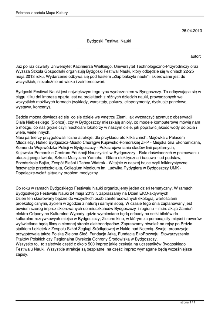 Pobrano z portalu Mapa Kultury 26.04.2013 Bydgoski Festiwal Nauki ____________________________ autor: Już po raz czwarty Uniwersytet Kazimierza Wielkiego, Uniwersytet Technologiczno-Przyrodniczy oraz Wyższa Szkoła Gospodarki organizują Bydgoski Festiwal Nauki, który odbędzie się w dniach 22-25 maja 2013 roku. Wydarzenie odbywa się pod hasłem „Złap bakcyla nauki” i skierowane jest do wszystkich, niezależnie od wieku i zainteresowań. Bydgoski Festiwal Nauki jest największym tego typu wydarzeniem w Bydgoszczy. Ta odbywająca się w ciągu kilku dni impreza oparta jest na projektach z różnych dziedzin nauki, prowadzonych we wszystkich możliwych formach (wykłady, warsztaty, pokazy, eksperymenty, dyskusje panelowe, wystawy, koncerty). Będzie można dowiedzieć się co się dzieje we wnętrzu Ziemi, jak wyznaczyć azymut z obserwacji Ciała Niebieskiego (Słońca), czy w Bydgoszczy mieszkają anioły, co modele komputerowe mówią nam o mózgu, co nas gryzie czyli niechciani lokatorzy w naszym ciele, jak poprawić jakość wody do picia i wiele, wiele innych. Nasi partnerzy przygotowali liczne atrakcje, dla przykładu oto kilka z nich: Majówka z Pałacem Młodzieży, Hufiec Bydgoszcz-Miasto Chorągwi Kujawsko-Pomorskiej ZHP - Miejska Gra Ekonomiczna, Komenda Wojewódzka Policji w Bydgoszczy - Pokaz ujawniania śladów linii papilarnych, Kujawsko-Pomorskie Centrum Edukacji Nauczycieli w Bydgoszczy - Rola doświadczeń w poznawaniu otaczającego świata, Szkoła Muzyczna Yamaha - Gitara elektryczna i basowa - od podstaw, Przedszkole Bajka, Zespół Pieśni i Tańca Wiatrak - Witajcie w naszej bajce czyli folklorystyczne fascynacje przedszkolaka, Collegium Medicum im. Ludwika Rydygiera w Bydgoszczy UMK Dopalacze-wciąż aktualny problem medyczny. Co roku w ramach Bydgoskiego Festiwalu Nauki organizujemy jeden dzień tematyczny. W ramach Bydgoskiego Festiwalu Nauki 24 maja 2013 r. zapraszamy na Dzień EKO-aktywnych! Dzień ten skierowany będzie do wszystkich osób zainteresowanych ekologią, wartościami proekologicznymi, życiem w zgodzie z naturą i samym sobą. W czasie tego dnia zaplanowany jest bowiem szereg imprez skierowanych do mieszkańców Bydgoszczy i regionu – m.in. akcja Zamień elektro-Odpady na Kulturalne Wypady, gdzie wymieniane będą odpady na setki biletów do kulturalno-rozrywkowych miejsc w Bydgoszczy; Zielone kino, w którym za pomocą siły mięśni i rowerów wyświetlane będą filmy o ciemnej stronie elektroodpadów. Zapraszamy również na rejsy po Brdzie statkiem Łokietek z Zespołu Szkół Żeglugi Śródlądowej w Nakle nad Notecią. Swoje propozycje przygotowała także Polska Zielona Sieć, Fundacja Arka, Fundacja EkoRozwoju, Stowarzyszenie Ptaków Polskich czy Regionalna Dyrekcja Ochrony Środowiska w Bydgoszczy. Wszystko to, to zaledwie część z około 500 imprez jakie czekają na uczestników Bydgoskiego Festiwalu Nauki. Wszystkie atrakcje są bezpłatne, na część imprez wymagane będą wcześniejsze zapisy. strona 1 / 1