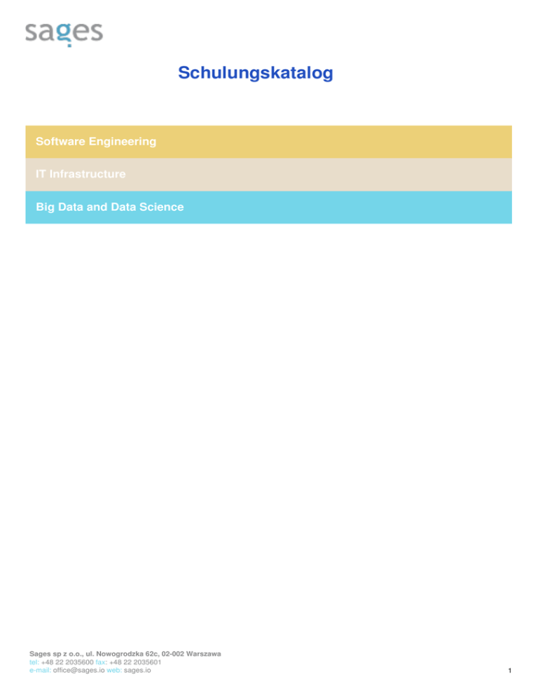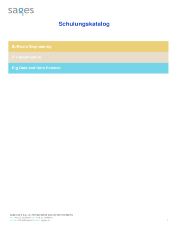 Schulungskatalog Software Engineering IT Infrastructure Big Data and Data Science Sages sp z o.o., ul. Nowogrodzka 62c, 02-002 Warszawa tel: +48 22 2035600 fax: +48 22 2035601 e-mail: [email protected] web: sages.io 1 Software Engineering System analysis and design Kod szkolenia BA/PRCT J/OOP Nazwa szkolenia Czas trwania Business analysis in practice 5 Programming and object-oriented programming – the example of Java language 3 Internet applications Kod szkolenia CQ Nazwa szkolenia Czas trwania Adobe CQ for a Java programmer 5 Advanced mechanisms of user interface development in the Java Server Faces technology 3 ANGULAR AngularJS Framework 4 HTML5/BB Development of Web applications on the basis of HTML5, JavaScript, jQuery and Backbone 5 LARAVEL Development of Web applications using the Laravel framework 3 Effective development of Web applications using AngularJS, HTML5 and JavaScript 5 ExtJS 4 – Effective development of Web applications 3 Legacy Java Enterprise applications to JEE7 migration – best practices 3 SPRING/JSF Modern Web applications based on Spring Framework, JSF, JPA and AJAX 5 SPRING/WKT Modern Web applications based on Spring, Hibernate, Apache Wicket and Jetty 5 JEE7/JSF Modern web applications built with JEE7 (JSF2.2, EJB3.2, JPA2.1, CDI1.1, AJAX) 5 JEE7/ANG Modern web applications built with JEE7, AngularJS and HTML5 5 Web Development with Symphony2 3 Wicket 2 JSF2 HTML5/ANG EXTJS EEMI SF2 WICKET Sages sp z o.o., ul. Nowogrodzka 62c, 02-002 Warszawa tel: +48 22 2035600 fax: +48 22 2035601 e-mail: [email protected] web: sages.io 2 GIS and Web mapping Kod szkolenia OLAYERS Nazwa szkolenia Czas trwania Development of dynamic maps on Web pages using OpenLayers 2 WEBGIS Development of WebGIS applications on the basis of PostGIS, Geoserver, OpenLayers and QGIS 3 GEOEXT GeoExt – creating interactive maps on Web pages 2 QGIS Introduction to GIS – the QGIS platform example 2 LEAFLET Leaflet – creating interactive maps on Web pages 2 SPATIAL Management of spatial data in Oracle Spatial 3 OpenLayers 3 – creating interactive maps on Web pages 2 POSTGIS PostGIS as a platform for spatial data storage, processing and analysis 3 GEOSERV Presentation and sharing of spatial data using GeoServer 3 OL3 Programming languages C/C++ Kod szkolenia C/OOBP Nazwa szkolenia Best practices of object-oriented programming in C++ language Czas trwania 3 Java Kod szkolenia J/BP8 J/KRYPT J/MT SPRING Nazwa szkolenia Czas trwania Best practices of object-oriented programming in Java 8 3 Java platform-based cryptography in practice 3 Programming of multithreaded applications in Java 5 Spring Framework 2 Sages sp z o.o., ul. Nowogrodzka 62c, 02-002 Warszawa tel: +48 22 2035600 fax: +48 22 2035601 e-mail: [email protected] web: sages.io 3 .NET Kod szkolenia NET/DBG Nazwa szkolenia Advanced debugging in .NET Czas trwania 3 PHP Kod szkolenia LARAVEL SF2 Nazwa szkolenia Czas trwania Development of Web applications using the Laravel framework 3 Web Development with Symphony2 3 R Kod szkolenia R/F R/ANA Nazwa szkolenia Czas trwania Basic programming in R 2 Introduction to data analysis in R 1 Scala Kod szkolenia SCALA/J Nazwa szkolenia Object-functional programming in Scala language for Java programmers Sages sp z o.o., ul. Nowogrodzka 62c, 02-002 Warszawa tel: +48 22 2035600 fax: +48 22 2035601 e-mail: [email protected] web: sages.io Czas trwania 3 4 System programming and embedded systems Kod szkolenia PS/LINUX PS/WIN Nazwa szkolenia Czas trwania System programming in Linux 5 System programming in Windows 5 SOA/EAI Service Oriented Architecture and related areas Kod szkolenia AWS Nazwa szkolenia Czas trwania Architecture of cloud-based systems illustrated by Amazon Web Services 2 Enterprise Service Bus – example of Mule ESB 3 Enterprise Service Bus – the example of Oracle Service Bus 3 Enterprise Service Bus illustrated by JBoss Fuse and Fabric8 3 Enterprise Service Bus: Apache ServiceMix or JBoss ESB 3 SPRSEC Implementation of security mechanisms in Web applications using Spring Security, Apache Shiro, JBoss Picketlink 3 GUVNOR Modeling and management of business rules on the basis of Drools Guvnor for analysts 3 BPEL Practical aspects of WS-BPEL 2 J/REST RESTful web services in Java 2 ESB/M ESB/OSB ESB/F ESB/SMIX Mobile technologies Kod szkolenia PHGAP Nazwa szkolenia Czas trwania Development of inter-platform mobile applications using PhoneGap and Angular JS 3 iOS platform programming 5 IOS/START iOS programming – a quick start 3 IOS/SWIFT Programming in Swift language on the iOS platform 5 WP/START Windows Phone programming – a quick start 3 IOS Sages sp z o.o., ul. Nowogrodzka 62c, 02-002 Warszawa tel: +48 22 2035600 fax: +48 22 2035601 e-mail: [email protected] web: sages.io 5 Software testing Kod szkolenia AGILETEST Nazwa szkolenia Agile Testing Czas trwania 3 ISTQB Kod szkolenia ISTQB/AT Nazwa szkolenia ISTQB Agile Tester Czas trwania 2 Software testing - tools Kod szkolenia Nazwa szkolenia Czas trwania SOAPUI/F Automated network service tests using SoapUI 2 SELENIUM Automation of functional tests of Web applications using Selenium and Robot Framework 3 Performance tests for Web applications using Apache JMeter 3 Security testing of modern Web applications 5 SoapUI – advanced issues 1 JMETER SEC/WEB SOAPUI/ADV Best practices in programming Kod szkolenia PROD AGILE/DEV CHEF CI/JENKINS CDDD DEVOPS J/DDD Nazwa szkolenia Czas trwania A product-based approach to software development 3 Agile Software Development 2 Continuous Delivery using Chef 2 Continuous Integration using a Jenkins server 2 Designing of complex domain models using the Domain Driven Design 3 DevOps – Agile Application Delivery 3 Domain Driven Design (DDD) in the process of application development illustrated by the example of JEE solutions 3 Sages sp z o.o., ul. Nowogrodzka 62c, 02-002 Warszawa tel: +48 22 2035600 fax: +48 22 2035601 e-mail: [email protected] web: sages.io 6 IMPMAP Effective product development w