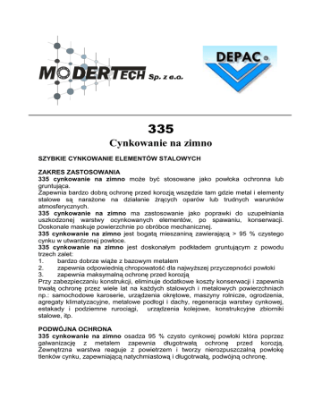 335 Cynkowanie na zimno SZYBKIE CYNKOWANIE ELEMENTÓW STALOWYCH ZAKRES ZASTOSOWANIA 335 cynkowanie na zimno moŜe być stosowane jako powłoka ochronna lub gruntująca. Zapewnia bardzo dobrą ochronę przed korozją wszędzie tam gdzie metal i elementy stalowe są naraŜone na działanie Ŝrących oparów lub trudnych warunków atmosferycznych. 335 cynkowanie na zimno ma zastosowanie jako poprawki do uzupełniania uszkodzonej warstwy ocynkowanych elementów, po spawaniu, konserwacji. Doskonale maskuje powierzchnie po obróbce mechanicznej. 335 cynkowanie na zimno jest bogatą mieszaniną zawierającą > 95 % czystego cynku w utwardzonej powłoce. 335 cynkowanie na zimno jest doskonałym podkładem gruntującym z powodu trzech zalet: 1. bardzo dobrze wiąŜe z bazowym metalem 2. zapewnia odpowiednią chropowatość dla najwyŜszej przyczepności powłoki 3. zapewnia maksymalną ochronę przed korozją Przy zabezpieczaniu konstrukcji, eliminuje dodatkowe koszty konserwacji i zapewnia trwałą ochronę przez wiele lat na kaŜdych stalowych i metalowych powierzchniach np.: samochodowe karoserie, urządzenia okrętowe, maszyny rolnicze, ogrodzenia, agregaty klimatyzacyjne, metalowe podłogi i dachy, regeneracja warstwy cynkowej, estakady i podziemne rurociągi, urządzenia kolejowe, konstrukcyjne zbiorniki stalowe, itp. PODWÓJNA OCHRONA 335 cynkowanie na zimno osadza 95 % czysto cynkowej powłoki która poprzez galwanizację z metalem zapewnia długotrwałą ochronę przed korozją. Zewnętrzna warstwa reaguje z powietrzem i tworzy nierozpuszczalną powłokę tlenków cynku, zapewniającą natychmiastową i długotrwałą, podwójną ochronę. TLENEK CYNKU CYNK METAL CHARAKTERYSTYKA FIZYCZNA Zawartość cynku (wysuszona powłoka) Rozcieńczalnik Punkt zapłonu Spec. wagowa Kolor Temperatura maksymalna 95 % i więcej Xylol 27 ºC 2,9 kg/Litr Szary 150 ºC ZALETY 95 % lub więcej czystego cynku Najdrobniejsze cząsteczki dla lepszej jakości powierzchni Podwójna ochrona z tlenkami cynku Osłona przed korozją przez galwaniczne działanie Elastyczność Nie odpryskuje - nie łuszczy się UŜywać na czystych powierzchniach Ochronna powłoka przed korozją nie wymagająca dalszego malowania WSKAZÓWKI Piaskowanie zapewnia najlepsze przygotowanie powierzchni. W większości przypadków, jednak czyszczenie ręcznymi narzędziami lub elektrycznymi będzie wystarczające. Powierzchnie powinny być wolne od oleju, brudu, wilgoci, smaru i rdzy. Malować pędzlem, wałkiem lub pistoletem. Wymieszać dokładnie przed uŜyciem. Nigdy nie rozcieńczać więcej niŜ 0,5 l rozpuszczalnika na 4,0 l 335 cynkowanie na zimno. W Aplikacjach wałkiem ten stosunek moŜe być podwyŜszony do 0,75 l na 4,0 l. UŜywać xylol lub podobnych rozcieńczalników. Do oczyszczenia moŜe być uŜywany dowolny węglowodór aromatyczny. PRZYKŁADY ZASTOSOWAŃ Farba do gruntowania Powłoka ochronna Naprawa ogniowo cynkowanych części Nadaje się na stalowe i cynkowe powierzchnie DANE BEZPIECZEŃSTWA Aerozol Nie wdychać oparów aerozolu. Zapobiegać powstawaniu elektrostatycznego ładunku. Unikać kontaktu z oczami i skórą. Palny, szkodliwy dla zdrowia. Pojemnik Palny. Wdychanie oparów jest szkodliwe dla zdrowia. Przechowywać pojemnik w dobrze wentylowanym pomieszczeniu. Unikać uŜywania w bezpośrednim sąsiedztwie źródeł zapłonu. Nie palić. Nie wdychać oparów. Unikać kontaktu z oczami i skórą. NaleŜy zachować ostroŜność w celu unikania przeskoku ładunku elektrostatycznego. OPAKOWANIA Aerozol 400 ml Pojemnik 1 kg Dane techniczne ustalone zostały w warunkach laboratoryjnych. Dane te powinny być uznawane jedynie jako ogólne informacje. Depac nie moŜe dać gwarancji bezpośrednich lub pośrednich dla konkretnych uŜyć danego produktu. JeŜeli zastosowanie nie jest zgodne z przeznaczeniem nie moŜe to być warunkiem do wymiany zakupionego produktu. Dystrybucja w Polsce: MODERTECH Sp. z o.o. 44-100 Gliwice ul. Biegusa 39 tel/fax 032 – 305 02 78