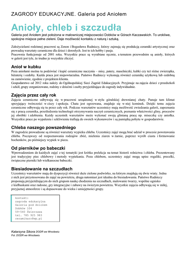 ZAGRODY EDUKACYJNE. Galeria pod Aniołem Anioły, chleb i szczudła Galeria pod Aniołem jest położona w malowniczej miejscowości Dobków w Górach Kaczawskich. To urokliwe, spokojne miejsce pełne zieleni. Daje możliwość kontaktu z naturą i sztuką. Założycielami rodzinnej pracowni są Zenon i Bogusława Rudniccy, którzy zajmują się produkcją ceramiki artystycznej oraz prowadzą warsztaty ceramiczne dla dzieci i dorosłych. Jest to ich hobby i pasja. Pracownia funkcjonuje od 2001 roku. Wszystkie prace są wyrabiane ręcznie, a tematem przewodnim są anioły, których w galerii jest tyle, że trudno je wszystkie zliczyć. Anioł w kubku Poza aniołami można tu podziwiać i kupić ceramiczne naczynia ‒ misy, patery, maselniczki, kubki czy też różne zwierzątka, biżuterię i ozdoby. Każda praca jest niepowtarzalna. Państwo Rudniccy wykonują również ceramikę użytkową lub ozdobną na zamówienie, zgodnie z projektem klienta. Gospodarstwo od 2012 roku należy do Ogólnopolskiej Sieci Zagród Edukacyjnych. Przyjmuje na zajęcia dzieci z przedszkoli i szkół, grupy zorganizowane, rodziny z dziećmi i osoby przyjeżdżające do zagrody indywidualnie. Zajęcia przez cały rok Zajęcia ceramiczne odbywają się w pracowni urządzonej w stylu góralskiej drewnianej chaty. Panuje tam klimat sprzyjający twórczości w ciszy i spokoju. Chata jest ogrzewana, znajduje się w niej kominek. Dzięki temu zajęcia ceramiczne odbywają się tu przez cały rok. Podczas warsztatów uczestnicy mają możliwość zwiedzania galerii, zapoznania się z pracą ceramika, prześledzenia technologii otrzymywania naczyń ceramicznych, poznania właściwości gliny, procesów jej obróbki i zdobienia. Każdy uczestnik warsztatów może wykonać swoją glinianą pracę np. miseczkę czy aniołka. Wszystkie prace po wypaleniu i szkliwieniu trafiają do swoich wykonawców i są pamiątką pobytu w gospodarstwie. Chleba naszego powszedniego W zagrodzie prowadzone są również warsztaty wypieku chleba. Uczestnicy zajęć mogą brać udział w procesie powstawania chleba. Począwszy od rozpoznawania rodzajów zbóż, mielenia ziaren w żarnie, poprzez wyrób ciasta i formowanie bochenków, po późniejszy wypiek w piecu. Od pierników po babeczki Wprowadzeniem do każdych zajęć z tej tematyki jest krótka prelekcja na temat historii rolnictwa i chleba. Prezentowany jest tradycyjny piec chlebowy i metody wypiekania. Poza chlebem, uczestnicy zajęć mogą upiec rogaliki, precelki, świąteczne pierniki lub wielkanocne babeczki. Biesiadowanie na szczudłach Uczestnicy warsztatów mają do dyspozycji również duże zielone podwórko, na którym znajdują się dwie wiaty. Jedna z nich jest przystosowana do zajęć na powietrzu, druga natomiast jest idealna do biesiadowania. Państwo Rudniccy proponują przyjeżdżającym do nich grupom naukę chodzenia na szczudłach, malowanie twarzy, wspólne ognisko z kiełbaskami oraz radosne, gry integracyjne i zabawy na świeżym powietrzu. Wszystkie zajęcia odbywają się w miłej, przyjaznej atmosferze i są dopasowane do wieku i umiejętności grupy. kontakt: zagroda edukacyjna Galeria pod Aniołem Dobków 104 59-540 Świerzawa tel. 785 925 983 [email protected] Katarzyna Sikora DODR we Wrocławiu Fot. DODR we Wrocławiu