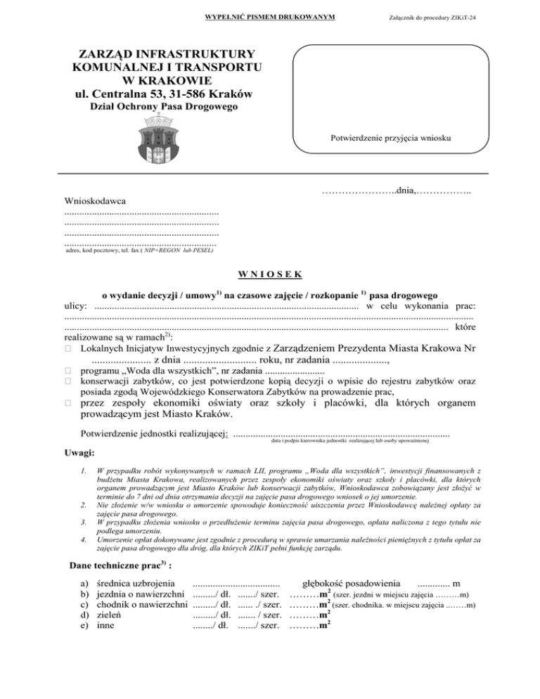 WYPEŁNIĆ PISMEM DRUKOWANYM Załącznik do procedury ZIKiT-24 ZARZĄD INFRASTRUKTURY KOMUNALNEJ I TRANSPORTU W KRAKOWIE ul. Centralna 53, 31-586 Kraków Dział Ochrony Pasa Drogowego Potwierdzenie przyjęcia wniosku …………………..dnia,…………….. Wnioskodawca .............................................................. .............................................................. .............................................................. ............................................................. adres, kod pocztowy, tel. fax ( NIP+REGON lub PESEL) WNIOSEK o wydanie decyzji / umowy1) na czasowe zajęcie / rozkopanie 1) pasa drogowego ulicy: .......................................................................................................... w celu wykonania prac: .................................................................................................................................................................... .......................................................................................................................................................... które realizowane są w ramach2): Lokalnych Inicjatyw Inwestycyjnych zgodnie z Zarządzeniem Prezydenta Miasta Krakowa Nr ...................... z dnia ........................... roku, nr zadania ...................., programu „Woda dla wszystkich”, nr zadania ........................ konserwacji zabytków, co jest potwierdzone kopią decyzji o wpisie do rejestru zabytków oraz posiada zgodą Wojewódzkiego Konserwatora Zabytków na prowadzenie prac, przez zespoły ekonomiki oświaty oraz szkoły i placówki, dla których organem prowadzącym jest Miasto Kraków. Potwierdzenie jednostki realizującej: ....................................................................................... data i podpis kierownika jednostki realizującej lub osoby upowaŜnionej Uwagi: 1. 2. 3. 4. W przypadku robót wykonywanych w ramach LII, programu „Woda dla wszystkich”, inwestycji finansowanych z budŜetu Miasta Krakowa, realizowanych przez zespoły ekonomiki oświaty oraz szkoły i placówki, dla których organem prowadzącym jest Miasto Kraków lub konserwacji zabytków, Wnioskodawca zobowiązany jest złoŜyć w terminie do 7 dni od dnia otrzymania decyzji na zajęcie pasa drogowego wniosek o jej umorzenie. Nie złoŜenie w/w wniosku o umorzenie spowoduje konieczność uiszczenia przez Wnioskodawcę naleŜnej opłaty za zajęcie pasa drogowego. W przypadku złoŜenia wniosku o przedłuŜenie terminu zajęcia pasa drogowego, opłata naliczona z tego tytułu nie podlega umorzeniu. Umorzenie opłat dokonywane jest zgodnie z procedurą w sprawie umarzania naleŜności pienięŜnych z tytułu opłat za zajęcie pasa drogowego dla dróg, dla których ZIKiT pełni funkcję zarządu. Dane techniczne prac3) : a) b) c) d) e) średnica uzbrojenia jezdnia o nawierzchni chodnik o nawierzchni zieleń inne ................................... ........./ dł. ......./ szer. ........./ dł. ...... ./ szer. ........./ dł. ....... / szer. ......../ dł. ......./ szer. głębokość posadowienia ............. m ………m2 (szer. jezdni w miejscu zajęcia ………m) ………m2 (szer. chodnika. w miejscu zajęcia ..……m) ………m2 ………m2 Nr uzgodnienia zarządcy drogi ………………………………………………………………. Nr zgody na wejście w teren ………………………………………………………………… Wykonawca: ______________________________ Odpowiedzialny kierownik robót 3): ______________________________ ______________________________ ______________________________ ______________________________ ______________________________ nazwa, adres, kod pocztowy, nr tel nazwa, adres, kod pocztowy, nr tel. Gł. księgowy Wnioskodawcy4) .................................................................................................. podpis, pieczęć Inspektor nadzoru4)................................................................................................................... nazwa jednostki, adres, nr tel., podpis Roboty mają być rozpoczęte w dniu ........................... i całkowicie zakończone łącznie z przywróceniem terenu do stanu pierwotnego i protokolarnym przekazaniem ZIKiT do dnia .................................. ,a w przypadku etapowania, zgodnie z harmonogramem, który stanowi załącznik do wniosku4). Wykonawca zobowiązany do oznakowania miejsca robót zgodnie z zatwierdzonym projektem zamiennej organizacji ruchu i ponosi odpowiedzialność za jego stan. Wykonawca oświadcza, Ŝe posiada pełny asortyment materiałów i sprzęt potrzebny do wykonania zgłoszonych robót. _____________________ _______________________ ______________________ podpis i pieczęć kierownika robót podpis i pieczęć imienna wnioskodawcy podpis i pieczęć wykonawcy Dane właściciela mediów3) (dla wystawienia decyzji administracyjnej dla dróg publicznych lub umowy cywilnoprawnej dla dróg wewnętrznych i naliczenia opłaty rocznej z tytułu umieszczenia mediów w pasie drogowym/). Nazwa firmy ............................................................................................................................................. Adres ........................................................................................................................................................ NIP ........................................................................................................................................................ ___________________ Pieczątka i podpis właściciela mediów I. WARUNKI UZYSKANIA DECYZJI: 1. Dołączyć do wniosku następujące załączniki *) 1) Zatwierdzony przez Zarząd Infrastruktury Komunalnej i Transportu projekt organizacji ruchu, jeŜeli zajęcie pasa drogowego wpływa na ruch drogowy lub ogranicza widoczność na drodze albo powoduje wprowadzenie zmian w istniejącej organizacji ruchu pojazdów lub