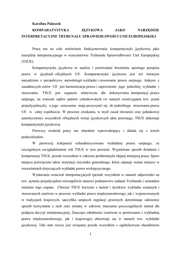 Karolina Paluszek KOMPARATYSTYKA JĘZYKOWA JAKO NARZĘDZIE INTERPRETACYJNE TRYBUNAŁU SPRAWIEDLIWOŚCI UNII EUROPEJSKIEJ Praca ma na celu omówienie funkcjonowania komparatystyki językowej jako narzędzia interpretacyjnego w orzecznictwie Trybunału Sprawiedliwości Unii Europejskiej (TSUE). Komparatystyka językowa to analiza i porównanie brzmienia spornego przepisu prawa w językach oficjalnych UE. Komparatystyka językowa jest też istotnym narzędziem z perspektywy metodologii wykładni i stosowania prawa unijnego. Jednym z zasadniczych celów UE jest harmonizacja prawa i zapewnienie jego jednolitej wykładni i stosowania. TSUE jest organem właściwym dla dokonywania interpretacji prawa unijnego, na wniosek sądów państw członkowskich (w ramach rozstrzygania tzw. pytań prejudycjalnych), a jego orzeczenia mają przyczynić się do jednolitego stosowania prawa UE w całej wspólnocie. W procesie orzekania, w myśl zasad równości oraz jednakowej autentyczności wszystkich oficjalnych wersji językowych aktu prawnego, TSUE dokonuje komparatystyki językowej. Pierwszy rozdział pracy ma charakter wprowadzający i składa się z trzech podrozdziałów. W pierwszej kolejności scharakteryzowano wykładnię prawa unijnego, ze szczególnym uwzględnieniem roli TSUE w tym procesie. Wyjaśniono sposób działania i kompetencje TSUE, przede wszystkim w zakresie problematyki objętej niniejszą pracą. Sporo miejsca poświęcono także instytucji rzecznika generalnego, która zajmuje ważne miejsce w rozważaniach dotyczących wykładni prawa wielojęzycznego. Wydawanie orzeczeń interpretacyjnych (przede wszystkim w ramach odpowiedzi na tzw. pytania prejudycjalne) niewątpliwie stanowi podstawowe zadanie Trybunału i uzasadnia istnienie tego organu. Chociaż TSUE korzysta z metod i dyrektyw wykładni uznanych i stosowanych zarówno w procesie wykładni prawa międzynarodowego, jak i wypracowanych w tradycjach krajowych, specyfika unijnych regulacji prawnych determinuje odmienny sposób korzystania z nich oraz zmiany w zakresie znaczenia poszczególnych metod dla podjęcia decyzji interpretacyjnej. Znaczące odrębności (zarówno w porównaniu z wykładnią prawa międzynarodowego, jak i krajowego) obserwuje się w ramach tzw. wykładni językowej. Taki stan rzeczy jest związany przede wszystkim z ogólnikowym charakterem 1 przepisów unijnych oraz ich znaczną otwartością pojęciową. Ten brak precyzji jest uznawany za rezultat specyficznego procesu tworzenia prawa UE - jest ono wynikiem kompromisu pomiędzy poszczególnymi państwami członkowskimi, a ścierające się w ramach UE systemy i tradycje prawne wymagają korzystania z bardziej ogólnych nazw, obejmujących swoim zakresem jak największą liczbę desygnatów. Akcentuje się ponadto, że nawet pojęcia wykształcone i stosowane w poszczególnych systemach prawnych, mają odrębne, autonomiczne znaczenie w kontekście unijnym. Naturalną konsekwencją takiego tworzenia prawa UE oraz prezentowanego stosunku do tradycyjnej terminologii, jest wzrost znaczenia innych niż językowa metod i dyrektyw wykładni, jak również wzrost roli orzecznictwa w wyjaśnianiu i doprecyzowaniu znaczenia niejednoznacznych pojęć. Wiodącą pozycję zajmuje tutaj TSUE, który, umocowany do służenia pomocą krajowym organom orzeczniczym w wykładni prawa unijnego, ma być gwarantem jednolitego stosowania tego prawa we wszystkich państwach członkowskich. Wielojęzyczność stanowi niewątpliwie jedną z cech prawa unijnego, niespotykaną na taką skalę w żadnym porządku krajowym ani międzynarodowym. Nawet w systemach nieograniczonych do jednego języka, status języka oficjalnego posiadają zwykle dwa lub co najwyżej kilka języków, podczas gdy w UE ich liczba sięga już dwudziestu czterech i stale wzrasta wraz z akcesją kolejnych państw członkowskich. Drugi z podrozdziałów pierwszej części pracy podejmuje problematykę wielojęzyczności w szerokim kontekście Unii Europejskiej, z uwzględnieniem jej wymiaru instytucjonalnego, szczególnej polityki językowej Wspólnoty, jak również wielojęzyczności systemu prawnego UE. Unia Europejska deklaruje głęboki szacunek do różnorodności językowej, gwarantowany szeregiem norm zawartych w jej prawie pierwotnym – przede wszystkim w Traktatach1 oraz Karcie Praw Podstawowych2, jak również w prawie wtórnym – to właśnie wielojęzyczności poświęcono pierwsze w historii rozporządzenie Wspólnot3. Zadanie koordynowania tej polityki oraz troski o jej rozwój powierzono jednemu z komisarzy, co również świadczy o doniosłości tej kwestii dla Zjednoczonej Europy. Poszczególne instytucje UE tworzą ponadto specjalne programy i strategie4, w których zobowiązują się do podejmowania różnorodnych działań na rzecz 1 Art. 3 i 55 TUE, art. 20 TFUE Art 31,22 I 41 Karty 3 Rozporządzenie Rady (EWG) nr 1/1958 w sprawie określenia systemu językowego Europejskiej Wspólnoty Gospodarczej. 4 Np. Communications from the Commission: New Framework Strategy for Multilingualism from 2005” i “Multilingualism: an Asset for Europe and a Shared Commitment from 2008”, oraz Council Resolution of 21 November 2008 on a European strategy for multilingualism. 2 2 wspierania wielojęzyczności.5 Praktyka funkcjonowania instytucji UE wskazuje jednak, że mimo górnolotnych deklaracji liczba wykorzystywanych w codziennej praktyce języków ogranicza się do dwóch lub trzech języków. Pozytywnym wyjątkiem jest tutaj Parlament Europejski, który rzeczywiście funkcjonuje we wszystkich językach oficjalnych. Co więcej, wdrożył specjalny system „zarządzania wielojęzycznością”6, który pozwala organizować pracę tłumaczy ustnych i pisemnych, wprowadza procedury i terminy zamawiania tłumaczeń, reguluje obieg dokumentów, jak również obliguje jednostki organizacyjne Parlamentu do tworzenia profili językowych, na podstawie których analizuje się sposób korzystania przez n