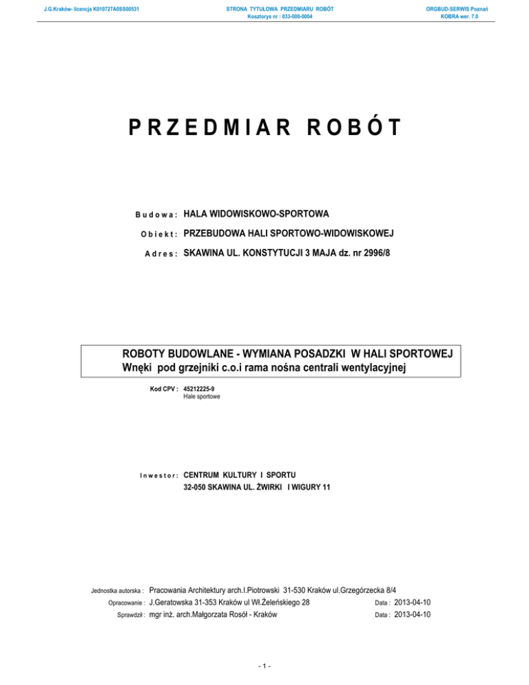 J.G.Kraków- licencja K010727A0SS00531 STRONA TYTUŁOWA PRZEDMIARU ROBÓT Kosztorys nr : 033-000-0004 ORGBUD-SERWIS Poznań KOBRA wer. 7.0 PRZEDMIAR ROBÓT Budowa: HALA WIDOWISKOWO-SPORTOWA Obiekt: PRZEBUDOWA HALI SPORTOWO-WIDOWISKOWEJ Adres: SKAWINA UL. KONSTYTUCJI 3 MAJA dz. nr 2996/8 ROBOTY BUDOWLANE - WYMIANA POSADZKI W HALI SPORTOWEJ Wnęki pod grzejniki c.o.i rama nośna centrali wentylacyjnej Kod CPV : 45212225-9 Hale sportowe Inwestor: CENTRUM KULTURY I SPORTU 32-050 SKAWINA UL. śWIRKI I WIGURY 11 Jednostka autorska : Opracowanie : Sprawdził : Pracowania Architektury arch.I.Piotrowski 31-530 Kraków ul.Grzegórzecka 8/4 J.Geratowska 31-353 Kraków ul Wł.śeleńskiego 28 Data : 2013-04-10 mgr inŜ. arch.Małgorzata Rosół - Kraków Data : 2013-04-10 -1- J.G.Kraków- licencja K010727A0SS00531 SPIS DZIAŁÓW PRZEDMIARU Kosztorys nr : 033-000-0004 Budowa: Obiekt: Adres: Opis robót : Data : 2013-04-10 ORGBUD-SERWIS Poznań KOBRA wer. 7.0 HALA WIDOWISKOWO-SPORTOWA PRZEBUDOWA HALI SPORTOWO-WIDOWISKOWEJ SKAWINA UL. KONSTYTUCJI 3 MAJA dz. nr 2996/8 ROBOTY BUDOWLANE - WYMIANA POSADZKI W HALI SPORTOWEJ Wnęki pod grzejniki c.o.i rama nośna centrali wentylacyjnej SPIS DZIAŁÓW PRZEDMIARU Lp. Opis stanu / elementu A . STAN : WYMIANA POSADZKI SPORTOWEJ a. Wuburzenia i rozbiórki b. PodłoŜe pod posadzkę sportową c. Posadzka sportowa - system podłogi sportowej np.JUNCKERS Duo BAT 110 + Buk Premium- B . STAN : KANAŁ CENTRALNEGO OGRZEWANIA d. DemontaŜe i rozbiórki e. Roboty budowlane C . STAN : WNĘKI NA GRZEJNIKI CO f. NadproŜa w zewnętrznej ścianie- wykucia g. Roboty budowlane h. Osłony grzejników D . STAN : RAMA NOŚNA CENTRALI WENTYLACYJNEJ i. Roboty budowlane - - - Koniec wydruku spisu działów przedmiaru - - - -2- Str: 1 J.G.Kraków- licencja K010727A0SS00531 PRZEDMIAR ROBÓT Kosztorys nr : 033-000-0004 Budowa: Obiekt: Adres: Opis robót : Data : 2013-04-10 Lp. ORGBUD-SERWIS Poznań KOBRA wer. 7.0 HALA WIDOWISKOWO-SPORTOWA PRZEBUDOWA HALI SPORTOWO-WIDOWISKOWEJ SKAWINA UL. KONSTYTUCJI 3 MAJA dz. nr 2996/8 ROBOTY BUDOWLANE - WYMIANA POSADZKI W HALI SPORTOWEJ Wnęki pod grzejniki c.o.i rama nośna centrali wentylacyjnej Podstawa kalkulacji / Opis pozycji Str: 1 Ilość Jedn. miary A. STAN : WYMIANA POSADZKI SPORTOWEJ a. ELEMENT : Wuburzenia i rozbiórki Numer specyfikacji : 45111100-9 Poz. 1. KNR 401-0816-06-20 IGM Warszawa 546,530 m2 Rozebranie posadzek z deszczułek nie nadających się do ponownego wbudowania, z oderwaniem listew lub cokołów, w sali gimnastycznej Numer specyfikacji : 45111100-9 Opis pozycji obmiaru WyraŜenie arytmetyczne pom.030 : Poz. 2. KNR 401-0428-01-00 IGM Warszawa Wynik 546,53 = 546,530 Razem obmiar = 546,530 546,530 m2 Rozebranie podłóg drewnianych: ślepych Numer specyfikacji : 45111100-9 Opis pozycji obmiaru WyraŜenie arytmetyczne j.w. : Poz. 3. KNR 401-0609-03-00 IGM Warszawa Wynik 546,53 = 546,530 Razem obmiar = 546,530 546,530 m2 Rozebranie izolacji np. z wełny mineralnej Numer specyfikacji : 45111100-9 Opis pozycji obmiaru WyraŜenie arytmetyczne j.w. : Poz. 4. KNR 401-0212-01-00 IGM Warszawa Wynik 546,53 = 546,530 Razem obmiar = 546,530 10,931 m3 Rozebranie - ręczne rozbicie elementów konstrukcji betonowych: wylewki cementowej Numer specyfikacji : 45111100-9 Opis pozycji obmiaru WyraŜenie arytmetyczne j.w. : Poz. 5. KNR 401-0106-04-00 IGM Warszawa Wynik 546,53*0,02 = 10,931 Razem obmiar = 10,931 212,328 m3 Usunięcie z budynku gruzu bez względu na kategorię: z parteru Numer specyfikacji : 45111100-9 Opis pozycji obmiaru WyraŜenie arytmetyczne przyjmuje się dodatkowo 5 % na inne : -3- Wynik 546,53*0,35+10,931 = 202,217*0,05 = 202,217 10,111 Razem obmiar = 212,328 J.G.Kraków- licencja K010727A0SS00531 PRZEDMIAR ROBÓT Kosztorys nr : 033-000-0004 Opis robót : STAN : Data : 2013-04-10 Lp. ELEMENT : ORGBUD-SERWIS Poznań KOBRA wer. 7.0 ROBOTY BUDOWLANE - WYMIANA POSADZKI W HALI SPORTOWEJ Wnęki pod grzejniki c.o.i rama nośna centrali wentylacyjnej A. WYMIANA POSADZKI SPORTOWEJ a. Wuburzenia i rozbiórki Podstawa kalkulacji / Opis pozycji Str: 2 Ilość Poz. 6. KNR 401-0108-11-00 IGM Warszawa Jedn. miary 212,328 m3 Wywiezienie gruzu spryzmowanego samochodami samowyładowczymi, z załadowaniem i wyładowaniem, na odległość: do 1 km Przyjmuje się do KU na odl. 5 km Numer specyfikacji : 45111220-6 Opis pozycji obmiaru WyraŜenie arytmetyczne Wynik 212,328 = 212,328 Razem obmiar = 212,328 Poz. 7. KNR 401-0108-12-00 IGM Warszawa 849,312 m3 Wywiezienie gruzu spryzmowanego samochodami samowyładowczymi, z załadowaniem i wyładowaniem, na odległość: za kaŜdy następny 1 km 5-1=4 x S Numer specyfikacji : 45111220-6 Opis pozycji obmiaru WyraŜenie arytmetyczne Wynik ( 212,328 ) * ( 4 ) = 849,312 Razem obmiar = 849,312 b. ELEMENT : PodłoŜe pod posadzkę sportową Numer specyfikacji : 45432114-6 Poz. 8. KNNR 002-0604-01-00 MRRiB 546,530 m2 Izolacje z folii polietylenowej grub. 0,2 mm ( np. f-my ONDULINE) - poziome podposadzkowe- w nakładach M naleŜy pozostawić tylko folię Numer specyfikacji : 45432114-6 Opis pozycji obmiaru WyraŜenie arytmetyczne Wynik pom.030 : 546,53 = 546,530 Razem obmiar = 546,530 Poz. 9. KNNR 002-0602-03-00 MRRiB 546,530 m2 Izolacje przeciwdźwiekowe poziome z płyt styropianowych, układanych na wierzchu konstrukcji na sucho - jednowarstwowe- grub. 8 do 10 cm Numer specyfikacji : 45432114-6 Opis pozycji obmiaru WyraŜenie arytmetyczne Wynik 546,53 = 546,530 Razem obmiar = 546,530 Poz. 10. KNNR 002-0604-01-00 MRRiB 546,530 m2 Izolacje z folii polietylenowej grub. 0,2 mm (np. f-my ONDULINE) - poziome podposadzkowe- w nakładach M naleŜy pozostawić tylko folię Numer specyfikacji : 45432114-6 Opis pozycji obmiaru WyraŜenie arytmetyczne -4- Wynik 546,53 = 546,530 Razem obmiar = 546,530 J.G.Kraków- licencja K010727A0SS00531 PRZEDMIAR ROBÓT Kosztorys nr : 033-000-0004 Opis robót : STAN : Data : 2013-04-10 Lp. ELEMENT : ORGBUD-SERWIS Poznań KOBRA wer. 7.0 ROBOTY BUDOWLANE - WYMIANA POSADZKI W HALI SPORT