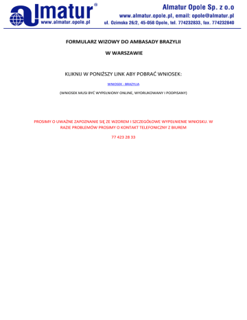 FORMULARZ WIZOWY DO AMBASADY BRAZYLII W WARSZAWIE KLIKNIJ W PONIŻSZY LINK ABY POBRAD WNIOSEK: WNIOSEK - BRAZYLIA (WNIOSEK MUSI BYD WYPEŁNIONY ONLINE, WYDRUKOWANY I PODPISANY) PROSIMY O UWAŻNE ZAPOZNANIE SIĘ ZE WZOREM I SZCZEGÓŁOWE WYPEŁNIENIE WNIOSKU. W RAZIE PROBLEMÓW PROSIMY O KONTAKT TELEFONICZNY Z BIUREM 77 423 28 33