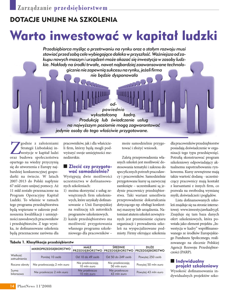 Zarządzanie przedsiębiorstwem Dotacje unijne na szkolenia Warto inwestować w kapitał ludzki Przedsiębiorca myśląc o przetrwaniu na rynku oraz o stałym rozwoju musi stawiać przed sobą cele wybiegające daleko w przyszłość. Ważniejsza od zakupu nowych maszyn i urządzeń może okazać się inwestycja w zasoby ludzkie. Nakłady na środki trwałe, nawet najbardziej zaawansowane technologicznie nie zapewnią sukcesu na rynku, jeżeli firma nie będzie dysponowała odpowiednio wykształconą kadrą. Produkcję lub świadczenie usług na najwyższym poziomie mogą zagwarantować jedynie osoby do tego właściwie przygotowane. Z godnie z założeniami Strategii Lizbońskiej inwestycje w kapitał ludzi oraz budowa społeczeństwa opartego na wiedzy przyczynią się do utworzenia z Europy najbardziej konkurencyjnej gospodarki na świecie. W latach 2007-2013 do Polski napłynie 67 mld euro unijnej pomocy. Aż 11 mld zostało przeznaczone na Program Operacyjny Kapitał Ludzki. To właśnie w ramach tego programu przedsiębiorstwa będą wspierane w zakresie podnoszenia kwalifikacji i umiejętności zawodowych pracowników i przedsiębiorców. Z tego wynika, że dofinansowane szkolenia będą przeznaczone zarówna dla pracowników, jak i dla właścicieli firm, którzy będą mogli podwyższyć swoje umiejętności menedżerskie. Zlecić czy przygoto- wać samodzielnie? Występują dwie możliwości uczestnictwa w dofinansowanych szkoleniach: 1) można skorzystać z usług zewnętrznych firm szkoleniowych, które uzyskały dofinansowanie z Unii Europejskiej na realizację ich autorskich programów szkoleniowych. 2) każde przedsiębiorstwo ma możliwość przygotowania własnego programu szkoleniowego dla pracowników – może samodzielnie przygotować i złożyć wniosek. Zaletą przeprowadzenia własnych szkoleń jest możliwość dostosowania tematyki i zakresu do specyficznych potrzeb pracodawcy i pracowników. Samodzielnie przygotowane kursy są zazwyczaj zamknięte – uczestnikami są jedynie pracownicy przedsiębiorstwa. Taki wariant umożliwia przeprowadzenie dokształcania dotyczącego np. obsługi konkretnej maszyny lub urządzenia. Natomiast atutem szkoleń zewnętrznych jest przeniesienie ciężaru organizacji i prowadzenia szkoleń na wyspecjalizowane podmioty. Firmy oferujące szkolenia Tabela 1. Klasyfikacja przedsiębiorstw Mikroprzedsiębiorstwo Wielkość zatrudnienia Roczne obroty Suma bilansowa Małe Średnie Duże przedsiębiorstwo przedsiębiorstwo przedsiębiorstwo Poniżej 10 osób Od 10 do 49 osób Od 50 do 249 osób Powyżej 250 osób Nie przekraczają 2 mln euro Nie przekraczają 10 mln euro Nie przekraczają 50 mln euro Powyżej 50 mln euro Nie przekracza 2 mln euro Nie przekracza 10 mln euro Nie przekracza 43 mln euro Powyżej 43 mln euro 14 PlastNews 11’2008 dla pracowników przedsiębiorstw posiadają doświadczenie w organizacji tego typu przedsięwzięć. Potrafią skonstruować program szkoleniowy odpowiadający aktualnemu zapotrzebowaniu rynkowemu. Kursy zewnętrzne mają także wartość dodaną - uczestniczący pracownicy mają kontakt z kursantami z innych firm, co pozwala na swobodną wymianę myśli, doświadczeń i poglądów. Lista dofinansowanych szkoleń znajduje się na stronie internetowej: www.inwestycjawkadry.pl. Znajduje się tam baza danych ofert szkoleniowych, która powstała jako element projektu „Inwestycja w kadry” współfinansowanego ze środków Europejskiego Funduszu Społecznego, realizowanego na zlecenie Polskiej Agencji Rozwoju Przedsiębiorczości (PARP). Indywidualny projekt szkoleniowy Wysokość dofinansowania indywidualnych projektów szko- Zarządzanie przedsiębiorstwem leniowych dla przedsiębiorstw zależy od dwóch czynników tj.: a) wielkości przedsiębiorstwa (tabela 1); b) rodzaju szkoleń: ogólne – są to szkolenia teoretyczne lub praktyczne prowadzące do zdobycia przez pracownika kwalifikacji, które będzie mógł wykorzystać zarówno na obecnym, jak i na przyszłych stanowiskach pracy. specjalistyczne – są to szkolenia teoretyczne lub praktyczne prowadzące do zdobycia przez pracownika kwalifikacji zasadniczo i bezpośrednio przydatnych na obecnym lub przyszłym stanowisku pracy u danego pracodawcy oraz bezpośrednio powiązane ze specyfiką prowadzonej przez niego działalności. Dofinansowanie do szkoleń ogólnych wynosi: 80% kosztów kwalifikowanych – w przypadku mikro-, małych i średnich przedsiębiorstw; 60% kosztów kwalifikowanych – w przypadku dużych firm. Dofinansowanie do szkoleń specjalistycznych wynosi: 45% kosztów kwalifikowanych – w przypadku mikro-, małych i średnich przedsiębiorstw; 35% kosztów kwalifikowanych – w przypadku dużych firm. Dodatkowo, jeżeli ze szkoleń skorzystają pracownicy w tzw. gorszym położeniu, poziom wsparcia może zostać podniesiony o 10%. Gdzie szukać wsparcia? Bezpośrednio przedsiębiorcy mogą się starać o dofinansowanie z dwóch działań w ramach Programu Operacyjnego Kapitał Ludzki: 1) 2.1.1. „Rozwój kapitału ludzkiego w przedsiębiorstwach” Za realizację działania odpowiada Polska Agencja Rozwoju Przedsiębiorczości (PARP). W ramach działania można uzyskać dofinansowanie na projekty o znacznej wartości (powyżej 400 tys. zł) oraz takie, które będą realizowane w przynajmniej dwóch województwach. Typy projektów, które mogą uzyskać dofinansowanie to: a) ponadregionalne zamknięte projekty szkoleń (ogólnych i specjalistycznych) i doradztwa dla przedsiębiorców oraz pracowników przedsiębiorstw, przygotowane w oparciu o indywidualne strategie rozwoju firm – beneficjentami pomocy mogą być przedsiębiorstwa posiadające struktury organizacyjne (przedstawicielstwa, filie, oddziały) w co najmniej 2 województwach. b) ogólnopolskie otwarte projekty szkoleń (ogólnych i specjalistycznych) i doradztwa dla przedsiębiorców oraz pracowników przedsiębiorstw – dotyczy projektów realizowanych w c