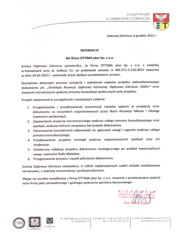 UrzadMiejski wDABROWiEGORNiCZEj Dabrowaedm働,8g…dnie2015r・ 京離京をNG惟 db偶rmYOmM山鳩Sp.義0.か Gmina Dabrowa Gemic翰IPtm面erdza′∴e Grma oTTIMA pn絶Sp・基〇・〇・Z Siedziba wKatowicach叩YuI“Ga”usa12.napol譲粛WieumowynrBRl・271・S・210・2015zatAlartej wdniu24.02.201Sr.wYkonaIapracebedaceprzedmiotemumcwy; oomの請〝○め胸健p靴制印加ddim鵬enb,崎Wp面撮り如ぬ′0施OWOn印O do血mu旭日的.〝5調的細舵叩iu的b′oWy儲mi健也的bmWoGdm胸贈2020を”om w印o備わmemo岬ep〟優oSp朋偽り他誌u同前軸αn畑面p呼住持u・ projehc的rrloWalwszczegdlnoScinastepujaceZadania: 1.Przvgotowanieiprzedstawierlie prezenta創「Zapisdw tJjetYCh w proie脆e wItA, dckumenturtaws∼ySlkichorB的izowahYdhprzezBiu競)RozYtqiuMiastaiobsllJgi Inwesto鴫Spotbhiach. 2.230ewniehieYYSParCiamerYtorYCZrCgoPt血ascaleBopr∝eSUkonsu的cYibegoorilZ spotkah,PCdczasktbrYchomawianYbYIproiektdonmehtu・ 3.opracowaniekompletnychodpowiedZinazgbszanetMagiiStJgeStiepodaa catego ProCeSIJkonSqltacYinego・ 4.przedstawienie proienu Strategji pcdczas orgahi∼oWanYCh spotkah oraz∴kh m∝le前句8. 5.0statecBl議書redakcjaproj曲調donmerltuStrateBicznegopca両州zieewentuaInych wagizast同慶eRadYMiejskiej・ 6.przvgotowanie叩X:eSuizaSadwdroier,iadokumehtu・ GminaDabrowaGemiczazaSYYiad優a′iacabStzapIa…調anYchzadariztI崎taIazrealizotAIana termihoWo.Z噌成ytastaranno鈍iaiprofeSjohalizmem・ MajacnaLIWadze”SpdtpracezfmaOTmMMplusSp・Z〇・〇・mCiemYZfrZetohaniem的Ieeie w/tAIfimejakosprawdZerlegoigofI能goPCleceniapartnerabかeSOMrego・ 4”00D書誌喜藷iCentra霊浩器器鵠ie一m黒沼蕊岩浩需