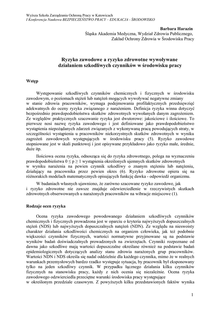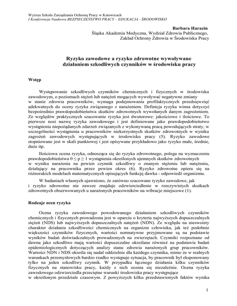 Wyższa Szkoła Zarządzania Ochroną Pracy w Katowicach I Konferencja Naukowa BEZPIECZEŃSTWO PRACY – EDUKACJA - ŚRODOWISKO Barbara Harazin Śląska Akademia Medyczna, Wydział Zdrowia Publicznego, Zakład Ochrony Zdrowia w Środowisku Pracy Ryzyko zawodowe a ryzyko zdrowotne wywoływane działaniem szkodliwych czynników w środowisku pracy Wstęp Występowanie szkodliwych czynników chemicznych i fizycznych w środowisku zawodowym, o poziomach stężeń lub natężeń mogących wywoływać negatywne zmiany w stanie zdrowia pracowników, wymaga podejmowania profilaktycznych przedsięwzięć adekwatnych do oceny ryzyka związanego z narażeniem. Definicja ryzyka winna dotyczyć bezpośrednio prawdopodobieństwa skutków zdrowotnych wywołanych danym zagrożeniem. Ze względów praktycznych szacowanie ryzyka jest dwutorowe: jakościowe i ilościowe. To pierwsze nosi nazwę ryzyka zawodowego i jest definiowane jako prawdopodobieństwo wystąpienia niepożądanych zdarzeń związanych z wykonywaną pracą powodujących straty, w szczególności wystąpienia u pracowników niekorzystnych skutków zdrowotnych w wyniku zagrożeń zawodowych występujących w środowisku pracy (5). Ryzyko zawodowe stopniowane jest w skali punktowej i jest opisywane przykładowo jako ryzyko małe, średnie, duże itp. Ilościowa ocena ryzyka, odnosząca się do ryzyka zdrowotnego, polega na wyznaczeniu prawdopodobieństwa 0 ≤ p ≥ 1 wystąpienia określonych ujemnych skutków zdrowotnych w wyniku narażenia na pewien czynnik szkodliwy o znanym stężeniu lub natężeniu, działający na pracownika przez pewien okres (6). Ryzyko zdrowotne opiera się na różnorakich modelach matematycznych opisujących funkcję dawka - odpowiedź organizmu. W badaniach własnych ujawniono, że zarówno szacowane ryzyko zawodowe, jak i ryzyko zdrowotne nie zawsze znajduje odzwierciedlenie w rzeczywistych skutkach zdrowotnych obserwowanych u narażonych pracowników na wibracje miejscowe (1). Rodzaje ocen ryzyka Ocena ryzyka zawodowego powodowanego działaniem szkodliwych czynników chemicznych i fizycznych prowadzona jest w oparciu o kryteria najwyższych dopuszczalnych stężeń (NDS) lub najwyższych dopuszczalnych natężeń (NDN). Ze względu na nieswoisty charakter działania szkodliwości chemicznych na organizm człowieka, jak też podobnie większości czynników fizycznych, wartości normatywne przyjmowane są na podstawie wyników badań doświadczalnych prowadzonych na zwierzętach. Czynniki rozpoznane od dawna jako szkodliwe mają wartości dopuszczalne określane również na podstawie badań epidemiologicznych dotyczących analizy stanu zdrowia narażonych grup pracowników. Wartości NDN i NDS określa się nadal oddzielnie dla każdego czynnika, mimo że w realnych warunkach przemysłowych bardzo rzadko występuje sytuacja, by pracownik był eksponowany tylko na jeden szkodliwy czynnik. W przypadku łącznego działania kilku czynników fizycznych na stanowisku pracy, każdy z nich ocenia się niezależnie. Ocena ryzyka zawodowego odzwierciedla przeciętne warunki środowiska pracy występujące w określonym przedziale czasowym. Z powyższych kilku przedstawionych faktów wynika 1 Wyższa Szkoła Zarządzania Ochroną Pracy w Katowicach I Konferencja Naukowa BEZPIECZEŃSTWO PRACY – EDUKACJA - ŚRODOWISKO zatem, że ocena ryzyka zawodowego nie zawsze będzie w pełni odzwierciedlała ujemne efekty w stanie zdrowia narażonych pracowników. Zależności funkcyjne dawka-odpowiedź organizmu wykorzystywane są w ilościowych metodach oceny ryzyka zdrowotnego. W metodach tych stosuje się matematyczne modele liniowe i nieliniowe, w których zależność dawka – odpowiedź uzyskiwana jest na podstawie rezultatów doświadczeń na zwierzętach oraz na podstawie badań epidemiologicznych. Wielkość ryzyka zdrowotnego może być oszacowana dla dowolnego poziomu narażenia i dowolnego czasu zatrudnienia w warunkach wybranej ekspozycji. Zatem prawdopodobieństwo utraty zdrowia może być określone hipotetycznie lub może się odnosić do pracowników zatrudnionych w zdefiniowanych warunkach pracy. Ocena ryzyka utraty zdrowia może więc być oszacowana, bądź w oparciu o NDS lub NDN, bądź w oparciu o wybrany model matematyczny zależności dawka-odpowiedź organizmu. W pierwszym przypadku niezbędna jest informacja o wielkości narażenia, a w drugim dodatkowo ocenę ryzyka należy odnieść do okresu narażenia. Rzeczywiste ryzyko zdrowotne jest jednakże modyfikowane wieloma innymi czynnikami nie uwzględnianymi, ani w przyjętych wartościach NDS lub NDN, ani w wybranych modelach matematycznych opisujących zależność między narażeniem na daną szkodliwość a ujemnymi skutkami zdrowotnymi. Oszacowanie faktycznego ryzyka zdrowotnego może być dokonane jedynie na podstawie wyników badań medycznych wykonanych u pracowników. Ten trzeci rodzaj szacowania ryzyka zdrowotnego, polegający na weryfikacji badaniami lekarskimi wybranego modelu matematycznego zależności dawkaodpowiedź organizmu, odnosi się do konkretnych pracowników oraz do utworzonych przez nich grup zawodowych, zatrudnionych w zdefiniowanych warunkach narażenia z indywidualną historią przebiegu pracy zawodowej. Porównanie trzech rodzajów ocen ryzyka utraty zdrowia przez pracowników narażonych na szkodliwości zawodowe przedstawiono w Tabeli 1. Porównanie dotyczy obiektu oceny, metody i wyników oceny. Tabela 1. Rodzaje ocen ryzyka utraty zdrowia przez pracowników narażonych na szkodliwości zawodowe Ocena ryzyka zawodowego Obiekt oceny Indywidualne stanowiska pracy, grupy stanowisk Metody oceny Szacowanie jakościowe Przedział czasu narażenia uwzględniany w ocenie Wyniki oceny Zmiana robocza, tydzień pracy Higieniczna ocena stanowisk zdrowotnego opartego na modelach matematycznych Poszczególne osoby lub grupy pracowników wraz z oceną narażenia Ilościowa ocena oparta na modelach matematycznych Okres zatrudnienia w na