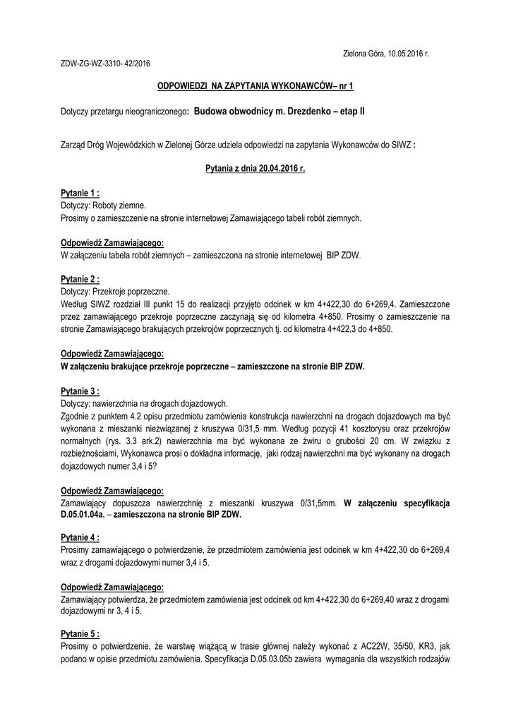Zielona Góra, 10.05.2016 r. ZDW-ZG-WZ-3310- 42/2016 ODPOWIEDZI NA ZAPYTANIA WYKONAWCÓW– nr 1 Dotyczy przetargu nieograniczonego: Budowa obwodnicy m. Drezdenko – etap II Zarząd Dróg Wojewódzkich w Zielonej Górze udziela odpowiedzi na zapytania Wykonawców do SIWZ : Pytania z dnia 20.04.2016 r. Pytanie 1 : Dotyczy: Roboty ziemne. Prosimy o zamieszczenie na stronie internetowej Zamawiającego tabeli robót ziemnych. Odpowiedź Zamawiającego: W załączeniu tabela robót ziemnych – zamieszczona na stronie internetowej BIP ZDW. Pytanie 2 : Dotyczy: Przekroje poprzeczne. Według SIWZ rozdział III punkt 15 do realizacji przyjęto odcinek w km 4+422,30 do 6+269,4. Zamieszczone przez zamawiającego przekroje poprzeczne zaczynają się od kilometra 4+850. Prosimy o zamieszczenie na stronie Zamawiającego brakujących przekrojów poprzecznych tj. od kilometra 4+422,3 do 4+850. Odpowiedź Zamawiającego: W załączeniu brakujące przekroje poprzeczne – zamieszczone na stronie BIP ZDW. Pytanie 3 : Dotyczy: nawierzchnia na drogach dojazdowych. Zgodnie z punktem 4.2 opisu przedmiotu zamówienia konstrukcja nawierzchni na drogach dojazdowych ma być wykonana z mieszanki niezwiązanej z kruszywa 0/31,5 mm. Według pozycji 41 kosztorysu oraz przekrojów normalnych (rys. 3.3 ark.2) nawierzchnia ma być wykonana ze żwiru o grubości 20 cm. W związku z rozbieżnościami, Wykonawca prosi o dokładna informację, jaki rodzaj nawierzchni ma być wykonany na drogach dojazdowych numer 3,4 i 5? Odpowiedź Zamawiającego: Zamawiający dopuszcza nawierzchnię z mieszanki kruszywa 0/31,5mm. W załączeniu specyfikacja D.05.01.04a. – zamieszczona na stronie BIP ZDW. Pytanie 4 : Prosimy zamawiającego o potwierdzenie, że przedmiotem zamówienia jest odcinek w km 4+422,30 do 6+269,4 wraz z drogami dojazdowymi numer 3,4 i 5. Odpowiedź Zamawiającego: Zamawiający potwierdza, że przedmiotem zamówienia jest odcinek od km 4+422,30 do 6+269,40 wraz z drogami dojazdowymi nr 3, 4 i 5. Pytanie 5 : Prosimy o potwierdzenie, że warstwę wiążącą w trasie głównej należy wykonać z AC22W, 35/50, KR3, jak podano w opisie przedmiotu zamówienia. Specyfikacja D.05.03.05b zawiera wymagania dla wszystkich rodzajów mma do warstwy wiążącej, jednakże pogrubioną czcionką wskazano typ mieszanki AC 16W. Zgodnie z opisem przedmiotu zamówienia AC 16W należy zastosować jedynie na zjazdach. Odpowiedź Zamawiającego: Warstwa wiążąca na trasie głównej to AC22W gr. 9cm, na zjazdach natomiast AC16W. W SST D.05.03.05b tablice dotyczą wymagań dla wszystkich mieszanek. Pytania z dnia 26.04.2016 r. Pytanie 1 : Dotyczy.04.05.01 a Podbudowa i ulepszone podłoże z gruntu lub kruszywa stabilizowanego cementem o grubości 12 i 16 cm Prosimy o wyjaśnienie jaką wytrzymałość na ściskanie powinien mieć grunt stabilizowany cementem W rozdziale III SiWZ „Opis przedmiotu zamówienia" w punkcie 4.2 wartość wytrzymałości na ściskanie gruntu stabilizowanego cementem to 2,5 MPa. W SST w rozdziale dotyczącym gruntu stabilizowanego cementem w tablicy 4 na stronie 122 podana jest klasa wytrzymałości na ściskanie C 1,5/2,0. W części rysunkowej „Przekroje normalne -trasa zasadnicza" rysunek nr 3.2 w tabeli z oznaczeniami podana jest wartość wytrzymałości na ściskanie 5,0 MPa W celu wykonania prawidłowej wyceny robót Wykonawca prosi o podanie dokładnej wytrzymałości na ściskanie gruntu stabilizowanego cementem o grubości 12 i 16 cm. Odpowiedź Zamawiającego: W związku z rozbieżnościami w opisach dotyczących warstw podbudowy z gruntu stabilizowanego cementem, Zamawiający wyjaśnia, że należy przyjąć do wyceny: - warstwę z gruntu stabilizowanego cementem C1,5/2,0 gr. 12cm. W związku z tym ulega zmianie opis pozycji nr 36 formularza cenowego „A” oraz zapis w pk. 1.3 SST D.04.05.01a - wykonanie podbudowy z kruszywa stabilizowanego cementem C5/6, śr. gr. w-wy 16cm. W związku z tym ulega zmianie opis pozycji nr 37 formularza cenowego „A” oraz zapis w pk. 1.3 SST D.04.05.01a. W załączeniu zamienny formularz cenowy „A”, zamieszczony na stronie BIP ZDW w wersji edytowalnej celem wykorzystania przy składaniu oferty. Pytanie 2 : Dotyczy: D-05.01.03 Nawierzchnia żwirowa. Zgodnie z krzywą uziarnienia znajdującą się na stronie 162 SST nawierzchnia żwirowa powinna mieścić się pomiędzy krzywymi granicznymi a1 i b1co daje uziarnieme mieszanki 0/20 mm. Według wiedzy i doświadczenia Wykonawcy firmy produkujące kruszywa nie posiadają w swojej ofercie mieszanek o uziemieniu 0/20. Prosimy o informację czy Zamawiający dopuszcza żwir na nawierzchnię o uziarmeniu 0/16 iub 9/31,5 mm? Odpowiedź Zamawiającego: Zamawiający dopuszcza nawierzchnię z mieszanki kruszywa 0/31,5. W załączeniu specyfikacja D.05.01.04a. – zamieszczona stronie BIP ZDW. Pytanie 3 : Prosimy o zamieszczenie na stronie Zamawiającego zestawienia drzew przeznaczonych do wycinki. Prosimy o zamieszczenie w zestawieniu następujących danych: - średnicę drzewa przeznaczonego do wycinki - gatunek drzewa przeznaczonego do wycinki - numer drzewa do wycinki odpowiadający numerowi z planu sytuacyjnego Odpowiedź Zamawiającego: W załączeniu wykaz drzew przeznaczonych do wycinki – zamieszczony na stronie BIP ZDW. Pytanie 4 : W opisie technicznym dotyczącym „Wzmocnienia podłoża, korpusu i zabezpieczenia skarp nasypu przed erozją' dokonano podziału geosyntetyków ze względu na wytrzymałość krótkoterminową na dwa typy - geosyntetyk typu A o Fd = 25 kN/m i Fk = 100,00 kN - geosyntetyk typu B o Fd = 50 KN/m i Fk = 200,00 kN/m W kosztorysie w pozycjach 21 i 22 są wyszczególnione geosyntetyki o następujących parametrach: -Ułożenie zbrojenia nasypu z geotkaniny o wytrzymałości Fd = 50 kN/m. Fk = 100 kN/m - geosyntetyk typu B - Ułożenie zbrojenia nasypu z geotkaniny o wytrzymałości Fd = 25 kN/m, Fk = 200 kN/m - geosyntetyk typu A W SST parametry geosyntetyków są zgodne z tymi z koszt