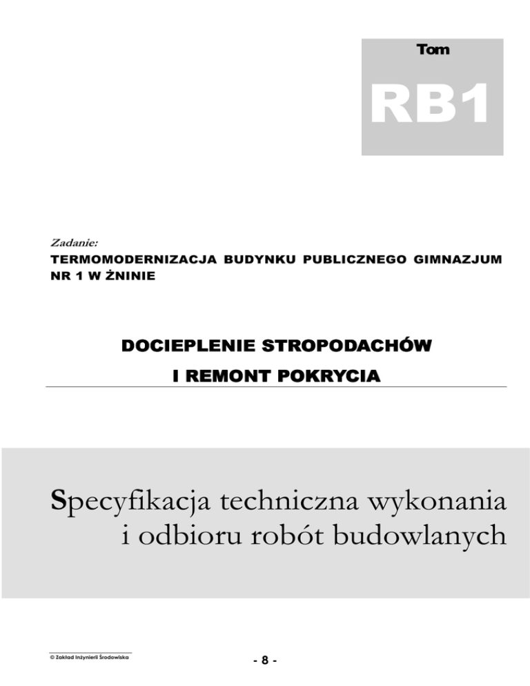 Tom RB1 Zadanie: TERMOMODERNIZACJA BUDYNKU PUBLICZNEGO GIMNAZJUM NR 1 W śNINIE DOCIEPLENIE STROPODACH STROPODACHÓW DACHÓW I REMONT POKRYCIA Specyfikacja techniczna wykonania i odbioru robót budowlanych © Zakład InŜynierii Środowiska -8- 1. Wstęp 1.1. Przedmiot specyfikacji Przedmiotem niniejszej specyfikacji technicznej są wymagania dotyczące wykonania i odbioru robót związanych z dociepleniem stropodachu i remontem pokrycia wraz z innymi robotami towarzyszącymi związanymi z montaŜem kominków wentylacyjnych, wymianą instalacji odgromowej, wymianą obróbek blacharskich, itp. w obiekcie objętym zamówieniem. 1.2. Zakres stosowania specyfikacji Szczegółowa specyfikacja techniczna jest stosowana jako dokument przetargowy i kontraktowy przy zlecaniu i realizacji robót wymienionych w pkt. 1.1. 1.3. Zakres robót objętych specyfikacją Roboty, których dotyczy specyfikacja, obejmują wszystkie czynności umoŜliwiające i mające na celu wykonanie docieplenia stropodachu. 45400000-1 Roboty wykończeniowe w zakresie obiektów budowlanych. 1.4. Ogólne wymagania dotyczące robót Wykonawca robót jest odpowiedzialny za jakość ich wykonania oraz za zgodność z dokumentacją projektową, niniejszą specyfikacją, poleceniami inspektora nadzoru, a takŜe za prowadzenie robót zgodnie z zasadami Bezpieczeństwa i Higieny Pracy. 2. Podstawowe materiały 2.1. Podstawowe materiały a) Granulowana wełna mineralna GRANROCK wg AT-15-6189/2003, PAROC BLT9 wg AT/99-11008 itp. o współczynniku przewodzenia ciepła λ < 0,045[W/m2K] b) Blachy stalowe gr. 4mm ze stali St0S. c) Płyty styropianowe frezowane EPS 100 – 038 DACH/PODŁOGA zgodnie z PN-B-20132:2005 d) Blacha stalowa ocynkowana gr. 0,6 mm. e) Blacha stalowa powlekana gr. 0,6 mm, RAL8019. f) Klej poliuretanowy VEDAPUK (0,25kg/m2). g) Asfaltowy roztwór gruntujący EMAILLIT BV-extra. h) Kołki teleskopowe (styropian/blacha trapezowa) wg odpowiednie AT. i) j) Papa podkładowa samoprzylepna np. VEDATOP SU modyfikowaną SBS na tkaninie szklanej spełniająca następujące wymagania: - osnowa z KTG o gramaturze 120g/m2, - grubość min. 3,0 mm, - siła zrywająca przy rozciąganiu wzdłuŜ/poprzek włókien: 1000N/1000N - wydłuŜenie przy maksymalnej sile rozciągającej wzdłuŜ/poprzek włókien: 2% - dolna granica elastyczności -30o - odporność na wysokie temp. +100o Papa nawierzchniowa np. VEDATECT EUROFLEX PYE PV 250 S5 modyfikowaną SBS na włókninie poliestrowej spełniająca następujące wymagania: - osnowa z włókniny poliestrowej o gramaturze 250g/m2, - grubość min. 5,2 mm, - siła zrywająca przy rozciąganiu wzdłuŜ/poprzek włókien: 800N/800N - wydłuŜenie przy maksymalnej sile rozciągającej wzdłuŜ/poprzek włókien: 35% - dolna granica elastyczności -25o - odporność na wysokie temp. +100o © Zakład InŜynierii Środowiska -9- k) Kit trwale plastyczny. l) Rynny z blachy stalowej powlekanej Galeco stal 150/100, Ral8019. m) Silikonowa masa do uszczelniania spoin. n) Kołki rozporowe i gwoździe ocynkowane. o) Zestaw elementów do mocowania instalacji odgromowej. p) Bloczki betonowe klasy 15 o wymiarach 14x25x38cm. q) Zaprawa cw marki M5. r) Kratki wentylacyjne ø100 oraz rury PCV. s) Deski szerokości 150mm i gr. 28mm i bale drewniane impregnowane. t) Farby chlorokauczukowe PN-C-81910:2002. 3. Sprzęt NaleŜy spełnić wymagania podane w Części I niniejszej specyfikacji. 4. Transport NaleŜy spełnić wymagania podane w Części I niniejszej specyfikacji. 5. Wykonanie robót 5.1. Wykonanie robót związanych z ociepleniem stropodachów. a) Po odkryciu stropodachu naleŜy dokonać oceny stanu technicznego istniejącej warstwy izolacji cieplnej. b) Roboty naleŜy wykonywać zgodnie z instrukcją stosowania wyrobu dostarczoną na budowę wraz z materiałem, c) UłoŜenie granulowanej wełny mineralnej naleŜy wykonywać za pomocą agregatu do transportu pneumatycznego materiałów sypkich. d) Termoizolacja wymagania: z granulowanej wełny mineralnej powinna spełniać następujące - gęstość ułoŜonego granulatu jest producenta, zgodna z wielkością deklarowaną przez - wilgotność granulatu nie przekracza 2%, - grubość układanej izolacji wynosi nie mniej niŜ 28cm, - termoizolacja ułoŜona zostanie równą warstwą, bez przerw i ubytków, tzw. kieszeni, - termoizolacja nie zakrywa otworów wentylacyjnych. e) Kontrola izolacji cieplnej z granulowanej wełny mineralnej - szklanej obejmuje sprawdzenie grubości izolacji. Prawidłowość wykonania termoizolacji sprawdza się kontrolując masę wprowadzonego granulatu i przeprowadzając oględziny. Podczas prowadzenia prac dociepleniowych naleŜy zapewnić stałą kontrolę równomierności rozłoŜonego granulatu np. za pomocą kamery zaopatrzonej w giętki peryskop, który umoŜliwia wprowadzenie obiektywu w przestrzeń międzydachową. f) Termoizolacja z płyt styropianowych powinna spełniać następujące wymagania: - styropian kleić do podłoŜa klejem poliuretanowym – 0,25kg/m2. i dodatkowo w pasie okapowym kołkować. - Izolacja powinna być ciągłą, bez prześwitów. - Połączenia przed połoŜeniem papy samoprzylepnej naleŜy wyrównać przez szlifowanie. © Zakład InŜynierii Środowiska - 10 - g) Pokrycie dachu naleŜy wykonać zgodnie z wymaganiami PN-80/B-10240 oraz instrukcją producenta papy. Papę mocować zgodnie instrukcją montaŜu dostarczoną przez producenta wyrobu. Szerokość zakładów arkuszy papy w kaŜdej warstwie powinna wynosić co najmniej 10 cm , naleŜy je wykonać zgodnie z kierunkiem spadku połaci. h) Spadek dachu w Ŝadnym miejscu nie powinien być nie mniejszy niŜ 3%. Niedopuszczalne są zagłębienia podłoŜa powodujące zastoiska wody na dachu. Przy kominach wykonać kontrspadki z klinów styropianowych. i) Kołnierze ścian i kominów wyprowadzić min. 15 cm powyŜej pokrycia. j) Obróbki blacharskie z blachy stalowej ocynkowanej naleŜy wykonać zgodnie z wymaganiami PN-61/B-10245. Połącz