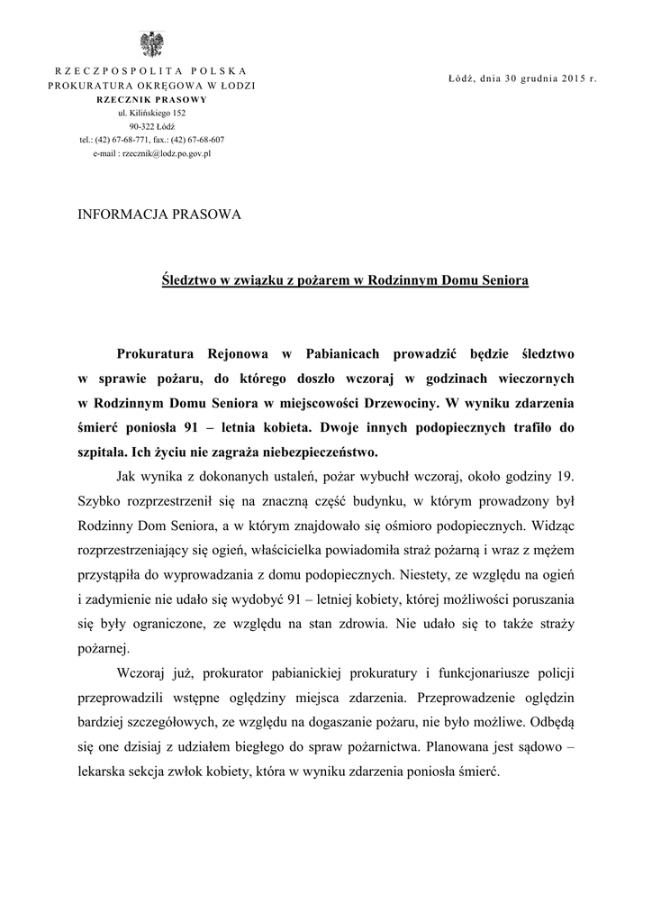 RZECZPOSPOLITA POLSKA PROKURATURA OKRĘGOWA W ŁODZI Łódź, dnia 30 grudnia 2015 r. RZE CZNIK PRASOWY ul. Kilińskiego 152 90-322 Łódź tel.: (42) 67-68-771, fax.: (42) 67-68-607 e-mail : [email protected] INFORMACJA PRASOWA Śledztwo w związku z pożarem w Rodzinnym Domu Seniora Prokuratura Rejonowa w Pabianicach prowadzić będzie śledztwo w sprawie pożaru, do którego doszło wczoraj w godzinach wieczornych w Rodzinnym Domu Seniora w miejscowości Drzewociny. W wyniku zdarzenia śmierć poniosła 91 – letnia kobieta. Dwoje innych podopiecznych trafiło do szpitala. Ich życiu nie zagraża niebezpieczeństwo. Jak wynika z dokonanych ustaleń, pożar wybuchł wczoraj, około godziny 19. Szybko rozprzestrzenił się na znaczną część budynku, w którym prowadzony był Rodzinny Dom Seniora, a w którym znajdowało się ośmioro podopiecznych. Widząc rozprzestrzeniający się ogień, właścicielka powiadomiła straż pożarną i wraz z mężem przystąpiła do wyprowadzania z domu podopiecznych. Niestety, ze względu na ogień i zadymienie nie udało się wydobyć 91 – letniej kobiety, której możliwości poruszania się były ograniczone, ze względu na stan zdrowia. Nie udało się to także straży pożarnej. Wczoraj już, prokurator pabianickiej prokuratury i funkcjonariusze policji przeprowadzili wstępne oględziny miejsca zdarzenia. Przeprowadzenie oględzin bardziej szczegółowych, ze względu na dogaszanie pożaru, nie było możliwe. Odbędą się one dzisiaj z udziałem biegłego do spraw pożarnictwa. Planowana jest sądowo – lekarska sekcja zwłok kobiety, która w wyniku zdarzenia poniosła śmierć. 2 Funkcjonariusze policji przesłuchują świadków. Wyciąganie wniosków, co do przyczyny pożaru możliwe będzie po uzupełnieniu materiału dowodowego, w tym uzyskaniu opinii biegłego. Przedmiotem szczegółowych ustaleń będą także kwestie, dotyczące tego, czy obiekt, w którym prowadzono Rodzinny Dom Seniora spełniał wymogi bezpieczeństwa, w tym również w zakresie wymagań przeciwpożarowych. Rzecznik Prasowy Prokuratury Okręgowej w Łodzi Krzysztof Kopania