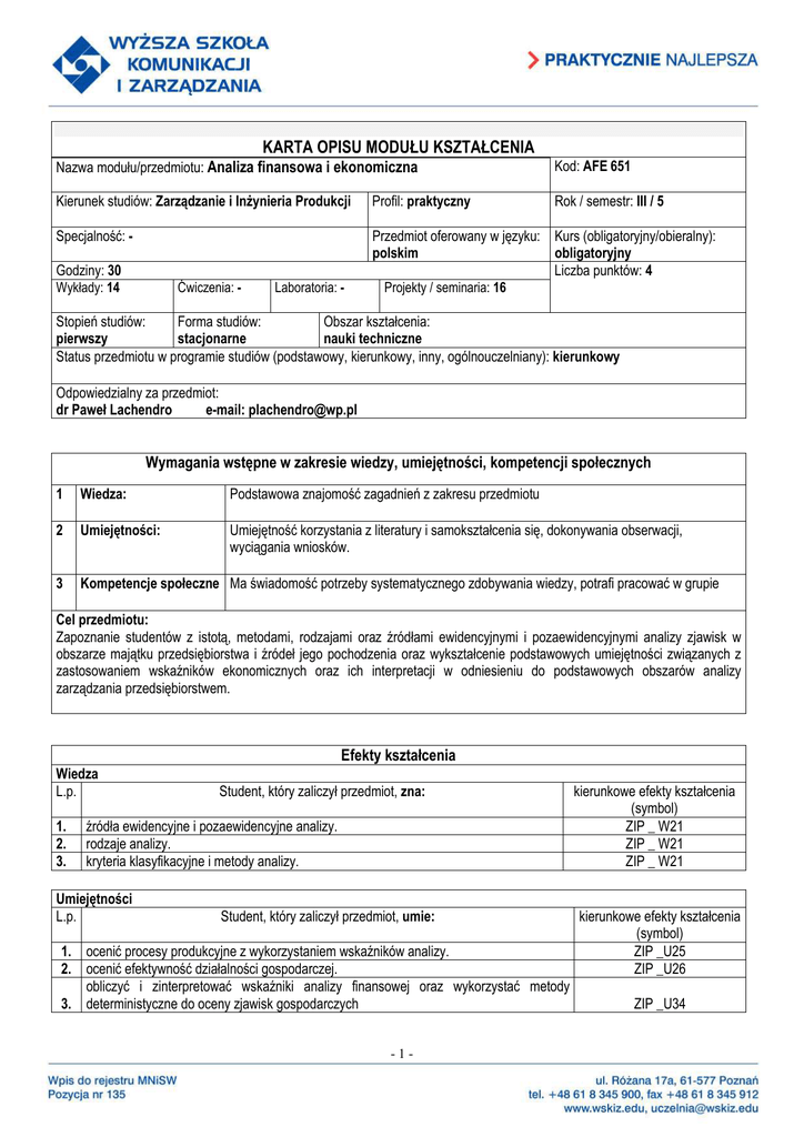 KARTA OPISU MODUŁU KSZTAŁCENIA Nazwa modułu/przedmiotu: Analiza finansowa i ekonomiczna Kod: AFE 651 Kierunek studiów: Zarządzanie i InŜynieria Produkcji Profil: praktyczny Rok / semestr: III / 5 Specjalność: - Przedmiot oferowany w języku: Kurs (obligatoryjny/obieralny): polskim obligatoryjny Liczba punktów: 4 Projekty / seminaria: 16 Godziny: 30 Wykłady: 14 Ćwiczenia: - Laboratoria: - Stopień studiów: Forma studiów: Obszar kształcenia: pierwszy stacjonarne nauki techniczne Status przedmiotu w programie studiów (podstawowy, kierunkowy, inny, ogólnouczelniany): kierunkowy Odpowiedzialny za przedmiot: dr Paweł Lachendro e-mail: [email protected] Wymagania wstępne w zakresie wiedzy, umiejętności, kompetencji społecznych 1 Wiedza: Podstawowa znajomość zagadnień z zakresu przedmiotu 2 Umiejętności: Umiejętność korzystania z literatury i samokształcenia się, dokonywania obserwacji, wyciągania wniosków. 3 Kompetencje społeczne Ma świadomość potrzeby systematycznego zdobywania wiedzy, potrafi pracować w grupie Cel przedmiotu: Zapoznanie studentów z istotą, metodami, rodzajami oraz źródłami ewidencyjnymi i pozaewidencyjnymi analizy zjawisk w obszarze majątku przedsiębiorstwa i źródeł jego pochodzenia oraz wykształcenie podstawowych umiejętności związanych z zastosowaniem wskaźników ekonomicznych oraz ich interpretacji w odniesieniu do podstawowych obszarów analizy zarządzania przedsiębiorstwem. Efekty kształcenia Wiedza L.p. 1. 2. 3. Student, który zaliczył przedmiot, zna: źródła ewidencyjne i pozaewidencyjne analizy. rodzaje analizy. kryteria klasyfikacyjne i metody analizy. Umiejętności L.p. Student, który zaliczył przedmiot, umie: 1. ocenić procesy produkcyjne z wykorzystaniem wskaźników analizy. 2. ocenić efektywność działalności gospodarczej. obliczyć i zinterpretować wskaźniki analizy finansowej oraz wykorzystać metody 3. deterministyczne do oceny zjawisk gospodarczych -1- kierunkowe efekty kształcenia (symbol) ZIP _ W21 ZIP _ W21 ZIP _ W21 kierunkowe efekty kształcenia (symbol) ZIP _U25 ZIP _U26 ZIP _U34 Kompetencje społeczne L.p. Student, który zaliczył przedmiot, potrafi: 1. przeprowadzić analizę i ocenę wyniku finansowego. 2. współdziałać w opracowaniu i analizie budŜetu przedsiębiorstwa. 3. współpracować w zakresie analizy techniczno-ekonomicznej. kierunkowe efekty kształcenia (symbol) ZIP _K12 ZIP _K13 ZIP _K13 Sposoby sprawdzenia efektów kształcenia: W czasie sesji egzaminacyjnej odbywa się pisemne sprawdzenie wiedzy i umiejętności obejmujące materiał (zagadnienia) omawiany na zajęciach. W ciągu całego semestru są indywidualne konsultacje ze studentami (równieŜ na platformie e-learningowej): 1,0 godzina/tygodniowo. Warunkiem koniecznym do uczestniczenia w pisemnym sprawdzeniu wiedzy jest pozytywne zaliczenia projektu. Punktacja: (60 pytań, max. 60 pkt.) Za kaŜdą odpowiedź moŜna uzyskać od 0 do 1 pkt. Skala ocen: Liczba punktów – ocena 52 – 60,0 bardzo dobra (A) 48 - 51,9 dobra plus (B) 42 – 47,9 dobra (C) 36 – 41,9 dostateczna plus (D) 30 – 35,9 dostateczna (E) poniŜej 30 niedostateczna (F) Treści programowe: 1. 2. 3. 4. 5. 6. 7. 8. 9. 10. 11. Teoretyczne podstawy analizy finansowo-ekonomicznej-zakres, rodzaje, metody i źródła. Analiza sytuacji majątkowej i finansowej. Analiza środków trwałych. Wskaźniki reprodukcji i finansowania środków trwałych. Zakres analizy zapasów. Pomiar transformacji zapasów oraz rotacji cyklów zapasów. Analiza kapitałów. Pojęcie i pomiar dźwigni operacyjnej. Analiza przychodów i zysków nadzwyczajnych. Pojęcie i pomiar progu rentowności. Analiza kosztów i strat nadzwyczajnych. Analiza zatrudnienia i wynagrodzeń. Analiza wyniku finansowego w ujęciach: bezwzględnym i względnym. Wartość przedsiębiorstwa -metody wyceny-i jego analiza. 12. Wieloczynnikowe modele oceny przedsiębiorstwa. Literatura podstawowa: 1. Analiza ekonomiczna w przedsiębiorstwie, praca zbiorowa pod red. M. Jerzemowskiej, PWE, Warszawa 2006 2. L. Bednarski, R. Borowiecki, J .Duraj, E. Kurtys, T. Waśniewski, B, Wersty, Analiza ekonomiczna przedsiębiorstwa, Wydawnictwo Akademii Ekonomicznej im. O. Langego, Wrocław 2001 i nast. -2- Literatura uzupełniająca (pozycje wydane po 2000 roku): 1. Gabrusewicz, Sprawozdawczość i analiza finansowa przedsiębiorstwa, Wydawnictwo WSHiR, Poznań 2009 2. Z. Leszczyński, A. Skowronek-Mielczarek, Analiza ekonomiczno-finansowa spółki, PWE, Warszawa 2004 Bilans nakładu pracy przeciętnego studenta: Forma aktywności Liczba godzin 14 Udział w wykładach Udział w ćwiczeniach, laboratoriach 0 Udział w projektach (przygotowanie i referowanie) 25 Konsultacje osobiste (takŜe na platformie e-learningowej) 15 Przygotowanie do ćwiczeń, laboratoriów 6 Opracowanie sprawozdania 0 Przygotowanie do pisemnego sprawdzianu wiedzy i umiejętności 20 Udział w pisemnym sprawdzeniu wiedzy i umiejętności 2 Poszukiwanie źródeł informacji (biblioteka, Internet) – samokształcenie 38 Łączny nakład pracy: 120 Liczba punktów ECTS wynikająca z łącznego nakładu pracy: (1 punkt ECTS powinien odpowiadać około 30 godz. w Bilansie) -3- 4
