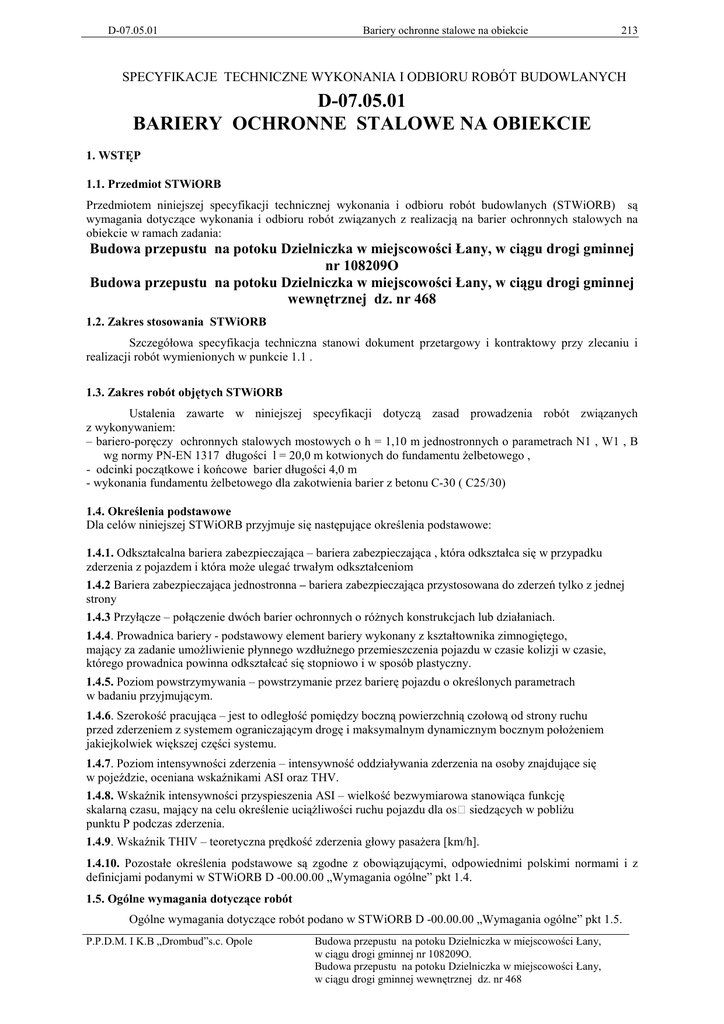 D-07.05.01 Bariery ochronne stalowe na obiekcie 213 SPECYFIKACJE TECHNICZNE WYKONANIA I ODBIORU ROBÓT BUDOWLANYCH D-07.05.01 BARIERY OCHRONNE STALOWE NA OBIEKCIE 1. WSTĘP 1.1. Przedmiot STWiORB Przedmiotem niniejszej specyfikacji technicznej wykonania i odbioru robót budowlanych (STWiORB) są wymagania dotyczące wykonania i odbioru robót związanych z realizacją na barier ochronnych stalowych na obiekcie w ramach zadania: Budowa przepustu na potoku Dzielniczka w miejscowości Łany, w ciągu drogi gminnej nr 108209O Budowa przepustu na potoku Dzielniczka w miejscowości Łany, w ciągu drogi gminnej wewnętrznej dz. nr 468 1.2. Zakres stosowania STWiORB Szczegółowa specyfikacja techniczna stanowi dokument przetargowy i kontraktowy przy zlecaniu i realizacji robót wymienionych w punkcie 1.1 . 1.3. Zakres robót objętych STWiORB Ustalenia zawarte w niniejszej specyfikacji dotyczą zasad prowadzenia robót związanych z wykonywaniem: – bariero-poręczy ochronnych stalowych mostowych o h = 1,10 m jednostronnych o parametrach N1 , W1 , B wg normy PN-EN 1317 długości l = 20,0 m kotwionych do fundamentu Ŝelbetowego , - odcinki początkowe i końcowe barier długości 4,0 m - wykonania fundamentu Ŝelbetowego dla zakotwienia barier z betonu C-30 ( C25/30) 1.4. Określenia podstawowe Dla celów niniejszej STWiORB przyjmuje się następujące określenia podstawowe: 1.4.1. Odkształcalna bariera zabezpieczająca – bariera zabezpieczająca , która odkształca się w przypadku zderzenia z pojazdem i która moŜe ulegać trwałym odkształceniom 1.4.2 Bariera zabezpieczająca jednostronna – bariera zabezpieczająca przystosowana do zderzeń tylko z jednej strony 1.4.3 Przyłącze – połączenie dwóch barier ochronnych o róŜnych konstrukcjach lub działaniach. 1.4.4. Prowadnica bariery - podstawowy element bariery wykonany z kształtownika zimnogiętego, mający za zadanie umoŜliwienie płynnego wzdłuŜnego przemieszczenia pojazdu w czasie kolizji w czasie, którego prowadnica powinna odkształcać się stopniowo i w sposób plastyczny. 1.4.5. Poziom powstrzymywania – powstrzymanie przez barierę pojazdu o określonych parametrach w badaniu przyjmującym. 1.4.6. Szerokość pracująca – jest to odległość pomiędzy boczną powierzchnią czołową od strony ruchu przed zderzeniem z systemem ograniczającym drogę i maksymalnym dynamicznym bocznym połoŜeniem jakiejkolwiek większej części systemu. 1.4.7. Poziom intensywności zderzenia – intensywność oddziaływania zderzenia na osoby znajdujące się w pojeździe, oceniana wskaźnikami ASI oraz THV. 1.4.8. Wskaźnik intensywności przyspieszenia ASI – wielkość bezwymiarowa stanowiąca funkcję skalarną czasu, mający na celu określenie uciąŜliwości ruchu pojazdu dla os siedzących w pobliŜu punktu P podczas zderzenia. 1.4.9. Wskaźnik THIV – teoretyczna prędkość zderzenia głowy pasaŜera [km/h]. 1.4.10. Pozostałe określenia podstawowe są zgodne z obowiązującymi, odpowiednimi polskimi normami i z definicjami podanymi w STWiORB D -00.00.00 „Wymagania ogólne” pkt 1.4. 1.5. Ogólne wymagania dotyczące robót Ogólne wymagania dotyczące robót podano w STWiORB D -00.00.00 „Wymagania ogólne” pkt 1.5. P.P.D.M. I K.B „Drombud”s.c. Opole Budowa przepustu na potoku Dzielniczka w miejscowości Łany, w ciągu drogi gminnej nr 108209O. Budowa przepustu na potoku Dzielniczka w miejscowości Łany, w ciągu drogi gminnej wewnętrznej dz. nr 468 214 Bariery ochronne stalowe na obiekcie D-07.05.01 2. MATERIAŁY 2.1. Ogólne wymagania dotyczące materiałów Ogólne wymagania dotyczące materiałów, w STWiORB D -00.00.00 „Wymagania ogólne” pkt 2. ich pozyskiwania i składowania, podano 2.2. Materiały do wykonania barier osłonowych stalowych NaleŜy wykonać bariero-poręcze stalowe mostowe zabezpieczające jednostronne zgodnie a wymaganiami: - PN – EN 1317-1 Systemy ograniczające drogę . Część .: Terminologia i ogólne kryteria metod badań [1] - PN – EN 1317-2 PN-EN 1317-2:2001/A1 Systemy ograniczające drogę . Część.: Klasy działania , kryteria przyjęcia badań zderzeniowych metody badań barier ochronnych .[2] np. BSP-160/1,33 produkcji Staprodukt Bochnia Stosuje się bariero-poręcze ze słupkami kotwionymi za pomocą kotew wklejanych do fundamentu Ŝelbetowego NaleŜy stosować kotwy będące częścią systemu barier producenta. Parametry bariero-poręczy : - poziom powstrzymywania N1 - poziom intensywności zderzenia B - odkształcenie wyraŜone szerokością współpracującą W1 ( poziom szerokości współpracującej ≤ 0,5 m) 2.3. Elementy do wykonania barier ochronnych stalowych KaŜda jednostka ładunkowa dostarczona przez producenta powinna posiadać metrykę zawierającą, co najmniej następujące dane: - nazwę i adres producenta, - nazwę wyrobu, - oznaczenie typu bariery, - masę elementu, - datę produkcji, - znak CE potwierdzający deklarację zgodności z normą PN-EN 1317-5. Wszystkie materiały montowanej bariery powinny być identyczne z materiałami uŜytymi podczas testu zderzeniowego. Charakterystykę podstawowych element barier stalowej przedstawiono w tablicy 1. Tablica 1. Charakterystyka podstawowych element bariery stalowej. Grubość miejscowa Lp Element Grubość średnia powłoki ochronnej powłoki ochronnej cynkowej [µm] cynkowej [µm] 1. Element amortyzujący ≥ 70 ≥ 70 Słupek Profil ślizgowy Profil dodatkowy 2. Płyta podstawy ≥ 85 ≥ 70 3. Prowadnica ≥ 55 ≥ 45 Łącznik Śruby, nakrętki oraz podkładki powinny być zabezpieczone antykorozyjnie zgodnie z PN-EN ISO 4042. Do połączenia bariery stalowej z barierą innego typu naleŜy wykorzystać gotowy element prefabrykowany zgodnie z zaleceniami producenta jednej z barier. 2.4 Elementy początkowe i końcowe barier Odcinki końcowe i początkowe barier powinny mieć prowadnice kształtu jak w barierze podstawowej . 2.5 Kotwy do montaŜu barier Stosować kotwy wklejane