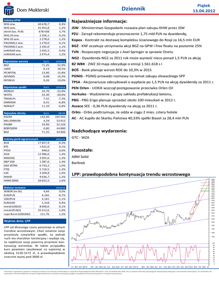 Piątek 13.04.2012 Dziennik Indeksy GPW WIG otw. WIG zam. obrót (tys. PLN) WIG 20 otw. WIG 20 zam. FW20M12 otw. FW20M12 zam. mWIG40 otw. mWIG40 zam. 40 678,7 41 053,8 678 438 2 256,1 2 278,6 2 270,0 2 292,0 2 455,5 2 474,4 0,3% 1,2% 3,7% 0,2% 1,2% 0,1% 1,1% 0,4% 1,2% Największe wzrosty BGZ JAGO IFCAPITAL ADVADIS INTAKUS kurs 71,35 0,13 13,90 0,08 0,26 zmiana 51,9% 18,2% 15,8% 14,3% 13,0% Największe spadki RESBUD WISTIL TRAVELPL DMWDM NOKAUT kurs 24,70 22,40 7,32 0,41 11,10 zmiana -22,8% -20,0% -7,3% -6,8% -6,8% Najwyższe obroty KGHM MILLENNIUM PKOBP BORYSZEW BGZ kurs 143,00 4,29 33,90 0,80 71,35 obrót 105 565 53 912 52 226 44 880 43 006 Indeksy giełd zagranicznych BUX 17 827,9 RTS 1 622,0 PX50 940,0 DJIA 12 986,6 NASDAQ 3 055,6 S&P 500 1 387,6 DAX XETRA 6 743,2 FTSE 5 710,5 CAC 3 269,8 NIKKEI 9 636,7 HANG SENG 20 652,5 zmiana -0,3% 0,1% 0,0% 1,4% 1,3% 1,4% 1,0% 1,3% 1,0% 1,2% 1,6% Waluty i surowce WIBOR 3m (%) EUR/PLN USD/PLN EUR/USD miedź (USD/t) miedź (PLN/t) ropa Brent (USD/bbl) zmiana 0,0% -0,7% -1,1% 0,4% 0,1% -1,0% 1,2% Najważniejsze informacje: JSW - Ministerstwo Gospodarki rozważa plan zakupu KHW przez JSW PZU - Zarząd rekomenduje przeznaczenie 1,75 mld PLN na dywidendę, Kopex - Kontrakt na dostawę kompleksu ścianowego do Rosji za 16,5 mln EUR BGŻ - KNF oczekuje utrzymania akcji BGŻ na GPW i free floatu na poziomie 25% TVN - Rozpoczęte negocjacje z Axel Springer w sprawie Onetu NG2 - Dywidenda NG2 za 2011 rok może wynieść nieco ponad 1,5 PLN za akcję 4,84 4,165 3,161 1,318 8 040,0 25 413,6 121,76 BZ WBK - ZWZ 10 maja zdecyduje o emisji 1.561.618 s I BOŚ - Bank planuje wzrost ROE do 10,3% w 2015 PGNiG - PGNiG prowadzi rozmowy na temat zakupu słowackiego SPP TPSA - Akcjonariusze zdecydowali o wypłacie po 1,5 PLN na akcję dywidendy za 2011 r. PKN Orlen - UOKiK wszczął postępowanie przeciwko Orlen Oil Herkules - Wydzielenie z grupy zakładu prefabrykacji betonu, PBG - PBG Erigo planuje sprzedać około 100 mieszkań w 2012 r. Asseco SEE - 0,36 PLN dywidendy na akcję za 2011 r. Orbis - Orbis podtrzymuje, że odda w ciągu 2 mies. cztery hotele AC - AC kupiło do Skarbu Państwa 40,33% spółki Biazet za 28,4 mln PLN Nadchodzące wydarzenia: GTC - WZA Pozostałe: ABM Solid Barlinek LPP: prawdopodobna kontynuacja trendu wzrostowego 3800 3700 3600 3500 3400 3300 3200 3100 3000 2900 2800 2700 2600 2500 2400 2300 2200 2100 2000 Wykres dnia: LPP 1900 1800 LPP od dłuższego czasu pozostaje w silnym trendzie wzrostowym. Choć ostatnie sesje przyniosły niewielkie spadki, to jednak ruch ma charakter korekcyjny i wydaje się, że najbliższe sesje powinny przynieść kontynuację wzrostów. W takim przypadku kurs powinien zwyżkować co najmniej w okolicę 3120-3172 zł, a prawdopodobnie znacznie wyżej pod 3600 zł. 1700 1600 1500 100 90 80 70 60 50 40 30 20 10 0 Oct Nov Dec 2010 Mar Apr May Jun Jul Aug Sep Oct Nov Dec 2011 Mar Apr May Jun Jul Aug Sep Oct Nov Dec 2012 Feb Mar Apr May Jun Informacje i komentarze zawarte w niniejszym raporcie nie stanowią rekomendacji w rozumieniu Rozporządzenia Rady Ministrów z dnia 19 października 2005 roku w sprawie informacji stanowiących rekomendacje dotyczące instrumentów finansowych, ich emitentów lub wystawców. PKO Dom Maklerski nie ponosi odpowiedzialności za decyzje inwestycyjne podjęte na podstawie informacji zawartych w niniejszym opracowaniu. Dziennik Najważniejsze informacje JSW Ministerstwo Gospodarki rozważa plan zakupu KHW przez JSW Prasa spekuluje, że jeśli nie powiedzie się emisja obligacji KHW o wartości 1 mld PLN, nadzorujące branżę Ministerstwo Gospodarki będzie rozważało połączenie KHW z Jastrzębską Spółką Węglową. KHW przyznaje, że tegoroczne wydobycie może być niższe o 0,5 mln ton, a taki spadek wydobycia przełożyłby się na 150 mln PLN mniejsze przychody. Jarosław Zagórski, prezes JSW, powiedział, że nikt nie przedstawił oficjalnych planów ewentualnego połączenia w jakiejkolwiek formie. Z punktu widzenia JSW możliwość zakupu KHW oceniamy negatywnie głównie ze względu na ryzyko wyceny i restrukturyzacji, chyba że cena byłaby nadzwyczaj atrakcyjna. JSW wykorzystałaby całą swoją gotówkę i prawdopodobnie finansowała wspólny wysoki CAPEX z długu, nie mówiąc o spadku potencjalnej dywidendy. Połączenie wymagałoby nadzwyczajnej przejrzystości, zwłaszcza na polu wyceny, ponieważ jest to przejęcie tak naprawdę potrzebne i korzystne dla KHW, a nie dla JSW. Plusy: Powstałaby jedna z największych firm wydobywczych w Europie z ponad 25 mln ton rocznej produkcji węgla i przychodami 14 mld PLN. Zapewniłoby to dywersyfikację: udział węgla energetycznego w wydobyciu grupy wzrósłby z 23% do 60%, a w przychodach z 9% do 36% Minusy: Z drugiej strony przejęcie byłoby nie w pełni spójne ze strategią JSW, która zakłada rozwój produkcji koksu i węgla koksowego. Zwiększyłoby ekspozycje JSW na problemy z restrukturyzacją i związki zawodowe, a JSW po przejęciu dwóch dużych koksowni może nie mieć potencjału do przeprowadzenia restrukturyzacji KHW. Ponadto JSW, oprócz kopalni Budryk, nie ma doświadczeniu w prowadzeniu skomplikowanej restrukturyzacji. Pogorszyłoby strukturę bilansu ze względu na wysokie zadłużenie KHW i duże potrzeby kapitałowe, czyli CAPEX w KHW rzędu 680 mln w 2012 i 1,5 mld PLN w kolejnych latach na pogłębianie szybu oraz około 1 mld PLN w trzy lata na roboty przygotowawcze w celu utrzymania produkcji ponad 12 mln ton węgla rocznie. Ponadto KHW ma bardzo wysokie koszty wydobycia i niską marżę na węglu oraz bardzo niską wydajność (pracuje ponad 20 ścian wydobywczych), a część kopalń jest nierentowna. (A. Iwański) PZU Zarząd rekomenduje przeznaczenie 1,75 mld PLN na dywidendę, czyli 20,3 PLN na akcję Zarząd PZU rekomenduje wypłatę dywidendy z zysku za 2011 r. w wysokości 1,75 mld PLN, czyli 20,3 PLN dywidendy na akcję. Wniosek zarządu musi zostać zaopiniowany przez radę nadzorczą. 