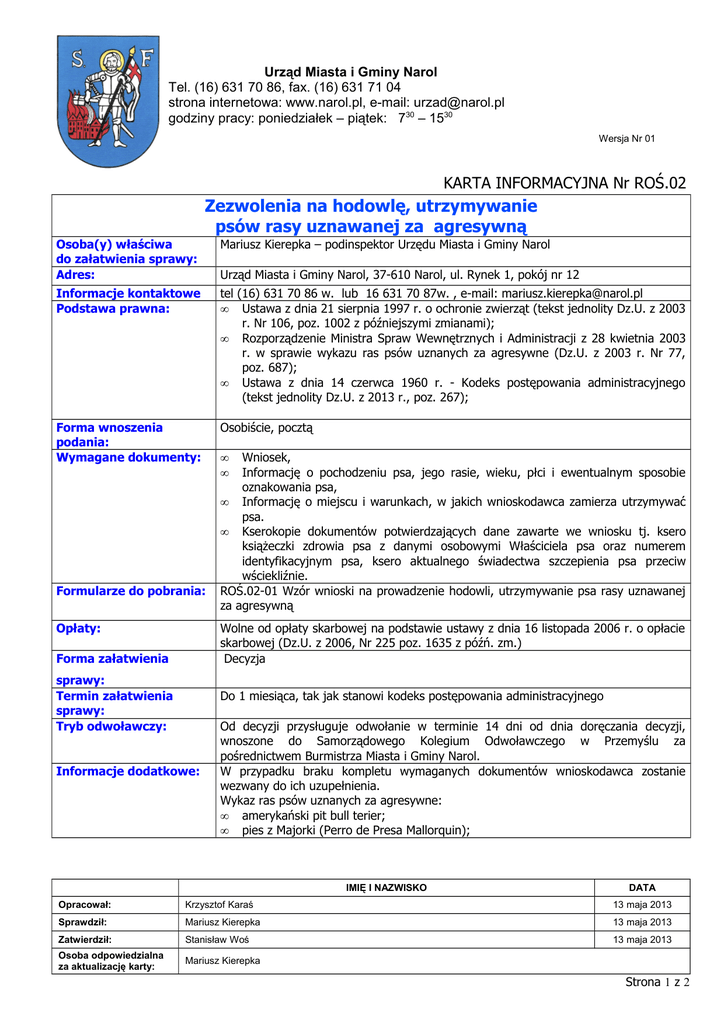 Urząd Miasta i Gminy Narol Tel. (16) 631 70 86, fax. (16) 631 71 04 strona internetowa: www.narol.pl, e-mail: [email protected] godziny pracy: poniedziałek – piątek: 730 – 1530 Wersja Nr 01 KARTA INFORMACYJNA Nr ROŚ.02 Zezwolenia na hodowlę, utrzymywanie psów rasy uznawanej za agresywną Osoba(y) właściwa do załatwienia sprawy: Adres: Mariusz Kierepka – podinspektor Urzędu Miasta i Gminy Narol Informacje kontaktowe Podstawa prawna: tel (16) 631 70 86 w. lub 16 631 70 87w. , e-mail: [email protected] • Ustawa z dnia 21 sierpnia 1997 r. o ochronie zwierząt (tekst jednolity Dz.U. z 2003 r. Nr 106, poz. 1002 z późniejszymi zmianami); • Rozporządzenie Ministra Spraw Wewnętrznych i Administracji z 28 kwietnia 2003 r. w sprawie wykazu ras psów uznanych za agresywne (Dz.U. z 2003 r. Nr 77, poz. 687); • Ustawa z dnia 14 czerwca 1960 r. - Kodeks postępowania administracyjnego (tekst jednolity Dz.U. z 2013 r., poz. 267); Forma wnoszenia podania: Wymagane dokumenty: Osobiście, pocztą Formularze do pobrania: Opłaty: Urząd Miasta i Gminy Narol, 37-610 Narol, ul. Rynek 1, pokój nr 12 • • Wniosek, Informację o pochodzeniu psa, jego rasie, wieku, płci i ewentualnym sposobie oznakowania psa, • Informację o miejscu i warunkach, w jakich wnioskodawca zamierza utrzymywać psa. • Kserokopie dokumentów potwierdzających dane zawarte we wniosku tj. ksero książeczki zdrowia psa z danymi osobowymi Właściciela psa oraz numerem identyfikacyjnym psa, ksero aktualnego świadectwa szczepienia psa przeciw wściekliźnie. ROŚ.02-01 Wzór wnioski na prowadzenie hodowli, utrzymywanie psa rasy uznawanej za agresywną Wolne od opłaty skarbowej na podstawie ustawy z dnia 16 listopada 2006 r. o opłacie skarbowej (Dz.U. z 2006, Nr 225 poz. 1635 z późń. zm.) Decyzja Forma załatwienia sprawy: Termin załatwienia sprawy: Tryb odwoławczy: Do 1 miesiąca, tak jak stanowi kodeks postępowania administracyjnego Informacje dodatkowe: Od decyzji przysługuje odwołanie w terminie 14 dni od dnia doręczania decyzji, wnoszone do Samorządowego Kolegium Odwoławczego w Przemyślu za pośrednictwem Burmistrza Miasta i Gminy Narol. W przypadku braku kompletu wymaganych dokumentów wnioskodawca zostanie wezwany do ich uzupełnienia. Wykaz ras psów uznanych za agresywne: • amerykański pit bull terier; • pies z Majorki (Perro de Presa Mallorquin); IMIĘ I NAZWISKO DATA Opracował: Krzysztof Karaś 13 maja 2013 Sprawdził: Mariusz Kierepka 13 maja 2013 Zatwierdził: Stanisław Woś 13 maja 2013 Osoba odpowiedzialna za aktualizację karty: Mariusz Kierepka Strona 1 z 2 • • • • • • • • • buldog amerykański; dog argentyński; pies kanaryjski (Perro de Presa Canario); tosa inu; rottweiler; akbash dog; Anatolia karabash; moskiewski stróżujący; owczarek kaukaski. IMIĘ I NAZWISKO DATA Opracował: Krzysztof Karaś 13 maja 2013 Sprawdził: Mariusz Kierepka 13 maja 2013 Zatwierdził: Stanisław Woś 13 maja 2013 Osoba odpowiedzialna za aktualizację karty: Mariusz Kierepka Strona 2 z 2