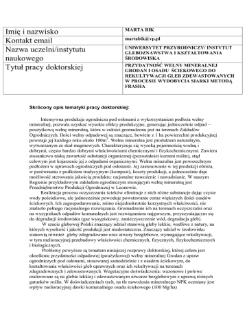 Imię i nazwisko Kontakt email Nazwa uczelni/instytutu naukowego Tytuł pracy doktorskiej MARTA BIK [email protected] UNIWERSYTET PRZYRODNICZY/ INSTYTUT GLEBOZNAWSTWA I KSZTAŁTOWANIA ŚRODOWISKA PRZYDATNOŚĆ WEŁNY MINERALNEJ GRODAN I OSADU ŚCIEKOWEGO DO REKULTYWACJI GLEB ZDEWASTOWANYCH W PROCESIE WYDOBYCIA SIARKI METODĄ FRASHA Skrócony opis tematyki pracy doktorskiej: Intensywna produkcja ogrodnicza pod osłonami z wykorzystaniem podłoża wełny mineralnej, pozwala uzyskać wysokie efekty produkcyjne, generując jednocześnie odpad – poużytkową wełnę mineralną, która w całości gromadzona jest na terenach Zakładów Ogrodniczych. Ilości wełny odpadowej są znaczące, bowiem z 1 ha powierzchni produkcyjnej powstaje jej każdego roku około 100m3. Wełna mineralna jest produktem naturalnym, wytwarzanym ze skał magmowych. Charakteryzuje się wysoką pojemnością wodną i dobrymi, często bardzo dobrymi właściwościami chemicznymi i fizykochemicznymi. Zawiera stosunkowo niską zawartość substancji organicznej (pozostałości korzeni roślin), stąd celowym jest kojarzenie jej z odpadami organicznymi. Wełna mineralna jest powszechnym podłożem w uprawach ogrodniczych pod osłonami. Jej zastosowanie w tej produkcji obniża, w porównaniu z podłożem tradycyjnym (kompost), koszty produkcji, a jednocześnie daje możliwość sterowania jakością produktu: racjonalne nawożenie i nawadnianie. W naszym Regionie przykładowym zakładem ogrodniczym stosującym wełnę mineralną jest Przedsiębiorstwo Produkcji Ogrodniczej w Leonowie. Realizacja procesu oczyszczania ścieków eliminuje z nich różne substancje dając czyste wody pościekowe, ale jednocześnie powoduje powstawanie coraz większych ilości osadów ściekowych. Ich zagospodarowanie, mimo niejednokrotnie korzystnych właściwości, nie znalazło pełnego racjonalnego rozwiązania. Gromadzenie ich na terenach oczyszczalni oraz na wysypiskach odpadów komunalnych jest rozwiązaniem najgorszym, przyczyniającym się do degradacji środowiska (gaz wysypiskowy, zanieczyszczenie wód, degradacja gleb). W szacie glebowej Polski znaczący udział stanowią gleby lekkie, wadliwe z natury, na których wysokość i jakość produkcji jest niedostateczna. Znaczący udział w środowisku stanowią również gleby zdegradowane oraz utwory bezglebowe, wymagające rekultywacji, w tym melioracyjnej przebudowy właściwości chemicznych, fizycznych, fizykochemicznych i biologicznych. Problemy powyższe są tematem niniejszej rozprawy doktorskiej, której celem jest określenie przydatności odpadowej (poużytkowej) wełny mineralnej Grodan z upraw ogrodniczych pod osłonami, stosowanej samodzielnie i z osadem ściekowym, do kształtowania właściwości gleb uprawnych oraz ich rekultywacji na terenach zdegradowanych i zdewastowanych. Wegetacyjne doświadczenia: wazonowe i polowe realizowane są na glebie lekkiej i zdewastowanym utworze bezglebowym z uprawą różnych gatunków roślin. W doświadczeniach tych, na tle nawożenia mineralnego NPK oceniany jest wpływ melioracyjnej dawki komunalnego osadu ściekowego (100 Mg/ha) i różnych (200; 400; 800 m3/ha) wełny mineralnej Grodan, na kształtowanie właściwości gleb i ich odbudowę na gruntach bezglebowych. Uzyskany w wyniku ich realizacji materiał (osad ściekowy, wełna mineralna, gleba/grunt, rośliny) poddawany jest analizie i ocenie zmian wielu właściwości, dobranych stosownie do celu badań. Wykonywane są oznaczenia: w glebach/gruncie: składu granulometrycznego, gęstości gleby, właściwości sorpcyjnych, właściwości wodnych, zakwaszenia, zawartości próchnicy i jej jakości, przyswajalnych form P, K, Mg, azotu, metali ciężkich. W odniesieniu do roślin rejestrowany jest plon oraz właściwości chemiczne – zawartość makro i mikroskładników. Na podkreślenie zasługuje zastosowanie nowoczesnych metod ekotoksykologicznych z wykorzystaniem bakterii, skorupiaków i dżdżownic. Efekty tych metod w połączeniu z tradycyjnymi metodami chemicznymi dają doskonały obraz zmian jakości rekultywowanego i użyźnianego środowiska glebowego. W warunkach eksperymentu mikropoletkowego (poletka o powierzchni 30m2) analizowany jest wpływ wełny mineralnej i osadu ściekowego zastosowanych w wierzchniej (0-20 cm) warstwie gruntu, a także wełny mineralnej wprowadzonej jako warstwa 5 cm na głębokości 50 cm. Celem tych badań jest opracowanie optymalnego sposobu rekultywacji i odbudowy gleb na terenach zdegradowanych i zdewastowanych, a także kształtowania właściwości produkcyjnych gleb słabej jakości. Dotychczasowe wyniki badań wskazują, że badane sposoby nawożenia/rekultywacji z wykorzystaniem poużytkowej wełny mineralnej Grodan i osadu ściekowego na tle nawożenia mineralnego NPK, wywierają korzystny, ale zróżnicowany wpływ na kształtowanie właściwości chemicznych i fizykochemicznych gleb i utworów bezglebowych, czego wyrazem jest wzrost plonu uprawianych roślin (traw). Uwzględniając sumaryczny plon trawy badane warianty nawozowe tworzą szereg: grunt + osad ściekowy + wełna (177,8%) > grunt + osad ściekowy (158,8%) ~ grunt + wełna mineralna + NPK (158,4%) > grunt + wełna mineralna 125,1%) > grunt + NPK (100,0%). Korzystny wpływ badanych sposobów rekultywacji gleb zdegradowanych przy wykorzystaniu w/w odpadów odnotowano również w uprawie rzepaku na cele energetyczne. Wyrazem wzrostu plonu uprawianych roślin była poprawa właściwości rekultywowanego gruntu. Szczególnie korzystny wpływ odnotowano w kształtowaniu retencji wodnej. Bardzo niska wartość polowej pojemności wodnej w gruncie rodzimym (utwór bezglebowy), uległa istotnej (234–834%) i zróżnicowanej poprawie pod wpływem stosowanych sposobów rekultywacji: grunt+osad ściekowy+wełna (278%) > grunt+wełna (186%) > grunt+osad ściekowy (136%) > grunt+ NPK (100%). Uwzględniając zmiany polowej pojemności wodnej w relacji: początek (100%) - koniec