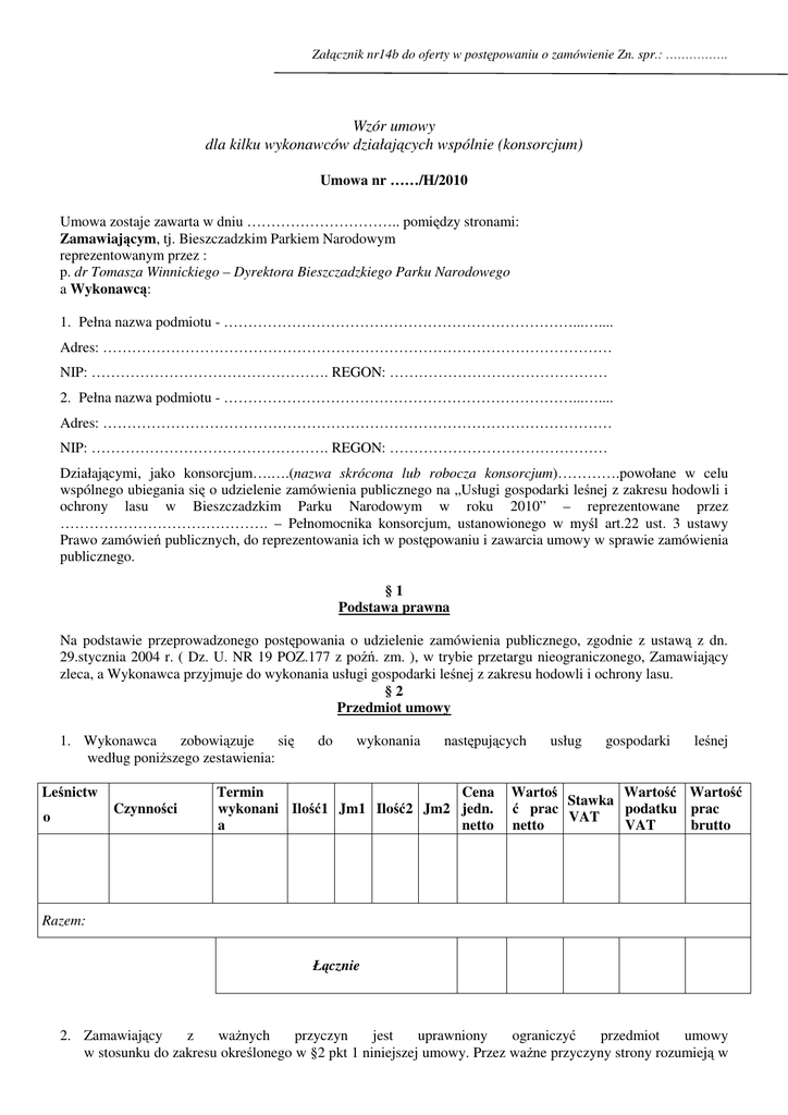 Załącznik nr14b do oferty w postępowaniu o zamówienie Zn. spr.: ……………. Wzór umowy dla kilku wykonawców działających wspólnie (konsorcjum) Umowa nr ……/H/2010 Umowa zostaje zawarta w dniu ………………………….. pomiędzy stronami: Zamawiającym, tj. Bieszczadzkim Parkiem Narodowym reprezentowanym przez : p. dr Tomasza Winnickiego – Dyrektora Bieszczadzkiego Parku Narodowego a Wykonawcą: 1. Pełna nazwa podmiotu - ………………………………………………………………...….... Adres: …………………………………………………………………………………………… NIP: …………………………………………. REGON: ……………………………………… 2. Pełna nazwa podmiotu - ………………………………………………………………...….... Adres: …………………………………………………………………………………………… NIP: …………………………………………. REGON: ……………………………………… Działającymi, jako konsorcjum….….(nazwa skrócona lub robocza konsorcjum)………….powołane w celu wspólnego ubiegania się o udzielenie zamówienia publicznego na „Usługi gospodarki leśnej z zakresu hodowli i ochrony lasu w Bieszczadzkim Parku Narodowym w roku 2010” – reprezentowane przez ……………………………………. – Pełnomocnika konsorcjum, ustanowionego w myśl art.22 ust. 3 ustawy Prawo zamówień publicznych, do reprezentowania ich w postępowaniu i zawarcia umowy w sprawie zamówienia publicznego. §1 Podstawa prawna Na podstawie przeprowadzonego postępowania o udzielenie zamówienia publicznego, zgodnie z ustawą z dn. 29.stycznia 2004 r. ( Dz. U. NR 19 POZ.177 z poźń. zm. ), w trybie przetargu nieograniczonego, Zamawiający zleca, a Wykonawca przyjmuje do wykonania usługi gospodarki leśnej z zakresu hodowli i ochrony lasu. §2 Przedmiot umowy 1. Wykonawca zobowiązuje się według poniŜszego zestawienia: Leśnictw Czynności o do wykonania następujących Termin Cena wykonani Ilość1 Jm1 Ilość2 Jm2 jedn. netto a usług gospodarki leśnej Wartoś Wartość Wartość Stawka ć prac podatku prac VAT netto VAT brutto Razem: Łącznie 2. Zamawiający z waŜnych przyczyn jest uprawniony ograniczyć przedmiot umowy w stosunku do zakresu określonego w §2 pkt 1 niniejszej umowy. Przez waŜne przyczyny strony rozumieją w Załącznik nr14b do oferty w postępowaniu o zamówienie Zn. spr.: ……………. szczególności: przyczyny przyrodnicze, wywołane przez klęski Ŝywiołowe i katastrofy naturalne, nieprzewidziane trudności finansowe niezaleŜne od Zamawiającego lub jeŜeli wykonanie umowy nie leŜy w interesie publicznym. Ograniczenie przedmiotu umowy w stosunku do zakresu określonego w § 2 pkt 1 niniejszej umowy nie stanowi niewykonania lub nienaleŜytego wykonania zobowiązania, a w związku z tym nie jest podstawą do ponoszenia jakichkolwiek roszczeń w stosunku do Zamawiającego. 3. Zmiana zakresu prac, o której mowa w ust.2 nie wymaga zmiany umowy. 4. W przypadku, o którym mowa w ust. 2 Wykonawca otrzyma wynagrodzenie obliczone w oparciu o ceny ofertowe z uwzględnieniem ilości rzeczywiście wykonanych prac. §3 Wynagrodzenie 1. Strony ustalają ,Ŝe Wynagrodzenie Wykonawcy z tytułu wykonywania przedmiotu umowy, zgodnie z ofertą Wykonawcy, złoŜoną w przetargu, wyniesie :......................................... zł netto ( słownie .........................) tj. ................................ zł brutto ( słownie .................................. zł)wraz z podatkiem od towarów i usług, z zastrzeŜeniem postanowień ust. 3 2.Kwota netto za jednostkę obmiaru, jest niezmienna, obejmuje wszystkie roboty, narzuty i dodatki dla Wykonawcy oraz wszystkie koszty towarzyszące przygotowaniu i realizacji prac ponoszone przez Wykonawcę i nie będzie ulegać zmianom. 3.Podatek VAT naliczony zostanie w wysokości obowiązującej w dniu wystawienia faktury. W przypadku zmiany, w trakcie trwania umowy, wysokości podatku VAT, zmianie ulega teŜ wartość umowy brutto. 4.Wynagrodzenie za usługę realizowane będzie na podstawie faktur cząstkowych obejmujących realizację określonego zadania lub części zadań. 5.Określone w §2 pkt 1 wynagrodzenie zawiera koszty transportu (wraz z załadunkiem i rozładunkiem) materiałów z miejsca składowania na teren wykonywania prac. §4 Warunki płatności NaleŜność za wykonaną usługę będzie płatna gotówką w kasie BdPN lub przelewem na konto Wykonawcy w terminie: - do 60 dni od daty złoŜenia faktury – wyłącznie przelewem na konto bankowe (zadania finansowane przez Ekofundusz) - do 30 dni od daty złoŜenia faktury – przelewem lub gotówką (zadania finansowane przez NFOŚiGW) Po przedłoŜeniu przez Wykonawcę w siedzibie Zamawiającego - rachunku potwierdzonego protokołem odbioru prawidłowo wykonanych prac. §5 Termin realizacji 1. Umowa zostaje zawarta na okres od dnia …………………. do dnia ………………… – zgodnie z wyszczególnionymi terminami prac zawartymi w § 2 pkt 1 niniejszej umowy. 2. Wykonawca będzie wykonywał przedmiot umowy sukcesywnie, stosownie do pisemnych zleceń przekazanych przez upowaŜnionych przedstawicieli Zamawiającego. 3. Zlecenie określać będzie zakres usług, termin realizacji oraz lokalizacje. Wykonawca pokwituje Zamawiającemu odbiór zlecenia. 4. Bez przekazania zlecenia przez upowaŜnionego przedstawiciela Zamawiającego Wykonawca nie jest uprawniony do rozpoczęcia wykonywania jakichkolwiek usług z zakresu przedmiotu umowy. Załącznik nr14b do oferty w postępowaniu o zamówienie Zn. spr.: ……………. 5. UpowaŜnionym przedstawicielem Zamawiającego, uprawnionym do przekazania zlecenia jest leśniczy leśnictwa, na którego terenie prowadzone będą prace. 6. UpowaŜnionym przedstawicielem Wykonawcy, uprawnionym do potwierdzenia pr