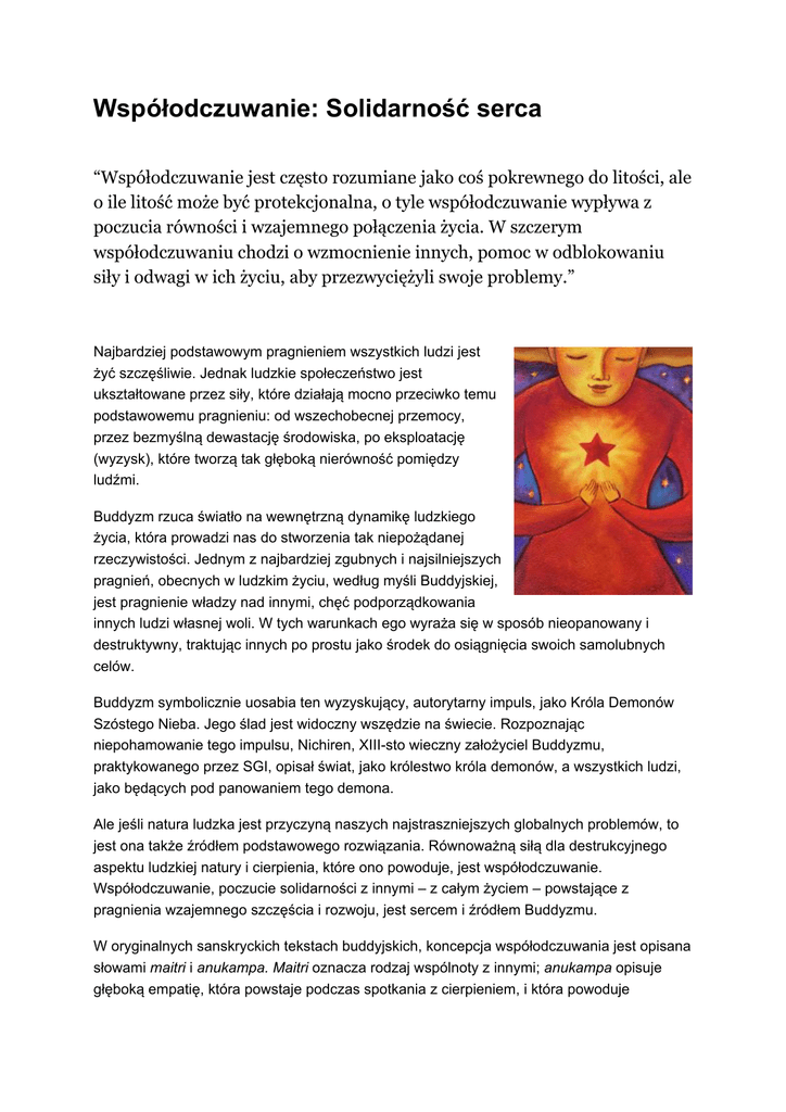 Współodczuwanie: Solidarność serca “Współodczuwanie jest często rozumiane jako coś pokrewnego do litości, ale o ile litość może być protekcjonalna, o tyle współodczuwanie wypływa z poczucia równości i wzajemnego połączenia życia. W szczerym współodczuwaniu chodzi o wzmocnienie innych, pomoc w odblokowaniu siły i odwagi w ich życiu, aby przezwyciężyli swoje problemy.” Najbardziej podstawowym pragnieniem wszystkich ludzi jest żyć szczęśliwie. Jednak ludzkie społeczeństwo jest ukształtowane przez siły, które działają mocno przeciwko temu podstawowemu pragnieniu: od wszechobecnej przemocy, przez bezmyślną dewastację środowiska, po eksploatację (wyzysk), które tworzą tak głęboką nierówność pomiędzy ludźmi. Buddyzm rzuca światło na wewnętrzną dynamikę ludzkiego życia, która prowadzi nas do stworzenia tak niepożądanej rzeczywistości. Jednym z najbardziej zgubnych i najsilniejszych pragnień, obecnych w ludzkim życiu, według myśli Buddyjskiej, jest pragnienie władzy nad innymi, chęć podporządkowania innych ludzi własnej woli. W tych warunkach ego wyraża się w sposób nieopanowany i destruktywny, traktując innych po prostu jako środek do osiągnięcia swoich samolubnych celów. Buddyzm symbolicznie uosabia ten wyzyskujący, autorytarny impuls, jako Króla Demonów Szóstego Nieba. Jego ślad jest widoczny wszędzie na świecie. Rozpoznając niepohamowanie tego impulsu, Nichiren, XIIIsto wieczny założyciel Buddyzmu, praktykowanego przez SGI, opisał świat, jako królestwo króla demonów, a wszystkich ludzi, jako będących pod panowaniem tego demona. Ale jeśli natura ludzka jest przyczyną naszych najstraszniejszych globalnych problemów, to jest ona także źródłem podstawowego rozwiązania. Równoważną siłą dla destrukcyjnego aspektu ludzkiej natury i cierpienia, które ono powoduje, jest współodczuwanie. Współodczuwanie, poczucie solidarności z innymi – z całym życiem – powstające z pragnienia wzajemnego szczęścia i rozwoju, jest sercem i źródłem Buddyzmu. W oryginalnych sanskryckich tekstach buddyjskich, koncepcja współodczuwania jest opisana słowami maitri i anukampa. Maitri oznacza rodzaj wspólnoty z innymi; anukampa opisuje głęboką empatię, która powstaje podczas spotkania z cierpieniem, i która powoduje działanie. Buddyjskie współodczuwanie mogłoby być więc zwięźle opisane, jako pragnienie ulżenia w cierpieniu i dania radości. Współodczuwanie jest często rozumiane jako coś pokrewnego do litości, ale o ile litość może być protekcjonalna, o tyle współodczuwanie wypływa z poczucia równości i wzajemnego połączenia życia. Współodczuwanie jest zakorzenione w szacunku dla wrodzonej godności życia – naszego własnego i innych – i pragnienia, aby zobaczyć, że ona zwycięża. Jak pisze Prezydent SGI Daisaku Ikeda, „Prawdziwe Buddyjskie współodczuwanie nie ma nic wspólnego z sentymentalnością, czy zwykłą litością. Tak jest, ponieważ sentymentalność lub zwykła litość nie mogą pomóc drugiej osobie osiągnąć w życiu zwycięstwa; nie mogą naprawdę ulżyć w cierpieniu i dodać radości.” Ponieważ w szczerym współodczuwaniu chodzi o wzmocnienie innych, pomoc w odblokowaniu siły i odwagi w ich życiu, aby przezwyciężyli swoje problemy, może czasami wydawać się surowe lub sprzeczne. Na przykład, chociaż rozwiązanie za kogoś trudnej sytuacji może się wydawać współodczuwaniem, to jeśli w ten sposób uczynimy go słabszym i mniej samodzielnym, to nie przyczynimy się do jego rzeczywistego szczęścia w życiu. Sednem współodczuwania jest wzmacnianie. Wysiłek, aby udzielić innym zachętę, skuteczną w ich konkretnych okolicznościach, jest tym, co aktywuje mądrość. Współodczuwanie i mądrość są więc blisko spokrewnione. Co więcej, nawet niewielki akt dobroci wymaga pewnej odwagi. Nichiren ustanowił praktykę czantowania Nammohorengekyo, jako praktyczny środek, umożliwiający ludziom wydobycie siły i bogatego potencjału ich człowieczeństwa oraz życie z pewnością siebie i radością. Dzielenie się tą praktyką z innymi jest więc najbardziej podstawowym aktem współodczuwania dla praktykujących Buddyzm Nichirena. Przekształcenie społeczeństwa może się dokonać tylko poprzez przekształcenie ludzkich serc. Życie oparte o współodczuwanie oznacza głęboką wiarę w nieuświadomiony potencjał innych i własny. W obliczu własnej porażki i z powodu głupoty łatwo jest zrezygnować z siebie i innych; taka utrata wiary w człowieczeństwo jest typowa dla naszego dzisiejszego, trudnego świata. Nieustanne wierzenie i wzmacnianie tej wewnętrznej dobroci oraz potencjału życia naszego i innych, jest sercem filozofii Buddyzmu Nichirena. Jest to także podstawą silnego optymizmu, na którym wszyscy ludzi mogą oprzeć swoje działania, aby spowodować pozytywną zmianę w naszym świecie. [Dzięki uprzejmości SGI Quarterly z lipca 2010]