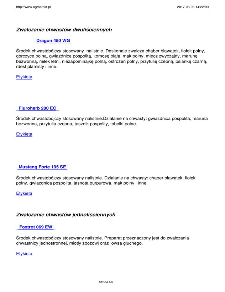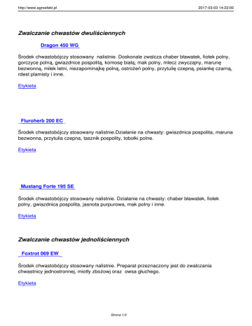 http://www.agroefekt.pl 2017-03-03 14:22:00 Zwalczanie chwastów dwuliściennych Dragon 450 WG Środek chwastobójczy stosowany nalistnie. Doskonale zwalcza chaber bławatek, fiołek polny, gorczyce polną, gwiazdnice pospolitą, komosę białą, mak polny, mlecz zwyczajny, marunę bezwonną, miłek letni, niezapominajkę polną, ostrożeń polny, przytulię czepną, psiankę czarną, rdest plamisty i inne. Etykieta Fluroherb 200 EC Środek chwastobójczy stosowany nalistnie.Działanie na chwasty: gwiazdnica pospolita, maruna bezwonna, przytulia czepna, tasznik pospolity, tobołki polne. Etykieta Mustang Forte 195 SE Środek chwastobójczy stosowany nalistnie. Działanie na chwasty: chaber bławatek, fiołek polny, gwiazdnica pospolita, jasnota purpurowa, mak polny i inne. Etykieta Zwalczanie chwastów jednoliściennych Foxtrot 069 EW Środek chwastobójczy stosowany nalistnie. Preparat przeznaczony jest do zwalczania chwastnicy jednostronnej, miotły zbożowj oraz owsa głuchego. Etykieta Strona 1/3 http://www.agroefekt.pl 2017-03-03 14:22:00 Apyros 75 WG Środek chwastobójczy stosowany nalistnie. Działanie na chwasty: chwastnica jednostronna, gwiazdnica pospolita, gorczyca polna, miotła zbozowa, perz właściwy, rdest plamisty, samosiewy rzepaku, stulicha psia, tasznik pospolity oraz tobołki polne. Etykieta Izoproturon 500 SC Środek chwastobójczy stosowany nalistnie. Działanie na chwasty: chaber bławatek, gwiazdnica pospolita, mak polny, miotła zbożowa, niezapominajka polna i inne. Etykieta Axial 100 EC Środek chwastobójczy stosowany nalistnie. Przeznaczony do zwalczania miotły zbożowej w pszenicy ozimej i jęczmieniu ozimym, wyczyńca polnego w pszenicy ozimej, owsa głuchego w uprawie pszenicy jarej i jęczmienia jarego. Preparat stosowany jest w mieszaninie z adiuwantem Adigor 440 EC. Etykieta Herbicydy kompletne Zeus 208 WG + Nuance 75 WG Środki chwastobójcze stosowane nalistnie. Doskonale zwalcza takie chwasty jak: fiołek polny, jasnota purpurowa, maruna bezwonna, miotła zbożowa, przetacznik perski i przytulię czepną. Strona 2/3 http://www.agroefekt.pl 2017-03-03 14:22:00 Etykieta Lancet Plus 125 WG Środek chwastobójczy stosowany nalistnie. Działanie na chwasty: mak polny, miota zbożowa, maruna bezwonna, przetacznik polny, rdest powojowy, samosiewy rzepaku i inne. Etykieta Huzar Activ 387 OD Środek chwastobójczy stosowany nalistnie. Działanie na chwasty: bodziszek drobny, chaber bławatek, iglica pospolita, jasnoty, komosa biała, rumian polny, sporek polny i inne. Etykieta Strona 3/3