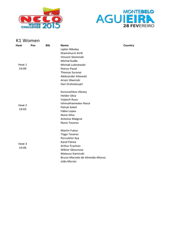 K1 Women Heat Heat 1 14:00 Pos Bib Name Lipkin Nikolay Shamshurin Kirill Vincent Slominski Michal Kudla Michak Lubniewski Petrov Pavel Thomas Suranyi Aleksander Kitewski Arsen Sliwinski Dan Drahokoupil Heat 2 14:03 Korovashkov Alexey Helder Silva Vojtech Ruso Ishmukhamedov Rasul Patryk Sokol Fábio Lopes Nuno Silva Antoine Maigrot Nuno Tavares Heat 3 14:06 Martin Fuksa Tiago Tavares Pervukhin Ilya Karel Palma Arthur Frachon Wiktor Glazunow Mateusz Kaminski Bruno Marcelo de Almeida Afonso João Morais Country K1 Women Heat Name Podolskaya Natalya Karolina Naja Chernigovskaya Svetlana Edyta Dzieniszewska Emilia Cywinska Anna Godek Anna Pulawska Anna Wlosik Karolina Pielin Aleksandra Janicka Country RUS POL RUS POL POL POL POL POL POL POL Heat 2 15:03 Terekhova Elena Marta Walczykiewicz Beata Mikolajczyk Anyushina Elena Vilma Nedbalová Andreia Fernandes Dominika Wlodarczyk Martyna Lisiecka Dominika Napolska Aleksandra Górna RUS POL POL RUS CZE POR POL POL POL POL Heat 3 15:06 Stepanova Kira Teresa Portela Joanna Bruska Ewelina Wojnarowska Karolina Markiewicz Bruna Patricia Carvalho Correia Chervova Anzhelika Malgorzata Pulawska Beatriz Reis Joana Sousa RUS POR POL POL POL POR RUS POL POR POR Heat 1 15:00 Pos Bib K1 Men Heat Heat 1 16:00 Pos Bib Name Mark De Jonge Postrigay Yury Diogo Fazenda Blintsov Vladislav Lukantsov Evgeniy David Fernandes João Figueiredo Sinyavin Oleg Bruno Silva Hugo Figueiras Jose Vieira Heat 2 16:03 João Ribeiro Diogo Lopes Sergeev Alexander Gusev Oleg Spesivtsev Maksim José Tiago Neves Carvalho João Filipa Ribeiro Cruz Daniel Filipe Faria da Cunha Alfredo Faria Jorge Castro Heat 3 16:06 Emanuel Silva Hugo Pinto Rocha Mandrazhiev Vladislav Benjamin Tournade Johann Divaret André Santos Paulo Pinto Adriano Coelho Miguel Rodrigues Diogo Lacerda Country