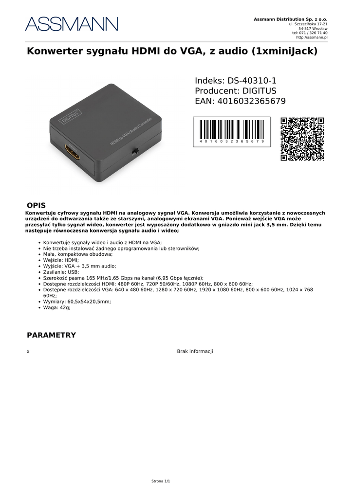Assmann Distribution Sp. z o.o. ul. Szczecińska 17-21 54-517 Wrocław tel: 071 / 326 71 40 http://assmann.pl Konwerter sygnału HDMI do VGA, z audio (1xminiJack) Indeks: DS-40310-1 Producent: DIGITUS EAN: 4016032365679 4 0 1 6 0 3 2 3 6 5 6 7 9 OPIS Konwertuje cyfrowy sygnału HDMI na analogowy sygnał VGA. Konwersja umożliwia korzystanie z nowoczesnych urządzeń do odtwarzania także ze starszymi, analogowymi ekranami VGA. Ponieważ wejście VGA może przesyłać tylko sygnał wideo, konwerter jest wyposażony dodatkowo w gniazdo mini jack 3,5 mm. Dzięki temu następuje równoczesna konwersja sygnału audio i wideo; Konwertuje sygnały wideo i audio z HDMI na VGA; Nie trzeba instalować żadnego oprogramowania lub sterowników; Mała, kompaktowa obudowa; Wejście: HDMI; Wyjście: VGA + 3,5 mm audio; Zasilanie: USB; Szerokość pasma 165 MHz/1,65 Gbps na kanał (6,95 Gbps łącznie); Dostępne rozdzielczości HDMI: 480P 60Hz, 720P 50/60Hz, 1080P 60Hz, 800 x 600 60Hz; Dostępne rozdzielczości VGA: 640 x 480 60Hz, 1280 x 720 60Hz, 1920 x 1080 60Hz, 800 x 600 60Hz, 1024 x 768 60Hz; Wymiary: 60,5x54x20,5mm; Waga: 42g; PARAMETRY x Brak informacji Strona 1/1 Powered by TCPDF (www.tcpdf.org)