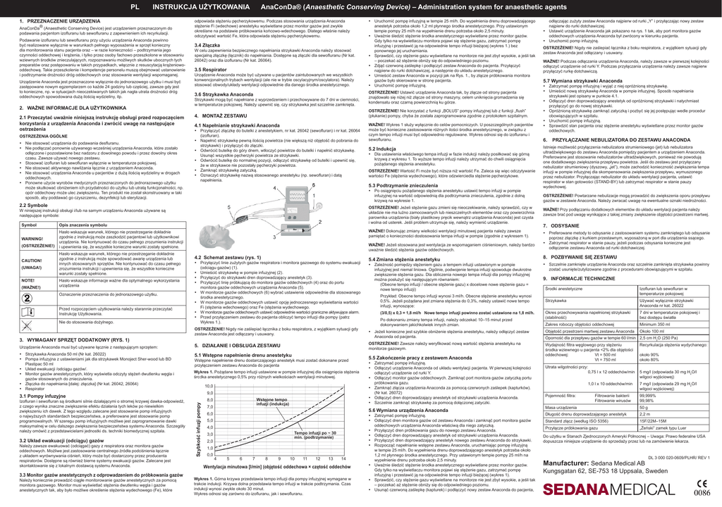 PL Instrukcja użytkowania 1. PRZEZNACZENIE URZĄDZENIA AnaConDa® (Anaesthetic Conserving Device) jest urządzeniem przeznaczonym do podawania pacjentom izofluranu lub sewofluranu z zapewnieniem ich recyrkulacji. Podawanie izofluranu lub sewofluranu przy użyciu urządzenia Anaconda powinno być realizowane wyłącznie w warunkach pełnego wyposażenia w sprzęt konieczny dla monitorowania stanu pacjenta oraz – w razie konieczności – podtrzymania jego czynności oddechowej i krążenia, i tylko przez osoby fachowo przeszkolone w stosowaniu wziewnych środków znieczulających, rozpoznawaniu możliwych skutków ubocznych tych preparatów oraz postępowaniu w takich przypadkach, włącznie z resuscytacją krążeniowooddechową. Takie przeszkolenie i kompetencje personelu muszą obejmować ustanowienie i podtrzymanie drożności dróg oddechowych oraz stosowanie wentylacji wspomaganej. Urządzenie Anaconda jest przeznaczone wyłącznie do jednorazowego użytku i musi być zastępowane nowym egzemplarzem co każde 24 godziny lub częściej, zawsze gdy jest to konieczne, np. w sytuacjach nieoczekiwanych takich jak nagła utrata drożności dróg oddechowych spowodowana dużą ilością wydzieliny, itp. 2.WAŻNE INFORMACJE DLA UŻYTKOWNIKA 2.1 Przeczytać uważnie niniejszą instrukcję obsługi przed rozpoczęciem korzystania z urządzenia Anaconda i zwrócić uwagę na następujące ostrzeżenia OSTRZEŻENIA OGÓLNE • Nie stosować urządzenia do podawania desfluranu. • Nie podłączać ponownie używanego wcześniej urządzenia Anaconda, które zostało odłączone i pozostawione bez nadzoru z dowolnego powodu i przez dowolny okres czasu. Zawsze używać nowego zestawu. • Stosować izofluran lub sewofluran wyłącznie w temperaturze pokojowej. • Nie stosować aktywnego nawilżania łącznie z urządzeniem Anaconda. • Nie stosować urządzenia Anaconda u pacjentów z dużą ilością wydzieliny w drogach oddechowych. • Ponowne użycie wyrobów medycznych przeznaczonych do jednorazowego użytku może skutkować obniżeniem ich przydatności do użytku lub utratą funkcjonalności, np. opór oddechowy może ulec zwiększeniu. Ten produkt nie został skonstruowany w taki sposób, aby poddawać go czyszczeniu, dezynfekcji lub sterylizacji. AnaConDa® (Anaesthetic Conserving Device) – Administration system for anaesthetic agents odpowiada stężeniu pęcherzykowemu. Podczas stosowania urządzenia Anaconda stężenie Fi (wdechowe) anestetyku wyświetlane przez monitor gazów jest zwykle określane na podstawie próbkowania końcowo-wdechowego. Dlatego właśnie należy odczytywać wartość Fe, która odpowiada stężeniu pęcherzykowemu. 3.4 Złączka W celu zapewnienia bezpiecznego napełniania strzykawki Anaconda należy stosować specjalną złączkę (łącznik) do napełniania. Dostępne są złączki dla sewofluranu (Nr kat. 26042) oraz dla izofluranu (Nr kat. 26064). 3.5 Respirator Urządzenie Anaconda może być używane u pacjentów zaintubowanych we wszystkich konwencjonalnych trybach wentylacji (ale nie w trybie oscylacyjnym/oscylatora). Należy stosować obwody/układy wentylacji odpowiednie dla danego środka anestetycznego. 3.6 Strzykawka Anaconda Strzykawki mogą być napełniane z wyprzedzeniem i przechowywane do 7 dni w ciemności, w temperaturze pokojowej. Należy upewnić się, czy strzykawka jest szczelnie zamknięta. 4.1 Napełnianie strzykawki Anaconda • Przyłączyć złączkę do butelki z anestetykiem, nr kat. 26042 (sewofluran) i nr kat. 26064 (izofluran). • Napełnić strzykawkę pewną ilością powietrza (nie większą niż objętość do pobrania do strzykawki) i przyłączyć do złączki. • Odwrócić butelkę do góry dnem, wtłoczyć powietrze do butelki i napełnić strzykawkę. Usunąć wszystkie pęcherzyki powietrza ze strzykawki. • Odwrócić butelkę do normalnej pozycji, odłączyć strzykawkę od butelki i upewnić się, że w strzykawce nie pozostały pęcherzyki powietrza. • Zamknąć strzykawkę zatyczką. • Oznaczyć strzykawkę nazwą stosowanego anestetyku (np. sewofluran) i datą napełnienia. WARNING! Hasło wskazuje warunek, którego nie przestrzeganie dokładnie zgodnie z instrukcją może zaszkodzić pacjentowi lub użytkownikowi urządzenia. Nie kontynuować do czasu pełnego zrozumienia instrukcji i upewnienia się, że wszystkie konieczne warunki zostały spełnione. (OSTRZEŻENIE!) CAUTION! (UWAGA!) NOTE! (WAŻNE!) Hasło wskazuje warunek, którego nie przestrzeganie dokładnie zgodnie z instrukcją może spowodować awarię urządzenia lub innych stosowanych sprzętów. Nie kontynuować do czasu pełnego zrozumienia instrukcji i upewnienia się, że wszystkie konieczne warunki zostały spełnione. Hasło wskazuje informacje ważne dla optymalnego wykorzystania urządzenia Oznaczenie przeznaczenia do jednorazowego użytku. EN 980:2008 (E) SS-EN 980:2008 (E) 5.18 Symbol for "CONSULT INSTRUCTIONS FOR USE" Przed rozpoczęciem użytkowania należy starannie przeczytać Instrukcję Użytkowania. NOTE 1 Synonym for "Consult instructions for use" is "Consult operating instructions". NOTE 2 This symbol corresponds to that given in ISO 7000-1641 and to symbol number 5.3 in ISO 15223-1:2007. 5.19 Symbol for "BIOLOGICAL RISKS" Nie do stosowania dożylnego. NOTE 4.2 Schemat zestawu (rys. 1) • Przyłączyć linie zużytych gazów respiratora i monitora gazowego do systemu ewakuacji (odciągu gazów) (1). • Umieścić strzykawkę w pompie infuzyjnej (2). • Przyłączyć do strzykawki dren doprowadzający anestetyk (3). • Przyłączyć linię próbkującą do monitora gazów oddechowych (4) oraz do portu monitora gazów oddechowych urządzenia Anaconda (5). • W monitorze gazów oddechowych (6) wybrać ustawienie odpowiednie dla stosowanego środka anestetycznego. • W monitorze gazów oddechowych ustawić opcję jednoczesnego wyświetlania wartości Fi (stężenia wdechowego) oraz Fe (stężenia wydechowego. •