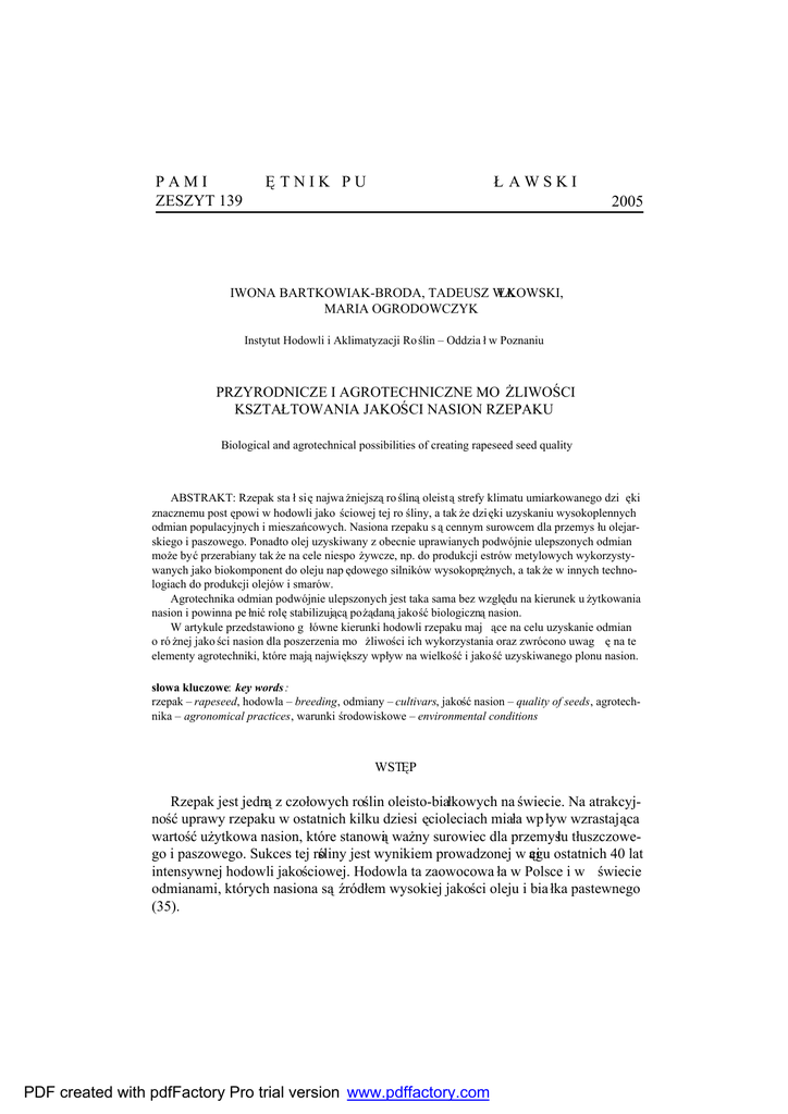 PAMI ZESZYT 139 ĘTNIK PU Ł AWSKI 2005 IWONA BARTKOWIAK-BRODA, TADEUSZ WA ŁKOWSKI, MARIA OGRODOWCZYK Instytut Hodowli i Aklimatyzacji Ro ślin – Oddzia ł w Poznaniu PRZYRODNICZE I AGROTECHNICZNE MO ŻLIWOŚCI KSZTAŁTOWANIA JAKOŚCI NASION RZEPAKU Biological and agrotechnical possibilities of creating rapeseed seed quality ABSTRAKT: Rzepak sta ł się najwa żniejszą ro śliną oleistą strefy klimatu umiarkowanego dzi ęki znacznemu post ępowi w hodowli jako ściowej tej ro śliny, a tak że dzi ęki uzyskaniu wysokoplennych odmian populacyjnych i mieszańcowych. Nasiona rzepaku s ą cennym surowcem dla przemys łu olejarskiego i paszowego. Ponadto olej uzyskiwany z obecnie uprawianych podwójnie ulepszonych odmian może być przerabiany tak że na cele niespo żywcze, np. do produkcji estrów metylowych wykorzystywanych jako biokomponent do oleju nap ędowego silników wysokoprężnych, a tak że w innych technologiach do produkcji olejów i smarów. Agrotechnika odmian podwójnie ulepszonych jest taka sama bez względu na kierunek u żytkowania nasion i powinna pe łnić rolę stabilizującą pożądaną jakość biologiczną nasion. W artykule przedstawiono g łówne kierunki hodowli rzepaku maj ące na celu uzyskanie odmian o ró żnej jako ści nasion dla poszerzenia mo żliwości ich wykorzystania oraz zwrócono uwag ę na te elementy agrotechniki, które mają największy wpływ na wielkość i jakość uzyskiwanego plonu nasion. słowa kluczowe: key words : rzepak – rapeseed, hodowla – breeding, odmiany – cultivars, jakość nasion – quality of seeds, agrotechnika – agronomical practices, warunki środowiskowe – environmental conditions WSTĘP Rzepak jest jedną z czołowych roślin oleisto-białkowych na świecie. Na atrakcyjność uprawy rzepaku w ostatnich kilku dziesi ęcioleciach miała wp ływ wzrastająca wartość użytkowa nasion, które stanowią ważny surowiec dla przemysłu tłuszczowego i paszowego. Sukces tej ro śliny jest wynikiem prowadzonej w ągu ci ostatnich 40 lat intensywnej hodowli jakościowej. Hodowla ta zaowocowa ła w Polsce i w świecie odmianami, których nasiona są źródłem wysokiej jakości oleju i bia łka pastewnego (35). PDF created with pdfFactory Pro trial version www.pdffactory.com Instytut Hodowli i Aklimatyzacji Ro ślin – Oddzia ł w Poznaniu 8 [2] Światowa produkcja nasion rzepaku w ostatnim półwieczu zwiększyła się dziesięciokrotnie (tab. 1). W 2004 roku produkcja rzepaku w 25 krajach Unii Europejskiej osiągnęła poziom 14,6 mln ton, co stanowi 34,4% całej światowej produkcji rzepaku. W Polsce średnia powierzchnia uprawy rzepaku w okresie ostatnich sze ściu lat wynosiła około 460 tys. ha, plony nasion ukszta łtowały się na poziomie 2,18 t·ha -1, a całkowita produkcja na poziomie 1 mln ton, co w przybli żeniu pokrywało w tym okresie zapotrzebowanie krajowego przemysłu tłuszczowego na rzepak (tab. 2). Przerób przemysłowy nasion rzepaku w Polsce w ostatnim 10-leciu stanowi ł 87% ich rocznej średniej krajowej produkcji. Aktualnie roczna zdolno ść przerobowa prze- Tabela 1 Światowa produkcja nasion rzepaku i rzepiku w okresie powojennym World production of rapeseed and turnip rape in post war period Lata zbioru Years of harvest przed; before 1939 1948–1952* 1955 1960 1965 1970 1975 1980 * Produkcja nasion Seed production (mln ton) 4,0 2,8 3,5 3,5 5,0 6,7 8,1 10,6 Lata zbioru Years of harvest 1985 1990 1995 2000 2001 2002 2003 2004 Produkcja nasion Seed production (mln ton) 19,0 24,5 34,3 42,6 37,6 38,7 37,3 39,0 średnia z lat – źródło: Roczniki GUS; mean from years – source: GUS Annuals ** prognoza; forecast **40,9** Tabela 2 Produkcja rzepaku ozimego i jarego w Polsce w latach 1998–2003 Production of winter and summer rapeseed in Poland in years 1998–2003 Rok Year 1998 1999 2000 2001 2002 2003 Średnia Mean Powierzchnia zbioru; Harvested acreage rzepak ozimy rzepak jary całkowita winter rapeseed summer rapeseed total (1000 ha) (1000 ha) (%) (1000 ha) 376,0 90,0 19,3 466,0 442,2 103,1 18,9 545,3 371,7 65,1 14,9 436,8 412,6 30,6 6,9 443,2 401,3 37,7 8,6 439,0 345,3 81,0 19,0 426,3 391,5 67,9 14,8 459,4 Źródło: dane GUS, obliczenia w łasne; Source: GUS Annuals, own estimations PDF created with pdfFactory Pro trial version www.pdffactory.com Plon Yield (t·ha -1) Zbiór całkowity Total harvest (1000 t) 2,36 2,08 2,19 2,40 2,17 1,86 1099,1 1131,9 958,7 1063,6 952,7 793,0 2,18 999,8 [3] Przyrodnicze i agrotechniczne mo żliwości kształtowania... – I. Bartkowiak-Broda i in. 9 mysłu olejarskiego w Polsce wynosi oko ło 1,3 mln ton nasion. Należałoby wobec tego zapewnić stabilną produkcję rzepaku w kraju na takim poziomie. Ponadto powinien rozwinąć się, podobnie jak w innych krajach Unii Europejskiej, przerób rzepaku na cele niespo żywcze, głównie produkcja estrów metylowych wyższych kwasów tłuszczowych jako biokomponentów paliwa dla silników wysokopr ężnych, a także w innych technologiach do produkcji: olejów przemys łowych, smarów, farb drukarskich, farb, pokostów, oleochemikaliów, linoleum itp. (36). Największe zapotrzebowanie na olej rzepakowy z przeznaczeniem na cele niespożywcze związane jest z produkcją biopaliwa. Zainteresowanie możliwością wykorzystania olejów roślinnych jako paliw zastępczych do silników spalinowych podyktowane jest głównie koniecznością ochrony środowiska, przede wszystkim poprzez zmniejszenie emisji do atmosfery dwutlenku ęwgla, siarki i metali ciężkich. Zgodnie z Dyrektywą Unii Europejskiej w krajach cz łonkowskich Unii biopaliwa powinny stanowi ć do 2005 r. minimum 2% , a do 2010 r. 5,75% ogólnej produkcji paliwa. W Polsce obecnie wykorzystuje si ę rocznie około 6 mln ton oleju nap ędowego. Dodatek do oleju napędowego 5% biokomponentów jest możliwy przy produkcji niespełna 300 tysięcy ton estru metylowego, na co potrzeba dodatkowo oko ło 700 tysięcy ton nasion rzepaku. Nale żałoby