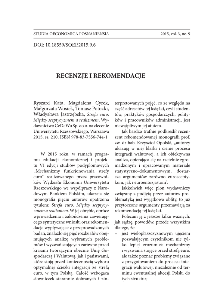 STUDIA OECONOMICA POSNANIENSIA 2015, vol. 3, no. 9 DOI: 10.18559/SOEP.2015.9.6 RECENZJE I REKOMENDACJE Ryszard Kata, Magdalena Cyrek, Małgorzata Wosiek, Tomasz Potocki, Władysława Jastrzębska, Strefa euro. Między sceptycyzmem a realizmem, Wydawnictwo CeDeWu Sp. z o.o. na zlecenie Uniwersytetu Rzeszowskiego, Warszawa 2015, ss. 210, ISBN 978-83-7556-744-1 W 2015 roku, w ramach programu edukacji ekonomicznej i pro jek tu VI edycji studiów podyplomowych „Mechanizmy funkcjonowania strefy euro” realizowanego przez pracowników Wydziału Ekonomii Uniwersytetu Rzeszowskiego we współpracy z Narodowym Bankiem Polskim, ukazała się monografia pięciu autorów opatrzona tytułem: Strefa euro. Między sceptycyzmem a realizmem. W jej obrębie, oprócz wprowadzenia i zakończenia zawierającego syntetyczne wnioski oraz rekomendacje wypływające z przeprowadzonych badań, znalazło się pięć rozdziałów obejmujących analizę wybranych problemów i wyzwań stojących zarówno przed krajami tworzącymi obecnie Unię Gospodarczą i Walutową, jak i państwami, które stoją przed koniecznością wyboru optymalnej ścieżki integracji ze strefą euro, w tym Polską. Całość wzbogaca słowniczek starannie dobranych i zin- terpretowanych pojęć, co ze względu na część adresatów tej książki, czyli studentów, praktyków gospodarczych, polityków i pracowników administracji, jest niewątpliwym jej atutem. Jak bardzo trafnie podkreślił recenzent rekomendowanej monografii prof. zw. dr hab. Krzysztof Opolski, „autorzy ukazują w niej blaski i cienie procesu integracji walutowej, a ich obiektywna analiza, opierająca się na rzetelnie zgromadzonym i opracowanym materiale statystyczno-dokumentowym, dostarcza argumentów zarówno eurosceptykom, jak i euroentuzjastom”. Jakkolwiek więc plon wydawniczy związany z podjętą przez autorów problematyką jest wyjątkowo obfity, to już przytoczone argumenty przemawiają za rekomendacją tej książki. Polecam ją z jeszcze kilku ważnych, jak sądzę, powodów, przede wszystkim dlatego, że: –– jest wielopłaszczyznowym ujęciem pozwalającym czytelnikom nie tylko lepiej zrozumieć mechanizmy i wyzwania stojące przed strefą euro, ale także poznać problemy związane z przygotowaniem do procesu integracji walutowej, niezależnie od terminu ewentualnej akcesji Polski do tych struktur; 112 Recenzje i rekomendacje –– ukazuje zarówno aspekty gospodarcze, jak i społeczne integracji gospodarczo-walutowej, jej uwarunkowania i konsekwencje traktowane jako wyzwania dla przedsiębiorstw, instytucji finansowych, władz i administracji samorządowej, a nawet gospodarstw domowych; –– autorzy odważnie, nie stroniąc od własnych przemyśleń, ale i z dużą wnikliwością, podjęli wiele kontrowersyjnych kwestii, sądów i opinii stanowiących podstawę bogatych oraz trafnie sformułowanych wniosków i postulatów; –– książka jest źródłem inspiracji skłaniających do różnej natury przemyśleń oraz refleksji. Takie podejście znalazło odbicie w logicznej strukturze książki, zredagowanej na podstawie bogatych i wnikliwie przeanalizowanych materiałów oraz właściwie dobranej i wykorzystanej literatury przedmiotu, zarówno krajowej, jak i zagranicznej. W rozdziale I, autorstwa Ryszarda Katy, pt.: Polityka fiskalna UE wobec kryzysu zadłużenia krajów strefy euro ukazane zostały trudne wyzwania związane z utworzeniem budżetu centralnego UE, wyrażające się m.in. w konieczności ustanowienia unii politycznej, związanej z kolei ze zgodą na: zmniejszenie suwerenności, przejęcie ryzyka za zobowiązania innych członków UGW powstałe w drodze emisji euroobligacji, utworzenie instytucji zarządzającej budżetem i ustanowienie skutecznej demokratycznej kontroli nad nią. Autor słusznie zatem podkreśla, że podstawowym warunkiem pogłębienia integracji fiskalnej w strefie euro jest wzmocnienie integra- cji politycznej, w szczególności uniknięcie możliwej utraty konkurencyjności krajów peryferyjnych. Rozdział II pt.: Wpływ kryzysu na zmiany społeczno-ekonomiczne w krajach UE o odmiennym zaawansowaniu integracji walutowej, napisany przez Magdalenę Cyrek, ukazuje na podstawie bogatych analiz statystycznych niski poziom konwergencji gospodarczej i społecznej w ramach strefy euro oraz wyraźne zróżnicowanie reakcji kryzysowych w pozostałych krajach UE, uwarunkowane odmiennymi przesłankami pozostawania poza UGW, przede wszystkim widoczną heterogenicznością gospodarczą krajów strefy euro. W rozdziale III pt.: Realna konwergencja krajów UE – wyzwania dla pogłębiania procesów integracji Małgorzata Wosiek koncentruje się na problemach konwergencji dochodowej i technologicznej wybranych 18 krajów UE w latach 1995–2013, ukazując m.in.: słabnącą dynamikę procesu konwergencji technologicznej w krajach Europy Środkowo-Wschodniej, związaną głównie z mechanizmami modernizacji technologicznej opartej na imporcie technologii i dyfuzji innowacji przynoszącymi wprawdzie efekty krótko- i średnioterminowe, lecz niedającymi gwarancji kontynuacji procesu w długim okresie. Autorka przekonująco argumentuje, że – niezależnie od zdynamizowania konwergencji dochodowej w tych krajach – wygasające tempo konwergencji technologicznej rodzi zagrożenie procesu pełnej integracji europejskiej. To z kolei przemawia za niespiesznym podążaniem Polski w kierunku integracji walutowej, lecz w takim tempie, aby Recenzje i rekomendacje113 zniwelować znamiona asymetryczności procesu integracji europejskiej. Rozdział IV pt. Wpływ kryzysu finansowego na poziom rozwoju systemu finansowego w Polsce na tle strefy euro i wybranych krajów świata, autorstwa Tomasza Potockiego, zawiera wieloaspektowe analizy podstawowych mierników rozwoju systemu finansowego w Polsce na tle wybranych gospodarek UE i świata i w ten sposób ukazuje ważny problem, mianowicie znaczenie i wpływ rozwoju rynków finansowych 