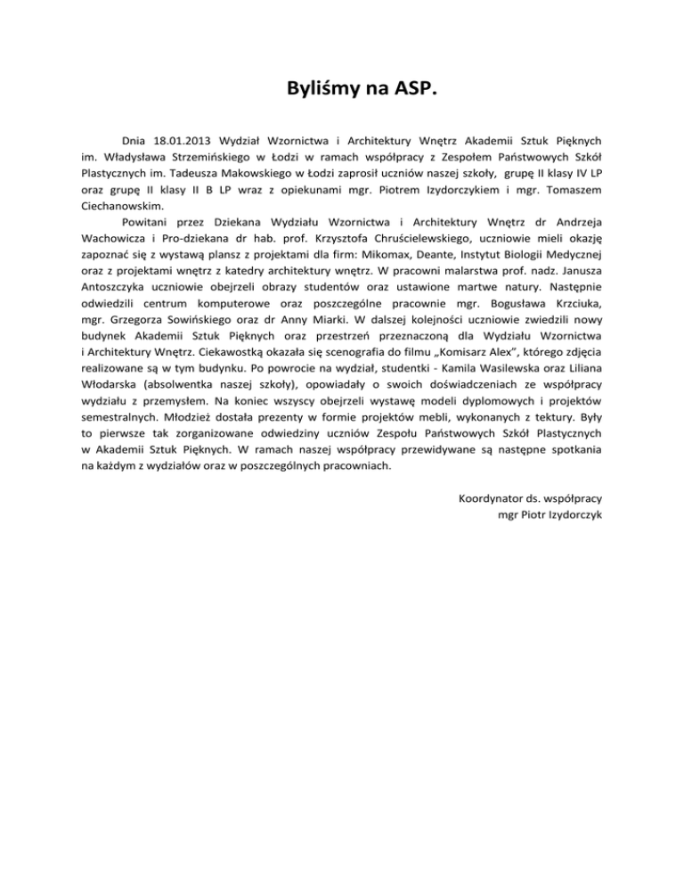 Byliśmy na ASP. Dnia 18.01.2013 Wydział Wzornictwa i Architektury Wnętrz Akademii Sztuk Pięknych im. Władysława Strzemińskiego w Łodzi w ramach współpracy z Zespołem Państwowych Szkół Plastycznych im. Tadeusza Makowskiego w Łodzi zaprosił uczniów naszej szkoły, grupę II klasy IV LP oraz grupę II klasy II B LP wraz z opiekunami mgr. Piotrem Izydorczykiem i mgr. Tomaszem Ciechanowskim. Powitani przez Dziekana Wydziału Wzornictwa i Architektury Wnętrz dr Andrzeja Wachowicza i Pro-dziekana dr hab. prof. Krzysztofa Chruścielewskiego, uczniowie mieli okazję zapoznać się z wystawą plansz z projektami dla firm: Mikomax, Deante, Instytut Biologii Medycznej oraz z projektami wnętrz z katedry architektury wnętrz. W pracowni malarstwa prof. nadz. Janusza Antoszczyka uczniowie obejrzeli obrazy studentów oraz ustawione martwe natury. Następnie odwiedzili centrum komputerowe oraz poszczególne pracownie mgr. Bogusława Krzciuka, mgr. Grzegorza Sowińskiego oraz dr Anny Miarki. W dalszej kolejności uczniowie zwiedzili nowy budynek Akademii Sztuk Pięknych oraz przestrzeń przeznaczoną dla Wydziału Wzornictwa i Architektury Wnętrz. Ciekawostką okazała się scenografia do filmu „Komisarz Alex”, którego zdjęcia realizowane są w tym budynku. Po powrocie na wydział, studentki - Kamila Wasilewska oraz Liliana Włodarska (absolwentka naszej szkoły), opowiadały o swoich doświadczeniach ze współpracy wydziału z przemysłem. Na koniec wszyscy obejrzeli wystawę modeli dyplomowych i projektów semestralnych. Młodzież dostała prezenty w formie projektów mebli, wykonanych z tektury. Były to pierwsze tak zorganizowane odwiedziny uczniów Zespołu Państwowych Szkół Plastycznych w Akademii Sztuk Pięknych. W ramach naszej współpracy przewidywane są następne spotkania na każdym z wydziałów oraz w poszczególnych pracowniach. Koordynator ds. współpracy mgr Piotr Izydorczyk