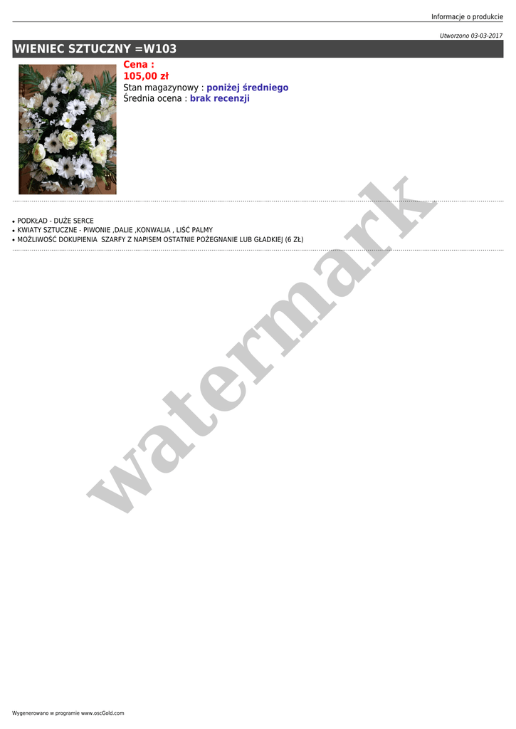 Informacje o produkcie Utworzono 03-03-2017 WIENIEC SZTUCZNY =W103 Cena : 105,00 zł ● ● PODKŁAD - DUŻE SERCE KWIATY SZTUCZNE - PIWONIE ,DALIE ,KONWALIA , LIŚĆ PALMY MOŻLIWOŚĆ DOKUPIENIA SZARFY Z NAPISEM OSTATNIE POŻEGNANIE LUB GŁADKIEJ (6 ZŁ) w at ● er m ar k Stan magazynowy : poniżej średniego Średnia ocena : brak recenzji Wygenerowano w programie www.oscGold.com