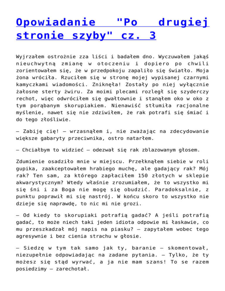 Opowiadanie "Po drugiej stronie szyby" cz. 3 Wyjrzałem ostrożnie zza liści i badałem dno. Wyczuwałem jakąś nieuchwytną zmianę w otoczeniu i dopiero po chwili zorientowałem się, że w przedpokoju zapaliło się światło. Moja żona wróciła. Rzuciłem się w stronę mojej wypisanej czarnymi kamyczkami wiadomości. Zniknęła! Zostały po niej wyłącznie żałosne sterty żwiru. Za moimi plecami rozległ się szyderczy rechot, więc odwróciłem się gwałtownie i stanąłem oko w oko z tym porąbanym skorupiakiem. Nienawiść stłumiła racjonalne myślenie, nawet się nie zdziwiłem, że rak potrafi się śmiać i do tego złośliwie. – Zabiję cię! – wrzasnąłem i, nie zważając na zdecydowanie większe gabaryty przeciwnika, ostro natarłem. – Chciałbym to widzieć – odezwał się rak zblazowanym głosem. Zdumienie osadziło mnie w miejscu. Przełknąłem siebie w roli gupika, zaakceptowałem hrabiego muchę, ale gadający rak? Mój rak? Ten sam, za którego zapłaciłem 150 złotych w sklepie akwarystycznym? Wtedy właśnie zrozumiałem, że to wszystko mi się śni i za Boga nie mogę się obudzić. Paradoksalnie, z punktu poprawił mi się nastrój. W końcu skoro to wszystko nie dzieje się naprawdę, to nic mi nie grozi. – Od kiedy to skorupiaki potrafią gadać? A jeśli potrafią gadać, to może niech taki jeden idiota odpowie mi łaskawie, co mu przeszkadzał mój napis na piasku? – zapytałem wobec tego agresywnie i bez cienia strachu w głosie. – Siedzę w niezupełnie możesz się posiedzimy – tym tak samo jak ty, baranie – skomentował, odpowiadając na zadane pytania. – Tylko, że ty stąd wyrwać, a ja nie mam szans! To se razem zarechotał. Porażony absurdem sytuacji parsknąłem śmiechem a z moich rybich ust posypały się perliste bąbelki. Do boku łasiła się samica, naprzeciw mnie stał rak i właśnie ogłaszał, że także jest ofiarą inwersji bez szans na powrót do własnego ciała, a do tego rybia brać właśnie wzmogła kotłowaninę w okolicach uchylonej pokrywy. Do kuchni weszła moja żona i pochyliła się zaglądając do wnętrza akwarium. Przez chwilę patrzyła uważnie a potem sypnęła do środka szczyptę pokarmu. Gupiki zwariowały. – Jesteś tu? – zapytała moja żona. Zdębiałem i podpłynąłem do samej szyby a wraz ze mną cała banda ryb. Nie dało się ich odgonić. Niczym się od nich nie odróżniałem. Chciałem dać żonie jakiś znak, ale nic sensownego nie przychodziło mi do głowy. – Chyba kompletnie zwariowałam – powiedziała, jednocześnie światło w moim więzieniu. gasząc Po raz pierwszy od chwili gdy tu utknąłem wodę spowił mrok. Kompletnie zdezorientowany tłukłem się pomiędzy roślinkami, po omacku próbując trafić do swojej kryjówki. – Nie chcesz wiedzieć kim jestem? – głos dobiegł z niebezpiecznie małej odległości. Wzmogłem czujność i nie zaryzykowałem odpowiedzi. Po cichu wycofałem się pod pierwsze zarośla, o jakie otarł się mój ogon. – Wiem gdzie jesteś, przede mną się nie ukryjesz – rak ewidentnie się nudził. Kuźwa, czym ja sobie zasłużyłem na to wszystko? Jakby wszystkiego było mało, mój prześladowca widzi w ciemnościach, podczas gdy ja jestem ślepy jak kret? – Otóż musisz wiedzieć, że jestem ważnym politykiem i swoją obecną postać zawdzięczam niefortunnemu spotkaniu podczas próby zjedzenia obiadu. Nawet najlżejszym szmerem nie zdradzałem swojej lokalizacji. Wzmianka o polityku dodatkowo wzmogła moją czujność. – To było w Tajlandii. Podszedł do stolika taki jeden kitajec, czy jak mu tam i zaciągnął mnie do akwarium. Przykucnąłem, zajrzałem i po chwili siedziałem już w środku. A moje ciało padło jak długie, zresztą dokładnie wiesz jak jest, więc co ci będę gadał. Co z nim dalej zrobili, to już nie wiem. Ja natomiast uratowałem się cudem. Pewnie skończyłbym na kupce ryżu, ale następnego dnia do knajpy przyszła grupa nawiedzonych akwarystów, takich łowców gatunków. Ich także kelner cholerny powiódł przed szybę i wtedy jeden z nich wskazał na mnie palcem i zaczął gorączkowo coś tam gadać. Chyba po angielsku gadał, bo nic nie rozumiałem, ale przeżegnałem się szczypcami, bo poczułem, że mój czas się kończy i zaraz wyląduję we wrzątku. Szczęście się jednak do mnie uśmiechnęło. Zapakowali mnie w foliowy worek i wręczyli temu gościowi. Ten sprzedał mnie innemu kolesiowi i dalej już poszło. W końcu trafiłem do akwarystycznego w którym mnie kupiłeś. Na swoje nieszczęście najwyraźniej, pomyślałem i bezszelestnie odpłynąłem głębiej, do samego systemu korzeniowego rośliny. – Nie mam pojęcia, gdzie jest moje ciało. Pewnie zostało w Tajlandii – głos raka przeszył nocną ciszę akwarium. Nie odpowiedziałem. Siedziałem przy korzeniu i nasłuchiwałem. Cisza, której tłem był kojący szmer brzęczyka podziałała usypiająco nie tylko na mojego prześladowcę. Odpłynąłem i śniłem. Wstałem z fotela i przeciągnąłem się. Żona, zwinięta w kłębek na kanapie oglądała jakieś pierdoły w telewizji. Miałem na dzisiaj dość komputera. Poszedłem do kuchni po piwo. – Nakarm ryby, dobrze? – zawołała żona z pokoju. Otworzyłem butelkę i postawiłem ją na kuchennym blacie. Z szafki wyjąłem opakowanie wybitnie śmierdzącego żarcia dla ryb. Wsypałem odrobinę do akwarium i usiadłem na stołku. Lubiłem podglądać wodne życie zamknięte w szklanym więzieniu. Pomiędzy gupiki wpadł rak, cholerny pasożyt i destruktor. Ryby rozpierzchły się na boki, ale jeden młody samiec nie zdążył. Niebieski skorupiak chwycił go szczypcami a ryba wiła się rozpaczliwie. Słuszny gniew we mnie zagrał i wsadziłem rękę do wody. Bacznie śledząc sytuację w akwarium manewrowałem dłonią, by uchwycić cholernika. Gdy w końcu go unieruchomiłem, ten wyciągnął w stronę szyby wijącą się rybę. W jej oczach w