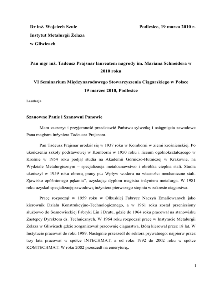 Dr inż. Wojciech Szulc Podlesice, 19 marca 2010 r. Instytut Metalurgii Żelaza w Gliwicach Pan mgr inż. Tadeusz Prajsnar laureatem nagrody im. Mariana Schneidera w 2010 roku VI Seminarium Międzynarodowego Stowarzyszenia Ciągarskiego w Polsce 19 marzec 2010, Podlesice Laudacja Szanowne Panie i Szanowni Panowie Mam zaszczyt i przyjemność przedstawić Państwu sylwetkę i osiągnięcia zawodowe Pana magistra inżyniera Tadeusza Prajsnara. Pan Tadeusz Prajsnar urodził się w 1937 roku w Komborni w ziemi krośnieńskiej. Po ukończeniu szkoły podstawowej w Komborni w 1950 roku i liceum ogólnokształcącego w Krośnie w 1954 roku podjął studia na Akademii Górniczo-Hutniczej w Krakowie, na Wydziale Metalurgicznym – specjalizacja metaloznawstwo i obróbka cieplna stali. Studia ukończył w 1959 roku obroną pracy pt.: Wpływ wodoru na własności mechaniczne stali. Zjawisko opóźnionego pękania”, uzyskując dyplom magistra inżyniera metalurga. W 1981 roku uzyskał specjalizację zawodową inżyniera pierwszego stopnia w zakresie ciągarstwa. Pracę rozpoczął w 1959 roku w Olkuskiej Fabryce Naczyń Emaliowanych jako kierownik Działu Konstrukcyjno-Technologicznego, a w 1961 roku został przeniesiony służbowo do Sosnowieckiej Fabryki Lin i Drutu, gdzie do 1964 roku pracował na stanowisku Zastępcy Dyrektora ds. Technicznych. W 1964 roku rozpoczął pracę w Instytucie Metalurgii Żelaza w Gliwicach gdzie zorganizował pracownię ciągarstwa, którą kierował przez 18 lat. W Instytucie pracował do roku 1989. Następnie przeszedł do sektora prywatnego: najpierw przez trzy lata pracował w spółce INTECHMAT, a od roku 1992 do 2002 roku w spółce KOMTECHMAT. W roku 2002 przeszedł na emeryturę,. 1 Osiągnięcia zawodowe Tadeusza Prajsnara są różnorodne. Okres pracy w przemyśle to głównie realizacja zadań technologicznych, zmierzających do uruchomiania produkcji nowych wyrobów, np. lin dla górnictwa czy drutów dla przemysłu gumowego. W okresie pracy w Instytucie wykonywał badania naukowe, realizował wdrożenia i ekspertyzy oraz prowadził szeroką działalność racjonalizatorska i wynalazcza. W trakcie 25 lat pracy w Instytucie Tadeusz Prajsnar zrealizował jako autor i współautor ponad 80 prac badawczo-rozwojowych, opublikował około 50 artykułów w czasopismach krajowych i zagranicznych, wygłosił ponad 40 referatów i odczytów na krajowych i zagranicznych konferencjach naukowych oraz zrealizował ponad 30 wdrożeń. Działalność naukowa Tadeusza Prajsnara dotyczyła głównie przeróbki plastycznej stali na zimno, zwłaszcza procesów ciągnienia drutów, prętów i rur, a także walcowania taśm i blach. Były to opracowania nowych wyrobów i technologii ich wytwarzania, nowoczesnych narzędzi i urządzeń do przeróbki plastycznej. Działalność racjonalizatorska i wynalazcza Tadeusza Prajsnara zaowocowała uzyskaniem ponad 70 patentów krajowych i ponad 30 patentów zagranicznych, z czego ponad 15 patentów zostało wdrożone. W wyniku działalności wynalazczej Tadeusza Prajsnara wraz z zespołem IMŻ zrealizowano 7 zagranicznych kontraktów licencyjnych (m.in. Niemcy, Belgia, Włochy, Japonia). Działalność wynalazcza Tadeusza Prajsnara skupiała się głównie na opracowywaniu nowych konstrukcji narzędzi oraz nowych sposobów wytwarzania niektórych wyrobów ciągnionych. Do najważniejszych osiągnięć na tym polu należą ciągadło ciśnieniowe oraz ciągadło obrotowe. Praca naukowa Tadeusza Prajsnara była wielokrotnie i różnorodnie doceniana i nagradzana. Do najważniejszych nagród i wyróżnień zaliczyć należy nagrodę państwową I-go stopnia w dziedzinie nauki, techniki i sztuki w zakresie metalurgii za „Opracowanie nowych konstrukcji ciągadeł ciśnieniowych i ich wdrożenie w przemyśle krajowym i za granicą” w 1978 roku oraz nagrodę zespołową Ministra Hutnictwa i Przemysłu Maszynowego za „Kompleksowe opracowanie technologii i uruchomienie produkcji specjalnie głęboko tłocznych blach o gwarantowanej anizotropii normalnej” w 1982 roku. 2 Tadeusz Prajsnar został również odznaczony za swą działalność zawodową odznaczeniami państwowymi: Srebrnym i Złotym Krzyżem Zasługi odpowiednio w latach 1972 i 1978 oraz Krzyżem Kawalerskim Orderu Odrodzenia Polski w 1986 roku. Działalność racjonalizatorska i wynalazcza Tadeusza Prajsnara została wielokrotnie nagradzana nagrodami i wyróżnieniami różnego stopnia, np. Zasłużony Racjonalizator Produkcji w 1973 roku, Mistrz Techniki w 1974 roku oraz Hutniczy Mistrz Racjonalizacji w 1980 roku. Tadeusz Prajsnar był czynnym i wybitnym rzeczoznawcą Stowarzyszenia Inżynierów i Techników Przemysłu Hutniczego (SiTPH) oraz Stowarzyszenia Inżynierów Mechaników Polskich (SIMP). Tadeusz Prajsnar zasłużył się znacząco w rozwoju ciągarstwa w Polsce i za granicą. Jego osiągnięcia zawodowe świadczą o nieprzeciętnym umyśle i ogromnej pracowitości. Innowacyjny sposób myślenia pozwalał mu w sposób niekonwencjonalny rozwiązywać trudne zagadnienia. Dzisiejsze wyróżnienie można traktować jako ukoronowanie długiej, trudnej i owocnej zawodowej drogi inżynierskiej Tadeusza Prajsnara. Obaj laureaci, tj. Tadeusz Prajsnar i Edward Zgłobicki ściśle ze sobą współpracowali, a znaczna część dorobku jest efektem ich wspólnych działań. 3