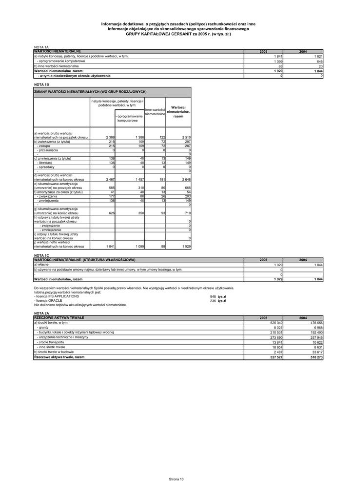 Informacja dodatkowa o przyjętych zasadach (polityce) rachunkowości oraz inne informacje objaśniające do skonsolidowanego sprawozdania finansowego GRUPY KAPITAŁOWEJ CERSANIT za 2005 r. (w tys. zł.) NOTA 1A WARTOŚCI NIEMATERIALNE a) nabyte koncesje, patenty, licencje i podobne wartości, w tym: - oprogramowanie komputerowe b) inne wartości niematerialne Wartości niematerialne razem: - w tym o nieokreślonym okresie użytkowania 2005 2004 1 841 1 099 88 1 929 0 1 821 646 23 1 844 0 NOTA 1B ZMIANY WARTOŚCI NIEMATERIALNYCH (WG GRUP RODZAJOWYCH) nabyte koncesje, patenty, licencje i podobne wartości, w tym: Wartości inne wartości niematerialne, niematerialne razem - oprogramowanie komputerowe a) wartość brutto wartości niematerialnych na początek okresu b) zwiększenia (z tytułu) - zakupu - przesunięcia c) zmniejszenia (z tytułu) - likwidacji - sprzedaży d) wartość brutto wartości niematerialnych na koniec okresu e) skumulowana amortyzacja (umorzenie) na początek okresu f) amortyzacja za okres (z tytułu) - zwiększenia - zmniejszenia g) skumulowana amortyzacja (umorzenie) na koniec okresu h) odpisy z tytułu trwałej utraty wartości na początek okresu - zwiększenie - zmniejszenie i) odpisy z tytułu trwałej utraty wartości na koniec okresu j) wartość netto wartości niematerialnych na koniec okresu 2 388 215 215 0 1 388 109 109 0 122 72 72 0 2 510 287 287 0 0 149 149 0 0 136 136 0 40 40 0 13 13 0 2 467 1 457 181 2 648 585 41 177 136 310 48 88 40 80 13 26 13 665 54 203 149 0 626 358 93 719 0 0 0 0 1 841 1 099 88 1 929 NOTA 1C WARTOŚCI NIEMATERIALNE (STRUKTURA WŁASNOŚCIOWA) a) własne b) używane na podstawie umowy najmu, dzierżawy lub innej umowy, w tym umowy leasingu, w tym: Wartości niematerialne, razem 2005 2004 1 929 0 0 1 929 1 844 1 844 Do wszystkich wartości niematerialnych Spółki posiadą prawo własności. Nie występują wartości o nieokreślonym okresie użytkowania. Istotną pozycją wartości niematerialnych jest: - licencja IFS APPLICATIONS 948 tys.zł - licencja ORACLE 236 tys.zł Nie dokonano odpisów aktualizujących wartości niematerialne. NOTA 2A RZECZOWE AKTYWA TRWAŁE a) środki trwałe, w tym: - grunty - budynki, lokale i obiekty inżynierii lądowej i wodnej - urządzenia techniczne i maszyny - środki transportu - inne środki trwałe b) środki trwałe w budowie Rzeczowe aktywa trwałe, razem 2005 2004 525 040 8 021 210 531 273 690 13 841 18 957 2 487 527 527 Strona 10 476 656 6 968 192 490 257 945 10 622 8 631 33 617 510 273 Informacja dodatkowa o przyjętych zasadach (polityce) rachunkowości oraz inne informacje objaśniające do skonsolidowanego sprawozdania finansowego GRUPY KAPITAŁOWEJ CERSANIT za 2005 r. (w tys. zł.) NOTA 2B ZMIANY ŚRODKÓW TRWAŁYCH (WG GRUP RODZAJOWYCH) - budynki, lokale i - urządzenia obiekty inżynierii techniczne i lądowej i wodnej maszyny - grunty a) wartość brutto środków trwałych na początek okresu b) zwiększenia (z tytułu) - zakupu - przemieszczenia c) zmniejszenia (z tytułu) - sprzedaży - likwidacji d) wartość brutto środków trwałych na koniec okresu e) skumulowana amortyzacja (umorzenie) na początek okresu f) amortyzacja za okres (z tytułu) - naliczenia - zmniejszenia z tytułu sprzedaży, likwidacji g) skumulowana amortyzacja (umorzenie) na koniec okresu h) odpisy z tytułu trwałej utraty wartości na początek okresu - zwiększenie - zmniejszenie i) odpisy z tytułu trwałej utraty wartości na koniec okresu j) wartość netto środków trwałych na koniec okresu - środki transportu - inne środki trwałe Środki trwałe, razem 7 034 1 076 1 076 0 207 141 24 091 9 24 082 310 838 38 957 3 179 35 778 14 659 5 977 5 773 204 13 674 14 225 14 187 38 0 0 0 12 0 12 1 149 101 1 048 1 090 1 090 0 528 5 523 8 110 231 220 348 646 19 546 27 371 634 893 67 22 22 14 650 6 039 6 041 52 894 22 062 23 028 4 039 1 666 2 342 5 045 3 369 3 699 76 695 33 158 35 132 0 2 966 676 330 1 974 89 20 689 74 956 5 705 8 414 109 853 553 346 84 326 24 224 60 102 0 2 779 1 196 1 583 0 0 0 0 0 8 021 210 531 273 690 13 841 18 957 NOTA 2C ŚRODKI TRWAŁE BILANSOWE (STRUKTURA WŁASNOŚCIOWA) a) własne b) używane na podstawie umowy najmu, dzierżawy lub innej umowy, w tym umowy leasingu, w tym: Środki trwałe bilansowe, razem 525 040 2005 2004 525 040 0 0 525 040 476 656 476 656 Cersanit S.A. posiada 25%-owe udziały we współwłasności dwóch środków transportu. Spółka ponosi koszty bezpośrednie związane z użytkowaniem przez siebie w/w środków transportu oraz partycypuje w kosztach ogólnej eksploatacji tych środków w wysokości odpowiadającej posiadanym przez siebie udziałom we współwłasności tych środków. Wartość rzeczowych aktywów trwałych zabezpieczających zobowiązania : a) aktywa obciążone zastawem rejestrowym na rzecz: - Raiffeisen Bank Polska S.A - Banku Przemysłowo Handlowego PBK S.A. oraz Banku Zachodniego WBK S.A. 40 323 tys. zł 263 479 tys. zł 75 667 tys. zł b) aktywa obciążone hipoteką na rzecz Raiffeisen Bank Polska S.A. Kwota zobowiązań z tytułu nabycia rzeczowych aktywów trwałych wynosi : Kwotę amortyzacji za 2005r. zawiera nota 2B pkt f (naliczenia). Nie dokonano odpisów aktualizujących rzeczowe aktywa trwałe. Wykazane w bilansie rzeczowe aktywa trwałe są użytkowane. 15 702 tys. zł NOTA 3A NALEŻNOŚCI DŁUGOTERMINOWE a) należności od jednostek powiązanych, w tym: - od jednostek zależnych - od jednostki dominującej b) od pozostałych jednostek (z tytułu) - udzielonych pożyczek Należności długoterminowe netto c) odpisy aktualizujące wartość należności Należności długoterminowe brutto 2005 2004 0 0 0 0 0 0 0 0 NOTA 3B ZMIANA STANU NALEŻNOŚCI DŁUGOTERMINOWYCH (WG TYTUŁÓW) a) stan na początek okresu b) zwiększenia (z tytułu) - udzielenie pożyczek c) zmniejszenia (z tytułu) - przekwalifikowania na krótkoterminowe d) stan na koniec okresu 2005 2004 0 0 0 0 0 0 0 0 Strona 11 0 0 0 0 0 0 0 0 0 0 0 0 0 0 0 0 Informacj