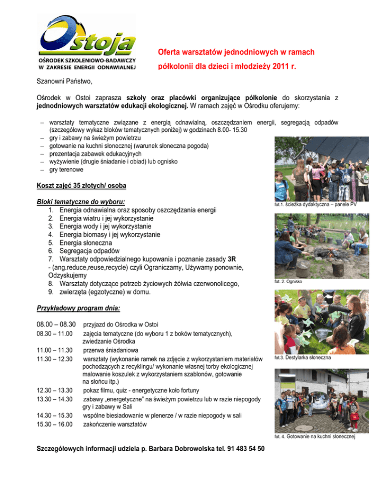 Oferta warsztatów jednodniowych w ramach półkolonii dla dzieci i młodzieży 2011 r. Szanowni Państwo, Ośrodek w Ostoi zaprasza szkoły oraz placówki organizujące półkolonie do skorzystania z jednodniowych warsztatów edukacji ekologicznej. W ramach zajęć w Ośrodku oferujemy: warsztaty tematyczne związane z energią odnawialną, oszczędzaniem energii, segregacją odpadów (szczegółowy wykaz bloków tematycznych poniżej) w godzinach 8.00- 15.30 gry i zabawy na świeżym powietrzu gotowanie na kuchni słonecznej (warunek słoneczna pogoda) prezentacja zabawek edukacyjnych wyżywienie (drugie śniadanie i obiad) lub ognisko gry terenowe Koszt zajęć 35 złotych/ osoba Bloki tematyczne do wyboru: 1. Energia odnawialna oraz sposoby oszczędzania energii 2. Energia wiatru i jej wykorzystanie 3. Energia wody i jej wykorzystanie 4. Energia biomasy i jej wykorzystanie 5. Energia słoneczna 6. Segregacja odpadów 7. Warsztaty odpowiedzialnego kupowania i poznanie zasady 3R - (ang.reduce,reuse,recycle) czyli Ograniczamy, Używamy ponownie, Odzyskujemy 8. Warsztaty dotyczące potrzeb życiowych żółwia czerwonolicego, 9. zwierzęta (egzotyczne) w domu. fot.1. ścieżka dydaktyczna – panele PV fot. 2. Ognisko Przykładowy program dnia: 08.00 – 08.30 przyjazd do Ośrodka w Ostoi 08.30 – 11.00 11.00 – 11.30 11.30 – 12.30 12.30 – 13.30 13.30 – 14.30 14.30 – 15.30 15.30 – 16.00 zajęcia tematyczne (do wyboru 1 z boków tematycznych), zwiedzanie Ośrodka przerwa śniadaniowa warsztaty (wykonanie ramek na zdjęcie z wykorzystaniem materiałów pochodzących z recyklingu/ wykonanie własnej torby ekologicznej malowanie koszulek z wykorzystaniem szablonów, gotowanie na słońcu itp.) pokaz filmu, quiz - energetyczne koło fortuny zabawy „energetyczne” na świeżym powietrzu lub w razie niepogody gry i zabawy w Sali wspólne biesiadowanie w plenerze / w razie niepogody w sali zakończenie warsztatów fot.3. Destylarka słoneczna fot. 4. Gotowanie na kuchni słonecznej Szczegółowych informacji udziela p. Barbara Dobrowolska tel. 91 483 54 50