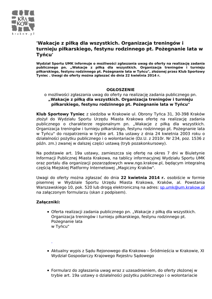 'Wakacje z piłką dla wszystkich. Organizacja treningów i turnieju piłkarskiego, festynu rodzinnego pt. Pożegnanie lata w Tyńcu' Wydział Sportu UMK informuje o możliwości zgłaszania uwag do oferty na realizację zadania publicznego pn. „Wakacje z piłką dla wszystkich. Organizacja treningów i turnieju piłkarskiego, festynu rodzinnego pt. Pożegnanie lata w Tyńcu", złożonej przez Klub Sportowy Tyniec . Uwagi do oferty można zgłaszać do dnia 22 kwietnia 2014 r. OGŁOSZENIE o możliwości zgłaszania uwag do oferty na realizację zadania publicznego pn. „Wakacje z piłką dla wszystkich. Organizacja treningów i turnieju piłkarskiego, festynu rodzinnego pt. Pożegnanie lata w Tyńcu" Klub Sportowy Tyniec z siedziba w Krakowie ul. Obrony Tyńca 31, 30-398 Kraków złożył do Wydziału Sportu Urzędu Miasta Krakowa ofertę na realizację zadania publicznego o charakterze regionalnym pn. „Wakacje z piłką dla wszystkich. Organizacja treningów i turnieju piłkarskiego, festynu rodzinnego pt. Pożegnanie lata w Tyńcu" do rozpatrzenia w trybie art. 19a ustawy z dnia 24 kwietnia 2003 roku o działalności pożytku publicznego i o wolontariacie (Dz.U. z 2010r. Nr 234, poz. 1536 z późn. zm.) zwanej w dalszej części ustawą (tryb pozakonkursowy). Na podstawie art. 19a ustawy, zamieszcza się ofertę na okres 7 dni w Biuletynie Informacji Publicznej Miasta Krakowa, na tablicy informacyjnej Wydziału Sportu UMK oraz portalu dla organizacji pozarządowych www.ngo.krakow.pl, będącym integralną częścią Miejskiej Platformy Internetowej „Magiczny Kraków". Uwagi do oferty można zgłaszać do dnia 22 kwietnia 2014 r. osobiście w formie pisemnej w Wydziale Sportu Urzędu Miasta Krakowa, Kraków, al. Powstania Warszawskiego 10, pok. 520 lub drogą elektroniczną na adres: [email protected] na załączonym formularzu (skan z podpisem). Załączniki: Oferta realizacji zadania publicznego pn. „Wakacje z piłką dla wszystkich. Organizacja treningów i turnieju piłkarskiego, festynu rodzinnego pt. Pożegnanie lata w Tyńcu" Aktualny wypis z Sądu Rejonowego dla Krakowa – Śródmieścia w Krakowie, XI Wydział Gospodarczy Krajowego Rejestru Sądowego Formularz do zgłaszania uwag wraz z uzasadnieniem, do oferty złożonej w trybie art. 19a ustawy o działalności pożytku publicznego i o wolontariacie Powered by TCPDF (www.tcpdf.org)