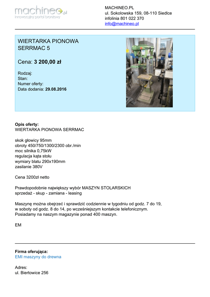 MACHINEO.PL ul. Sokolowska 159, 08-110 Siedlce infolinia 801 022 370 [email protected] WIERTARKA PIONOWA SERRMAC 5 Cena: 3 200,00 zł Rodzaj: Stan: Numer oferty: Data dodania: 29.08.2016 Opis oferty: WIERTARKA PIONOWA SERRMAC skok głowicy 95mm obroty 450/750/1300/2300 obr./min moc silnika 0,75kW regulacja kąta stołu wymiary blatu 290x190mm zasilanie 380V Cena 3200zł netto Prawdopodobnie największy wybór MASZYN STOLARSKICH sprzedaż - skup - zamiana - leasing Maszynę można obejrzeć i sprawdzić codziennie w tygodniu od godz. 7 do 19, w soboty od godz. 8 do 14, po wcześniejszym kontakcie telefonicznym. Posiadamy na naszym magazynie ponad 400 maszyn. EM Firma oferująca: EMI maszyny do drewna Adres: ul. Biertowice 256 MACHINEO.PL ul. Sokolowska 159, 08-110 Siedlce infolinia 801 022 370 [email protected] 32-440 Sułkowice