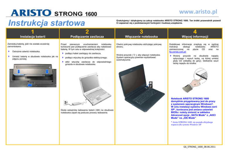 www.aristo.pl Gratulujemy i dziękujemy za zakup notebooka ARISTO STRONG 1600. Ten krótki przewodnik pozwoli Ci zapoznać się z podstawowymi funkcjami i budową budow urządzenia. Instrukcja startowa tartowa 1 2 3 4 Instalacja baterii Podłączanie ączanie zasilacza Włączanie notebooka Więcej informacji Zainstaluj baterię, jeśli nie została wcześniej zamontowana. Ostrożnie odwróć notebooka. Umieść baterię w obudowie notebooka jak na zdjęciu poniżej. Przed pierwszym uruchomieniem notebooka konieczne jest podłączenie ączenie zasilacza aby naładować baterię. W tym celu w odpowiedniej kolejno kolejności: podłącz cz kabel zasilaj zasilający do zasilacza, podłącz wtyczkęę do gniazdka elektrycznego, włóż wtyczkęę zasilacza do odpowiedniego gniazda w obudowie notebooka notebooka. Dioda wskaźnika nika ładowania baterii ( ) na obudowie notebooka zapali się ęp podczas procesu ładowania. Otwórz pokrywę notebooka odchylając pokrywę ekranu. Dodatkowe informacje znajdują się w ogólnej instrukcji obsługi notebooka ARISTO zamieszczonej na płycie CD oraz na ftp.comes.com.pl/ Wciśnij przycisk ( ), aby włączyć notebooka. System operacyjny powinien wystartować automatycznie. Wciśnij przycisk na obudowie napędu optycznego i wysuń tackę, na której umieść płytę CD (okładką do góry). Delikatnie wsuń tackę napędu do środka. Notebook ARISTO STRONG 1600 domyślnie przygotowany jest do pracy z systemem operacyjnym Windows7. W celu instalacji systemu Windows serii XP*, konieczna jest zmiana ustawień BIOSu: należy zmienić w zakładce Advanced opcje „SATA Mode” z „AHCI Mode” na „IDE Mode” * Aristo STRONG 1600 nie posiada oficjalnego wsparcia dla systemu Windows XP QS_STRONG_1600_08.06.2011 www.aristo.pl 1) 2) 3) 4) 5) 6) 7) 8) 9) Gniazdo zasilania Złącze VGA Porty USB Wyjście audio Wejście mikrofonu Czytnik kart chipowych Gniazdo Express Card 54/34 Gniazdo Kensington Lock Wylot powietrza 1) 2) 3) 4) 5) 6) 7) 8) 9) 10) Kamera Ekran LCD Włącznik Przycisk WLAN Klawiatura Touchpad Przyciski Touchpada Wskaźniki statusu zasilania Głośnik Mikrofon 1) Czytnik kart pamięci 4-in-1 2) Gniazdo karty SIM (opcja) 1) 2) 3) 4) 5) 6) 7) 8) Port IEEE 1394 (FireWire) Złącze szeregowe RS-232 Port USB Blokada napędu optycznego Napęd optyczny Przycisk otwierający napęd optyczny Złącze modemowe (RJ-11) Złącze sieciowe Ethernet (RJ-45) QS_STRONG_1600_08.06.2011