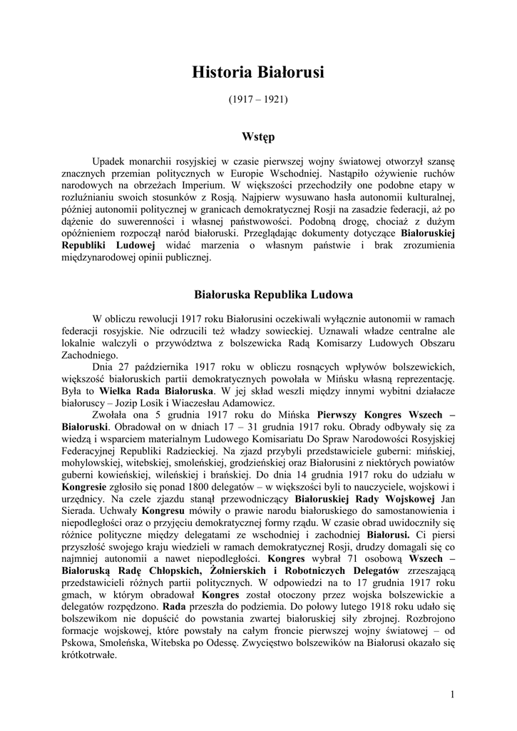 Historia Białorusi (1917 – 1921) Wstęp Upadek monarchii rosyjskiej w czasie pierwszej wojny światowej otworzył szansę znacznych przemian politycznych w Europie Wschodniej. Nastąpiło ożywienie ruchów narodowych na obrzeżach Imperium. W większości przechodziły one podobne etapy w rozluźnianiu swoich stosunków z Rosją. Najpierw wysuwano hasła autonomii kulturalnej, później autonomii politycznej w granicach demokratycznej Rosji na zasadzie federacji, aż po dążenie do suwerenności i własnej państwowości. Podobną drogę, chociaż z dużym opóźnieniem rozpoczął naród białoruski. Przeglądając dokumenty dotyczące Białoruskiej Republiki Ludowej widać marzenia o własnym państwie i brak zrozumienia międzynarodowej opinii publicznej. Białoruska Republika Ludowa W obliczu rewolucji 1917 roku Białorusini oczekiwali wyłącznie autonomii w ramach federacji rosyjskie. Nie odrzucili też władzy sowieckiej. Uznawali władze centralne ale lokalnie walczyli o przywództwa z bolszewicka Radą Komisarzy Ludowych Obszaru Zachodniego. Dnia 27 października 1917 roku w obliczu rosnących wpływów bolszewickich, większość białoruskich partii demokratycznych powołała w Mińsku własną reprezentację. Była to Wielka Rada Białoruska. W jej skład weszli między innymi wybitni działacze białoruscy – Jozip Losik i Wiaczesłau Adamowicz. Zwołała ona 5 grudnia 1917 roku do Mińska Pierwszy Kongres Wszech – Białoruski. Obradował on w dniach 17 – 31 grudnia 1917 roku. Obrady odbywały się za wiedzą i wsparciem materialnym Ludowego Komisariatu Do Spraw Narodowości Rosyjskiej Federacyjnej Republiki Radzieckiej. Na zjazd przybyli przedstawiciele guberni: mińskiej, mohylowskiej, witebskiej, smoleńskiej, grodzieńskiej oraz Białorusini z niektórych powiatów guberni kowieńskiej, wileńskiej i brańskiej. Do dnia 14 grudnia 1917 roku do udziału w Kongresie zgłosiło się ponad 1800 delegatów – w większości byli to nauczyciele, wojskowi i urzędnicy. Na czele zjazdu stanął przewodniczący Białoruskiej Rady Wojskowej Jan Sierada. Uchwały Kongresu mówiły o prawie narodu białoruskiego do samostanowienia i niepodległości oraz o przyjęciu demokratycznej formy rządu. W czasie obrad uwidoczniły się różnice polityczne między delegatami ze wschodniej i zachodniej Białorusi. Ci piersi przyszłość swojego kraju wiedzieli w ramach demokratycznej Rosji, drudzy domagali się co najmniej autonomii a nawet niepodległości. Kongres wybrał 71 osobową Wszech – Białoruską Radę Chłopskich, Żołnierskich i Robotniczych Delegatów zrzeszającą przedstawicieli różnych partii politycznych. W odpowiedzi na to 17 grudnia 1917 roku gmach, w którym obradował Kongres został otoczony przez wojska bolszewickie a delegatów rozpędzono. Rada przeszła do podziemia. Do połowy lutego 1918 roku udało się bolszewikom nie dopuścić do powstania zwartej białoruskiej siły zbrojnej. Rozbrojono formacje wojskowej, które powstały na całym froncie pierwszej wojny światowej – od Pskowa, Smoleńska, Witebska po Odessę. Zwycięstwo bolszewików na Białorusi okazało się krótkotrwałe. 1 Dnia 18 lutego 1918 roku rozpoczęła się ofensywa niemiecka. Miała ona wymusić na Rosji przystąpienie do rozmów pokojowych. W ciągu kilku dni Mińsk i większość ziem białoruskich znalazła się pod okupacją niemiecką. Stolica przed wejściem Niemców została wyzwolona przez Polaków i Białorusinów, którzy podzielili ją między siebie. Władze bolszewickie uciekły. Ten stan został potwierdzony w postanowieniach traktatu brzeskiego. Zgodnie z decyzją Komitetu Wykonawczego Rady Pierwszego Kongresu Wszech – Białoruskiego został powołany do życia 21 lutego 1918 roku organ wykonawczy Ludowy Sekretariat Białorusi. Informował o tym pierwszy akt ustawodawczy „Hramota do narodu białoruskiego”. Na jego czele stanął Jozip Waronka. W lipcu 1918 roku zastąpił go Roman Skirmunt. Sekretariat był pierwszym rządem niepodległej Białorusi ale nie został uznany przez żadne państwo europejskie. Później (w październiku 1918 roku) został przekształcony w Radę Ministrów. W marcu 1918 roku pokój brzeski podzielił Białoruś. Niemcy zatrzymali północno – wschodnią część kraju, którą zajęli przed ofensywą lutową. Pozostała część ziem białoruskich miała być przez nich okupowana do czasu wpłacenia kontrybucji a następnie miała wrócić do Rosji. W czasie rokowań całkowicie zignorowano działaczy białoruskich. Członkowie Sekretariatu (ministrowie): Jazep Waronka – przewodniczący, sprawy zagraniczne, Arkadź Smolicz – oświata, Jan Sierada – gospodarka, Pałuta Badunowa – opieka społeczna, Piotra Kreczeuski – kontrola, Kastuś Jezawitau – sprawy wojskowe, M. Gutman – sekretarz do spraw żydowskich. Dnia 25 marca 1918 roku powstaje pierwsze w historii formalnie niepodległe państwo białoruskie. Przyjmuje ono nazwę Białoruska Republika Ludowa. Jego powstanie zostało obwieszczone w Mińsku Litewskim a niezależność zostaje ogłoszona przy pomocy Cesarstwa Niemiec. Nowe państwo nie posiadało własnej armii. Białoruska Republika Ludowa rościła sobie prawo do terytoriów byłych guberni Cesarstwa Rosyjskiego – mińskiej, mohylewskiej, witebskiej, smoleńskiej, grodzieńskiej, wileńskiej, części guberni kowieńskiej, chełmskiej i wołyńskiej. Te dwa ostatnie obszary zamieszkałe były w większości przez Ukraińców. Państwem kierowała demokratycznie wybrana Rada Białoruskiej Republiki Ludowej, której prezydent pełnił formalnie funkcję głowy państwa. Pierwszym prezydentem został Jan Sierada, który kierował Radą od marca do czerwca 1918 roku. Po nim przewodnictwo objął Jozep Losik, który od stycznia 1919 roku działał na emigracji. Powołano rząd Białoruskiej Republiki Ludowej (na zdjęciu jego pierwszy skład). Gabinetem kierował premier. Rada energicznie przystąpi