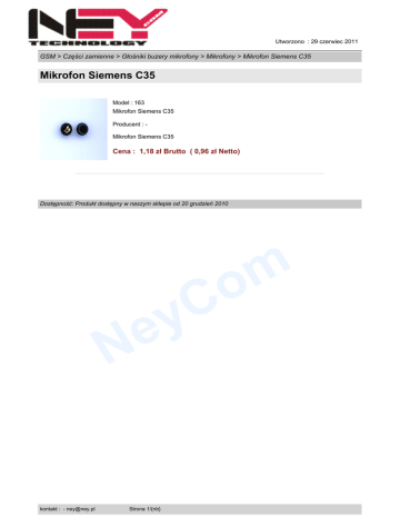 Utworzono : 29 czerwiec 2011 GSM > Części zamienne > Głośniki buzery mikrofony > Mikrofony > Mikrofon Siemens C35 Mikrofon Siemens C35 Model : 163 Mikrofon Siemens C35 Producent : Mikrofon Siemens C35 Cena : 1,18 zł Brutto ( 0,96 zł Netto) Dostępność: Produkt dostępny w naszym sklepie od 20 grudzień 2010 C y m o e N kontakt : - [email protected] Strona 1/{nb}