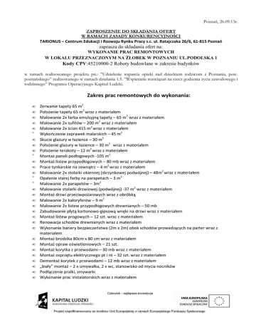 Poznań, 26.09.13r. ZAPROSZENIE DO SKŁADANIA OFERT W RAMACH ZASADY KONKURENCYJNOŚCI TARIONUS – Centrum Edukacji i Rozwoju Rynku Pracy s.c. ul. Ratajczaka 26/6, 61-815 Poznań zaprasza do składania ofert na: WYKONANIE PRAC REMONTOWYCH W LOKALU PRZEZNACZONYM NA śŁOBEK W POZNANIU UL.PODOLSKA 1 Kody CPV:45210000-2 Roboty budowlane w zakresie budynków w ramach realizowanego projektu pn.: ”Udzielenie wsparcia opieki nad dzieckiem rodzicom z Poznania, pow. poznańskiego” realizowanego w ramach działania 1.5. ”Wspieranie rozwiązań na rzecz godzenia Ŝycia zawodowego i rodzinnego” Programu Operacyjnego Kapitał Ludzki. Zakres prac remontowych do wykonania: • • • • • • • • • • • • • • • • • • • • • • • • • • • • • • • Zerwanie tapety 65 m2 Położenie tapety 65 m2 wraz z materiałem Malowanie 2x farba emulsyjną tapety – 65 m2 wraz z materiałem Malowanie 2x sufitów – 200 m2 wraz z materiałem Malowanie 2x ścian 415 m2 wraz z materiałem Wykończenie zaprawek malarskich – 45 m2 Skucie glazury w łazience – 30 m2 Położenie glazury w łazience – 30 m2 wraz z materiałem Położenie terakoty – 12 m2 wraz z materiałem Montaż paneli podłogowych -105 m2 Montaż listew przypodłogowych – 80 mb wraz z materiałem Prace tynkarskie na zewnątrz – 4 m2 wraz z materiałem Malowanie 2x stolarki okiennej (skrzynkowej podwójnej) – 48m2 wraz z materiałem Opalenie starej farby na parapetach – 3 m2 Malowanie 2x parapetów – 3m2 Malowanie stolarki drzwiowej (podwójnej) -37 m2 wraz z materiałem Montaż drzwi przeciwpożarowych wraz z obróbką Malowanie 2x kaloryferów – 9 m2 Malowanie 2x listew przypodłogowych drewnianych – 50 mb Zabudowanie płytą kartonowo-gipsową wnęki na drzwi wraz z materiałem Montaż listew progowych – 12 szt. wraz z materiałem Renowacja schodów drewnianych wraz z materiałem Wykonanie bariery bezpieczeństwa (2m x 2m) obok schodów prowadzących na parter wraz z materiałem Montaż brodzika 80cm x 80 cm wraz z materiałem Montaż opraw oświetleniowych – 21 szt. Montaż korytka z przewodami – 30 mb wraz z materiałem Montaż osprzętu elektrycznego pt i nt – 32 szt. wraz z materiałem Demontaż korytek z przewodami – 12 mb wraz z materiałem „biały” montaż – 2 x umywalka, 2 x wc, stanowisko od mycia nocników Podłączenie pralki, zmywarki Wykonanie prac instalatorskich wraz z materiałem Remont wykonany będzie w Poznaniu ul.PODOLSKA 1 . Termin realizacji – do 31.12.2013. ZłoŜona oferta musi zawierać: 1. nazwę oferenta 2. oferowaną cenę brutto za wykonanie pełnego zakresu prac remontowych 3. oświadczenie o braku występowania powiązań – zał. nr 1 do zapytania Zamawiający nie dopuszcza moŜliwości składania ofert częściowych. Oferty naleŜy składać w terminie do 16.10.2013r. na adres TARIONUS – Centrum Edukacji i Rozwoju Rynku Pracy s.c. ul. Ratajczaka 26/6, 61-815 Poznań Wybór najkorzystniejszej oferty nastąpi w oparciu o następujące kryterium – łączna cena wykonania ww zakresu prac remontowych z wagą 100 %. Punkty przyznawane za podane kryterium będą liczone wg. następującego wzoru: liczba punktów = (Cmin/Cof) x 100 x waga ; gdzie: Cmin oznacza najniŜszą cenę spośród wszystkich ofert, Cof oznacza cenę podaną w ofercie.