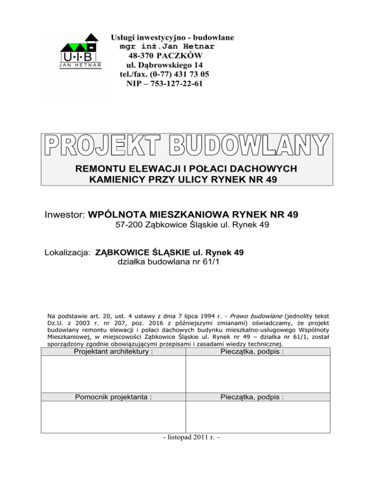 Usługi inwestycyjno - budowlane mgr inŜ.Jan Hetnar 48-370 PACZKÓW ul. Dąbrowskiego 14 tel./fax. (0-77) 431 73 05 -IP – 753-127-22-61 REMONTU ELEWACJI I POŁACI DACHOWYCH KAMIENICY PRZY ULICY RYNEK NR 49 Inwestor: WPÓLNOTA MIESZKANIOWA RYNEK NR 49 57-200 Ząbkowice Śląskie ul. Rynek 49 Lokalizacja: ZĄBKOWICE ŚLĄSKIE ul. Rynek 49 działka budowlana nr 61/1 Na podstawie art. 20, ust. 4 ustawy z dnia 7 lipca 1994 r. - Prawo budowlane (jednolity tekst Dz.U. z 2003 r. nr 207, poz. 2016 z późniejszymi zmianami) oświadczamy, że projekt budowlany remontu elewacji i połaci dachowych budynku mieszkalno-usługowego Wspólnoty Mieszkaniowej, w miejscowości Ząbkowice Śląskie ul. Rynek nr 49 – działka nr 61/1, został sporządzony zgodnie obowiązującymi przepisami i zasadami wiedzy technicznej. Projektant architektury : Pieczątka, podpis : Pomocnik projektanta : Pieczątka, podpis : - listopad 2011 r. – OPIS TECHNICZNY 1.0 WSTĘP 1.1 Przedmiot opracowania Przedmiotem opracowania jest projekt remontu elewacji i połaci dachowych budynku mieszkalnego, należącego do Wspólnoty Mieszkaniowej Rynek 49, położonego w miejscowości Ząbkowice Śląskie ul. Rynek 49, na działce nr 61/1 1.2 Podstawa opracowania Podstawą opracowania jest zlecenie inwestora oraz materiały wstępne przekazane przez inwestora i zebrane z innych źródeł, a w szczególności: - wizja lokalna przeprowadzona na obiekcie - inwentaryzacja elewacji budynku wykonana przez zespół projektowy wykonawcy zlecenia, w zakresie niezbędnym do opracowania projektu - dokumentacja fotograficzna 1.3 Cel opracowania Celem opracowania jest podanie rozwiązań architektonicznych i technologicznych dla remontu trzech elewacji budynku oraz dwóch połaci dachu 2-spadowego o konstrukcji drewnianej, pokrytego dachówką. 2.0 OPIS OGÓLNY 2.1 Lokalizacja Budynek położony jest w centrum miasta Ząbkowice Śląskie, w centralnej grupie budynków środkowej pierzei Rynku, w jej północno zachodnim narożu. Granice działki przebiegają po obrysie ścian zewnętrznych budynku. Jest to działka z bardzo niewielkim pochyleniem w kierunku wschodnim – jest to teren prawie płaski. Kamienica ta położona jest w obrębie strefy „A”, tj. strefy objętej ścisłą ochroną konserwatorską układów architektonicznych. Działania konserwatorskie w tej strefie zmierzają do zachowania i uczytelnienia historycznego układu przestrzennego i konserwacji jego głównych elementów: rozplanowania i przebiegu głównych ciągów komunikacyjnych, kompozycji wnętrz urbanistycznych, historycznych linii zabudowy, kompozycji układów zieleni zabytkowej oraz historycznych podziałów własnościowych i sposobu użytkowania gruntów. Wszelka działalność inwestycyjna, budowlana, jak również przebudowy, remonty, adaptacje, dostosowanie współczesnych funkcji czy podziały nieruchomości znajdujących się w obszarze tej strefy wymagają uzgodnienia z Dolnośląskim Wojewódzkim Konserwatorem Zabytków Delegatura Wojewódzkiego Oddziału Urzędu Ochrony Zabytków w Wałbrzychu. 2.2 Opis ogólny budynku Budynek nr 49, położony w Rynku Ząbkowic Śląskich, wybudowany został przypuszczalnie w I połowie XV wieku, przebudowany później wielokrotnie – ostatni raz pod koniec XVIII lub na początku XIX wieku. Był to okres intensywnego rozwoju miasta, zniszczonego w XVI wieku w czasie najazdu szwedzkiego oraz w czasie pożaru zabudowań Rynku w 1858 r., po którym pozostały tylko 3 budynki nadające się do zamieszkania. W latach późniejszych budynek ten był wielokrotnie adaptowany do bieżących potrzeb, w obiekcie wykonywano roboty adaptacyjne i remontowe. W załączeniu pokazano zdjęcia 2 elewacji budynku. Pierwsze z nich wykonano po roku 1930, drugie jest zdjęciem wcześniejszym. Nie ma na nim spiralnego zdobienia w pasie poziomym, między gzymsami pod okapem dachu, prostokątów żłobionych w tynku cyklinowanym, z krętymi liniami boków, ani też detali o kształcie kwiatów w wazonach. Na obecnych elewacjach istnieje zdobienie pokazane na zdjęciu nr 1, tj. wykonanym po roku 1930. Część detali została zniszczona lub uszkodzona. Projekt remontu elewacji przewiduje ich odtworzenie do wyglądu zbliżonego do istniejącego w latach 30-tych ubiegłego stulecia. Budynek wybudowano na podstawie prostokąta wydłużonego w kierunkach północ-południe. Jest to budynek 2-piętrowy, ze ściankami kolankowymi w poddaszu i prostym, drewnianym dachem 2-spadkowym, pokrytym dachówką. W masywnych, murowanych z cegły ścianach zewnętrznych osadzono podwójne okna drewniane, skrzynkowe, czterodzielne. W ścianach podłużnych okna w układzie 5-traktowym, w ścianie szczytowej w układzie 2-traktowym. Okna te wymieniono w dużej części na okna z profili plastikowych. Kształt części parterowej zmieniono przez ścięcie narożnika północno-zachodniego. W otworze utworzonego skosu zamontowano bankomat. Pozostałą część parteru przeznaczono na wydzielenie lokali handlowo-usługowych oraz korytarza i klatki schodowej dla wejścia na wyższe kondygnacje. W ścianie podłużnej zachodniej osadzono szerokie witryny i drzwi wejściowe do lokalu. Ustalony w górnych kondygnacjach porządek w układzie otworów okiennych w parterze nie został zachowany. Wielkość i układ wejść oraz witryn był wielokrotnie zmieniany, zależnie od potrzeb użytkowników wydzielanych w parterze lokali. W ścianie wschodniej istnieją w parterze i na piętrach okna drewniane skrzynkowe, tylko część okien na I piętrze wymieniono na plastikowe. W parterze między oknami istnieją także drzwi wejściowe – drewniane, płycinowe. Od wewnątrz otwory okienne w parterze zostały zabudowane i są obecnie zbędne – wskazane jest zamurowanie okien i drzwi również od zewnątrz. 3. OCENA STANU TECHNICZNEGO Bryła budynku masywna, zwarta, statycznie stabilna, nie wykazuje żadnych niebezpiecznych uszkodzeń, które mogłyby zagrażać bezpiecze