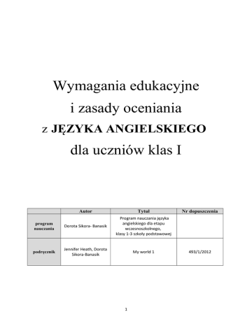 Wymagania edukacyjne i zasady oceniania z JĘZYKA ANGIELSKIEGO dla uczniów klas I Autor Tytuł program nauczania Dorota Sikora- Banasik Program nauczania języka angielskiego dla etapu wczesnoszkolnego, klasy 1-3 szkoły podstawowej podręcznik Jennifer Heath, Dorota Sikora-Banasik My world 1 1 Nr dopuszczenia 493/1/2012 ZASADY OCENIANIA poziom umiejętności i wiadomości bardzo wysoki przeliczenie punktów wg skali procentowej informacja dla ucznia ocena informacja dla nauczyciela 100% - 92% znakomicie, świetnie, brawo, wspaniale wysokie umiejętności zna, wie, potrafi zastosować, jest samodzielny wysoki 91% - 79% dobrze, poprawnie, bardzo ładnie średni 78% - 53% przeciętnie, zadowalająco, nieźle niski 52% - 31% słabo bardzo niski 30% bardzo słabo, źle dobrze opanowane umiejętności z niewielkimi błędami popełnia błędy, myli się, pracuje samodzielnie średnio opanowane umiejętności wie, ale potrzebuje wsparcia i niewielkiej pomocy nauczyciela duże braki w umiejętnościach nie opanował podstawowych umiejętności i wiadomości, pracuje z pomocą nauczyciela uczeń niewiele potrafi, konieczna jest pomoc nie zna materiału, nie radzi sobie nawet przy pomocy nauczyciela WYMAGANIA EDUKACYJNE Kryteria oceniania wiedzy i umiejętności poziom bardzo wysoki • • • • • • • • • • • Wykazuje zainteresowanie językiem angielskim. Posiada wiadomości i umiejętności wykraczające poza program nauczania języka angielskiego. Samodzielnie, aktywnie i chętnie posługuje się zdobytą wiedzą i umiejętnościami. Bezbłędnie posługuje się poznanym słownictwem. Rozumie i wykonuje wszystkie polecenia nauczyciela. Śpiewa poznane piosenki i recytuje wiersze (rymowanki). Prawidłowo czyta wyrazy i proste zdania. Potrafi odwzorować, przepisać, napisać z pamięci pojedyncze wyrazy i zdania. Potrafi odpowiedzieć na pytanie, samodzielnie formułować proste wypowiedzi. Systematycznie i rzetelnie przygotowuje prace domowe. Korzysta z dodatkowych źródeł informacji i dzieli się nimi na zajęciach. poziom wysoki • Dobrze opanował wiadomości i umiejętności objęte programem nauczania języka angielskiego. • Dobrze posługuje się poznanym słownictwem. • Prawidłowo rozumie i wykonuje polecenia nauczyciela. • Zna większość poznanych piosenek i wierszy. • Czyta wyrazy i proste zdania, popełniając nieliczne błędy. • Zwykle bezbłędnie odwzorowuje, przepisuje, pisze z pamięci pojedyncze wyrazy i zdania. • Zazwyczaj potrafi formułować proste wypowiedzi. • Systematycznie odrabia prace domowe 3 JĘZYK ANGIELSKI klasa I WYMAGANIA EDUKACYJNE poziom średni • • • • • • • • • Poprawnie opanował wiadomości i umiejętności objęte programem nauczania języka angielskiego. Ma niewielkie problemy z samodzielnym, poprawnym sformułowaniem prostej wypowiedzi. Czasami nie rozumie poleceń nauczyciela i korzysta z jego pomocy. Zna tylko niektóre piosenki i wiersze. Czyta w wolnym tempie, pojedyncze wyrazy. Odwzorowuje, przepisuje, pisze z błędami. Pisząc z pamięci popełnia błędy. Czasem myli poznane słowa. Najczęściej odrabia praca domowe poziom niski • Z trudem opanowuje wiadomości i umiejętności objęte programem nauczania języka angielskiego. • Nie potrafi samodzielnie sformułować prostego zdania (wypowiedzi), robi to tylko z pomocą nauczyciela lub rówieśnika. • Ma trudności ze zrozumieniem prostych poleceń. • Często myli poznane słowa • Z trudem zapamiętuje i odtwarza poznane piosenki i wiersze. • Czyta w bardzo wolnym tempie, popełniając liczne błędy. • Ma trudności z odwzorowaniem i przepisaniem krótkich wyrazów. • Rzadko odrabia prace domowe. 4 JĘZYK ANGIELSKI klasa I WYMAGANIA EDUKACYJNE poziom bardzo niski • • • • • • • • Nie opanował wiadomości i umiejętności objętych programem nauczania języka angielskiego. Nie posługuje się poznanym słownictwem. Nie rozumie i nie wykonuje prostych poleceń nauczyciela. Czyta popełniając bardzo dużo błędów. Pisanie sprawia mu duże trudności. Wykazuje zupełny brak umiejętności wypowiadania się. Nie odrabia prac domowych. Nie śpiewa poznanych piosenek. 5 JĘZYK ANGIELSKI klasa I