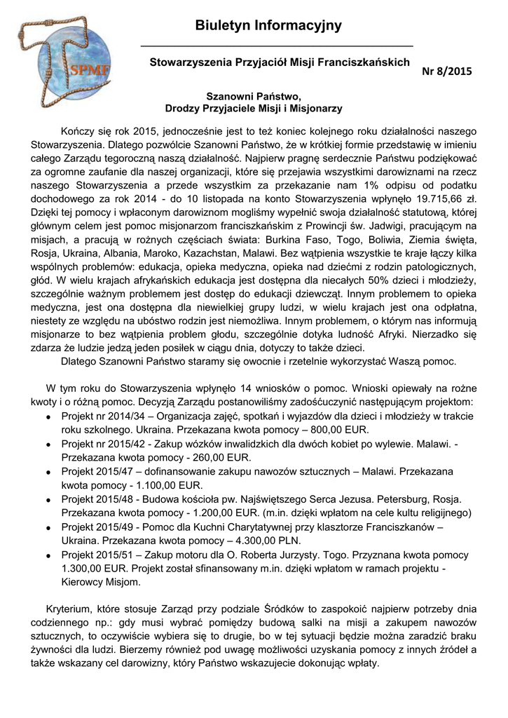 Biuletyn Informacyjny _________________________________________ Stowarzyszenia Przyjaciół Misji Franciszkańskich Nr 8/2015 Szanowni Państwo, Drodzy Przyjaciele Misji i Misjonarzy Kończy się rok 2015, jednocześnie jest to też koniec kolejnego roku działalności naszego Stowarzyszenia. Dlatego pozwólcie Szanowni Państwo, że w krótkiej formie przedstawię w imieniu całego Zarządu tegoroczną naszą działalność. Najpierw pragnę serdecznie Państwu podziękować za ogromne zaufanie dla naszej organizacji, które się przejawia wszystkimi darowiznami na rzecz naszego Stowarzyszenia a przede wszystkim za przekazanie nam 1% odpisu od podatku dochodowego za rok 2014 - do 10 listopada na konto Stowarzyszenia wpłynęło 19.715,66 zł. Dzięki tej pomocy i wpłaconym darowiznom mogliśmy wypełnić swoja działalność statutową, której głównym celem jest pomoc misjonarzom franciszkańskim z Prowincji św. Jadwigi, pracującym na misjach, a pracują w rożnych częściach świata: Burkina Faso, Togo, Boliwia, Ziemia święta, Rosja, Ukraina, Albania, Maroko, Kazachstan, Malawi. Bez wątpienia wszystkie te kraje łączy kilka wspólnych problemów: edukacja, opieka medyczna, opieka nad dziećmi z rodzin patologicznych, głód. W wielu krajach afrykańskich edukacja jest dostępna dla niecałych 50% dzieci i młodzieży, szczególnie ważnym problemem jest dostęp do edukacji dziewcząt. Innym problemem to opieka medyczna, jest ona dostępna dla niewielkiej grupy ludzi, w wielu krajach jest ona odpłatna, niestety ze względu na ubóstwo rodzin jest niemożliwa. Innym problemem, o którym nas informują misjonarze to bez wątpienia problem głodu, szczególnie dotyka ludność Afryki. Nierzadko się zdarza że ludzie jedzą jeden posiłek w ciągu dnia, dotyczy to także dzieci. Dlatego Szanowni Państwo staramy się owocnie i rzetelnie wykorzystać Waszą pomoc. W tym roku do Stowarzyszenia wpłynęło 14 wniosków o pomoc. Wnioski opiewały na rożne kwoty i o różną pomoc. Decyzją Zarządu postanowiliśmy zadośćuczynić następującym projektom: Projekt nr 2014/34 – Organizacja zajęć, spotkań i wyjazdów dla dzieci i młodzieży w trakcie roku szkolnego. Ukraina. Przekazana kwota pomocy – 800,00 EUR. Projekt nr 2015/42 - Zakup wózków inwalidzkich dla dwóch kobiet po wylewie. Malawi. Przekazana kwota pomocy - 260,00 EUR. Projekt 2015/47 – dofinansowanie zakupu nawozów sztucznych – Malawi. Przekazana kwota pomocy - 1.100,00 EUR. Projekt 2015/48 - Budowa kościoła pw. Najświętszego Serca Jezusa. Petersburg, Rosja. Przekazana kwota pomocy - 1.200,00 EUR. (m.in. dzięki wpłatom na cele kultu religijnego) Projekt 2015/49 - Pomoc dla Kuchni Charytatywnej przy klasztorze Franciszkanów – Ukraina. Przekazana kwota pomocy – 4.300,00 PLN. Projekt 2015/51 – Zakup motoru dla O. Roberta Jurzysty. Togo. Przyznana kwota pomocy 1.300,00 EUR. Projekt został sfinansowany m.in. dzięki wpłatom w ramach projektu Kierowcy Misjom. Kryterium, które stosuje Zarząd przy podziale Śródków to zaspokoić najpierw potrzeby dnia codziennego np.: gdy musi wybrać pomiędzy budową salki na misji a zakupem nawozów sztucznych, to oczywiście wybiera się to drugie, bo w tej sytuacji będzie można zaradzić braku żywności dla ludzi. Bierzemy również pod uwagę możliwości uzyskania pomocy z innych źródeł a także wskazany cel darowizny, który Państwo wskazujecie dokonując wpłaty. Szanowni Państwo ta pomoc w postaci zrealizowanych projektów była możliwa tylko dzięki Waszej ofiarności i Waszej pomocy. W imieniu Zarządu Stowarzyszenia Przyjaciół Misji Franciszkańskich im. O. Dominika Kiescha składam serdeczne słowa podziękowania. Myślę że będę też wyrazicielem podziękowań od misjonarzy i ludzi, wśród których pracują. W imieniu wszystkich członków Stowarzyszenia a także misjonarzy życzę wszystkiego dobrego Wam i Waszym Bliskim na nadchodzące Święta Bożego Narodzenia, oraz wielu sukcesów w życiu zawodowym i osobistym w Nowym Roku 2016 Z wyrazami szacunku Karol Gawlik Przewodniczący Stowarzyszenia Szanowni Państwo, 8 grudnia rozpoczęliśmy szczególny rok w Kościele – Rok Miłosierdzia. W Orędziu na Światowy Dzień Misyjny w 2015 r. Papież Franciszek napisał między innymi: „Na ogromnej przestrzeni misyjnej działalności Kościoła każdy wierzący jest wezwany, by jak najlepiej przeżywał swoje zaangażowanie wynikające z chrztu, zgodnie ze swoją osobistą sytuacją życiową". Odpowiadając na wezwanie Papieża włączajmy się w dzieło pomocy misjom na ile możemy, na ile potrafimy: poprzez modlitwy i ofiary. Dziękując Wszystkim Darczyńcom za ofiarną współpracę ze Stowarzyszeniem a także za duchowe towarzyszenie misjonarzom w ich posłudze, proszę o dalszą życzliwość i wsparcie, w miarę możliwości, któregoś z poniższych projektów misyjnych: Projekty, które w tym roku zostały odłożone z powodu braku środków na ich realizację: Projekt nr 2015/40 - Pomoc w zakupie książek i przyborów szkolnych dla dzieci ze szkoły Św. Antoniego - Tarnopol, Ukraina. Projekt nr 2015/41 - Pomoc w zakupie 30 ławek dla szkoły podstawowej w Mtenthera. Malawi. Projekt nr 2015/43 - Pomoc w zakupie produktów żywnościowych, dofinansowanie transportu, zakup koców i ubrań dla migrantów afrykańskich obecnych w Maroku. Projekt nr 2015/44 - Pomoc w odnowieniu sali parafialnej. Malawi. Projekt nr 2015/45 - Dofinansowanie budowy kościoła w stacji misyjnej w Mtethera. Malawi. Projekt nr 2015/46 - Dofinansowanie remontu kościoła w stacji misyjnej w Malawi. Szczególnej uwadze polecamy dwa projekty: 1. Projekt 2015/50 - Budowa studni. Jest to nowy projekt z tzw. oddolnej inicjatywy. Latem gościliśmy na Górze Św. Anny misjonarza z Burkina Faso – O. Rafała Segieth OFM. W czasie spotkania z osobami, które uczestniczą w projekcie edukacyjnym Adopcja na odległość: „Dać im nadzieję” O. Rafał d